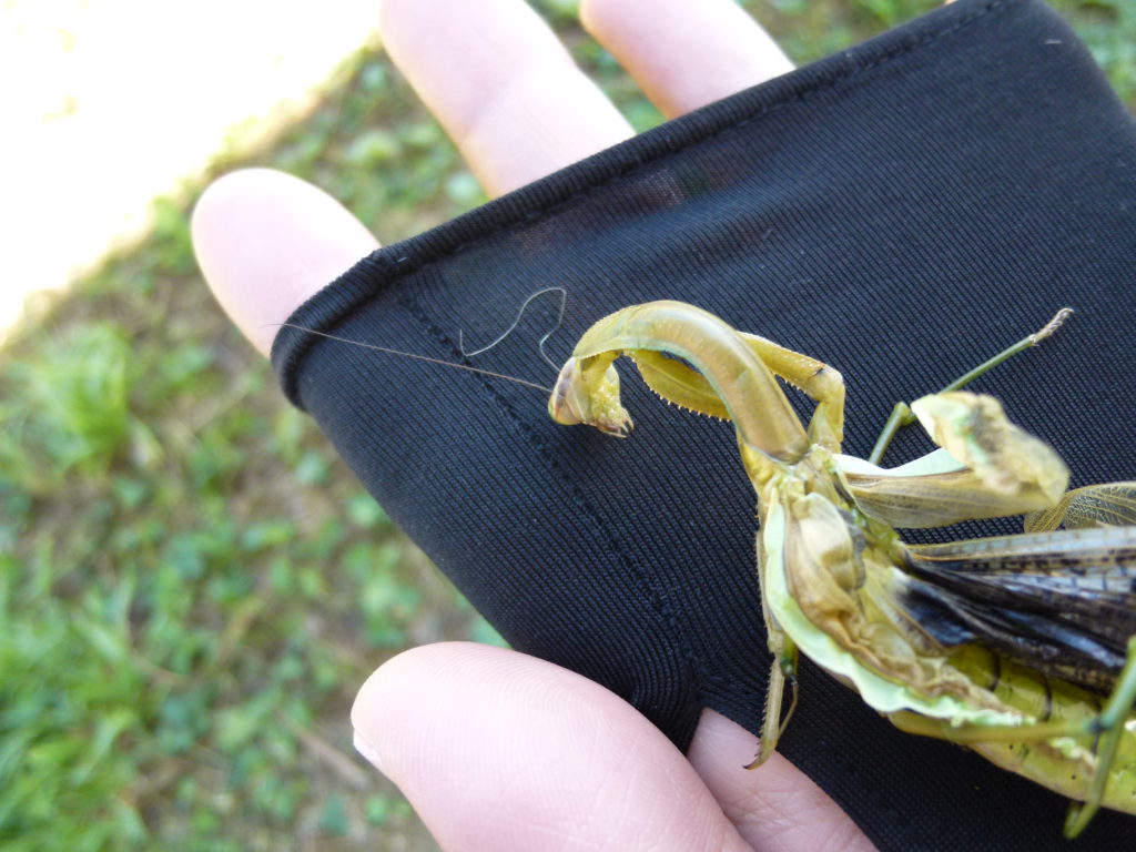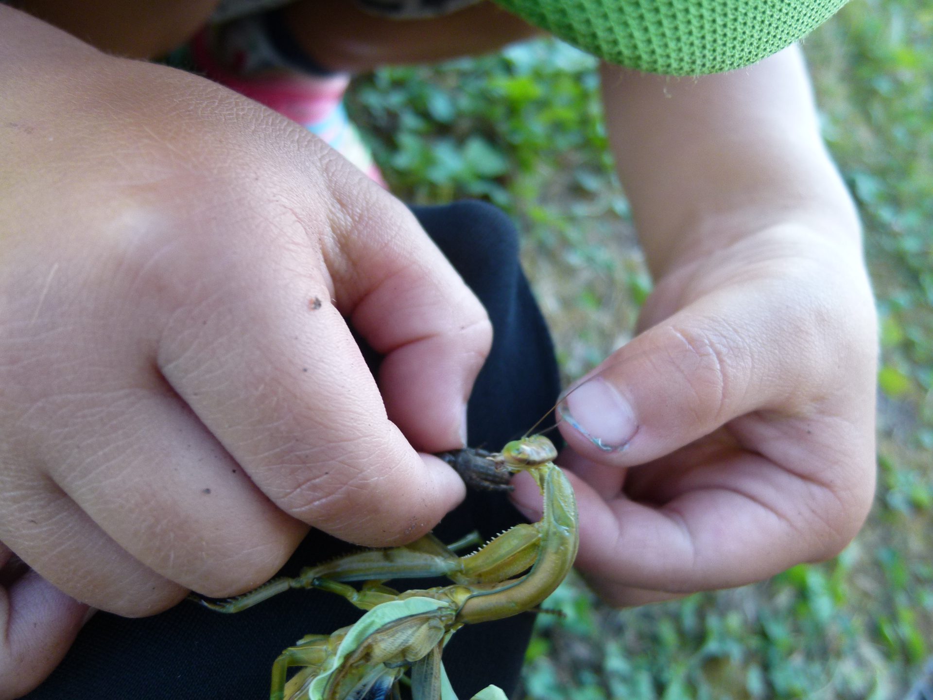 カマキリの口に合うくらいで小さいバッタを捕まえてカマキリの口元へそっと置いてあげる姿が。