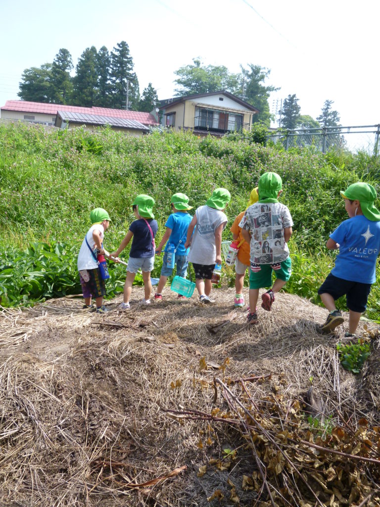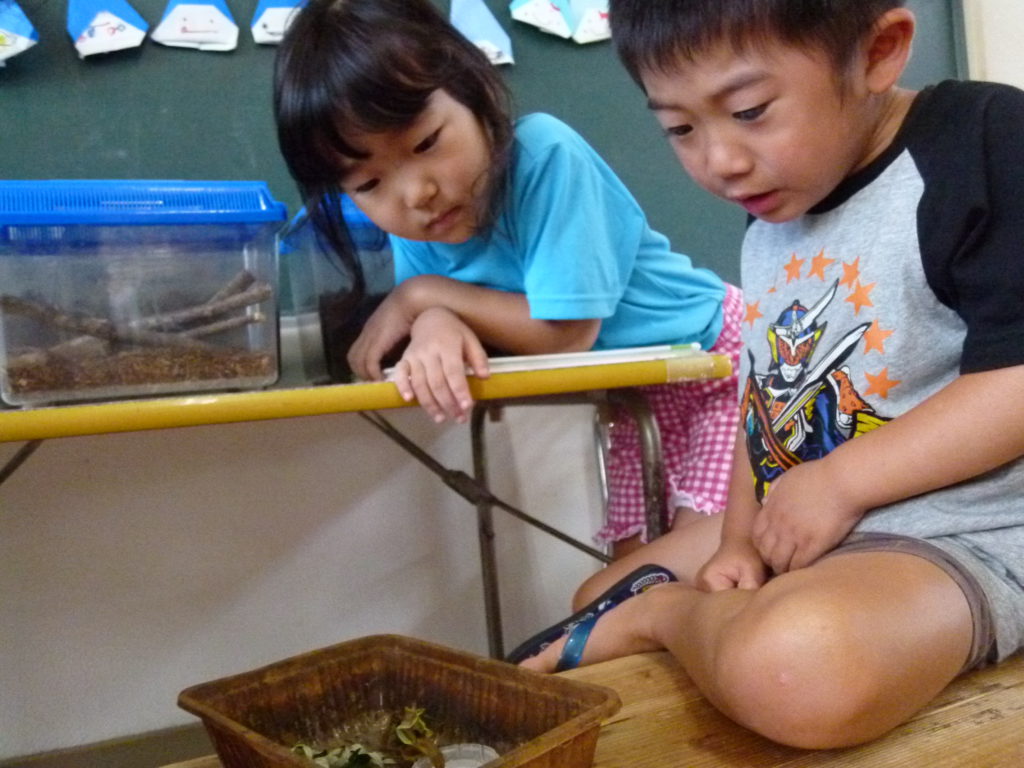 お部屋にはカブトムシやクワガタ、カタツムリがいます。生き物たちをよく見たり世話をしたりと子どもたち自ら進んで行うことで愛着が湧き、子どもたちの中で大切にしようという意識が芽生えて来ています。また、年長さんから虫の持ち方や世話の仕方など教えてもらったことなどを他の友だちにも伝え合う姿も見られました。