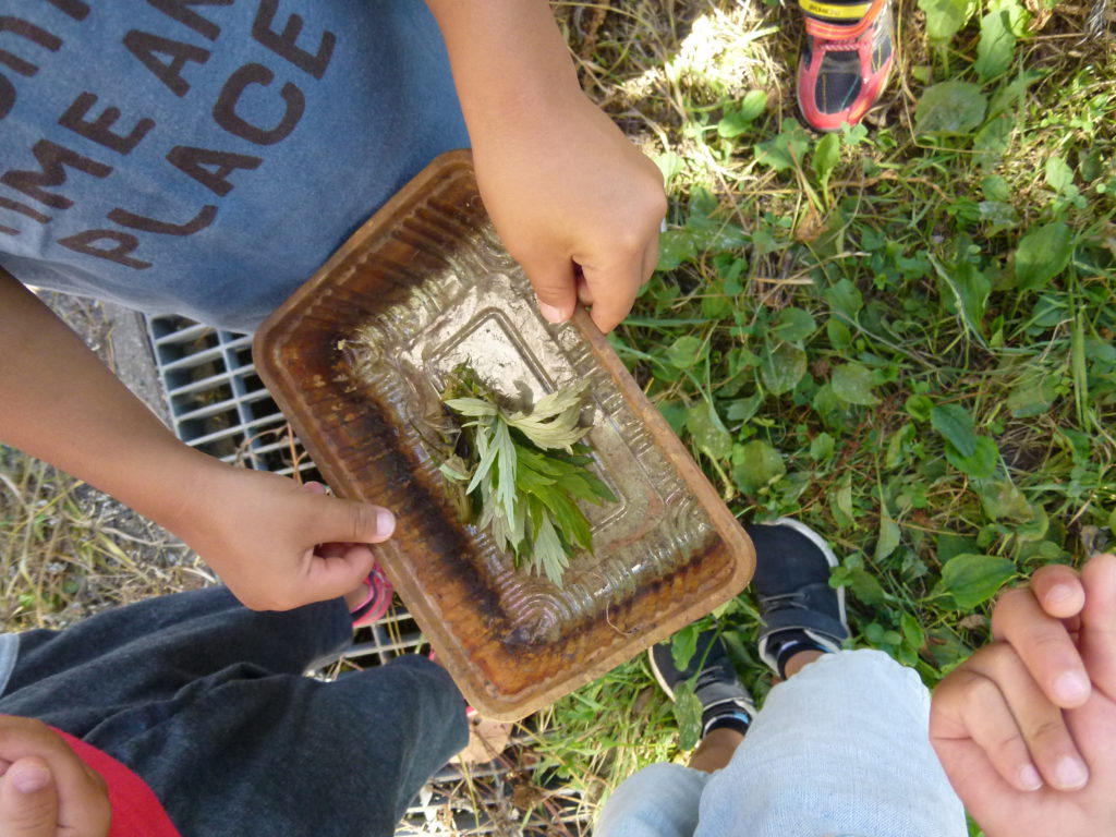 そして、虫かごに入れるとかわいそうだからとプラスチックの容器に草を敷いてそっとその上に置いてあげることに。