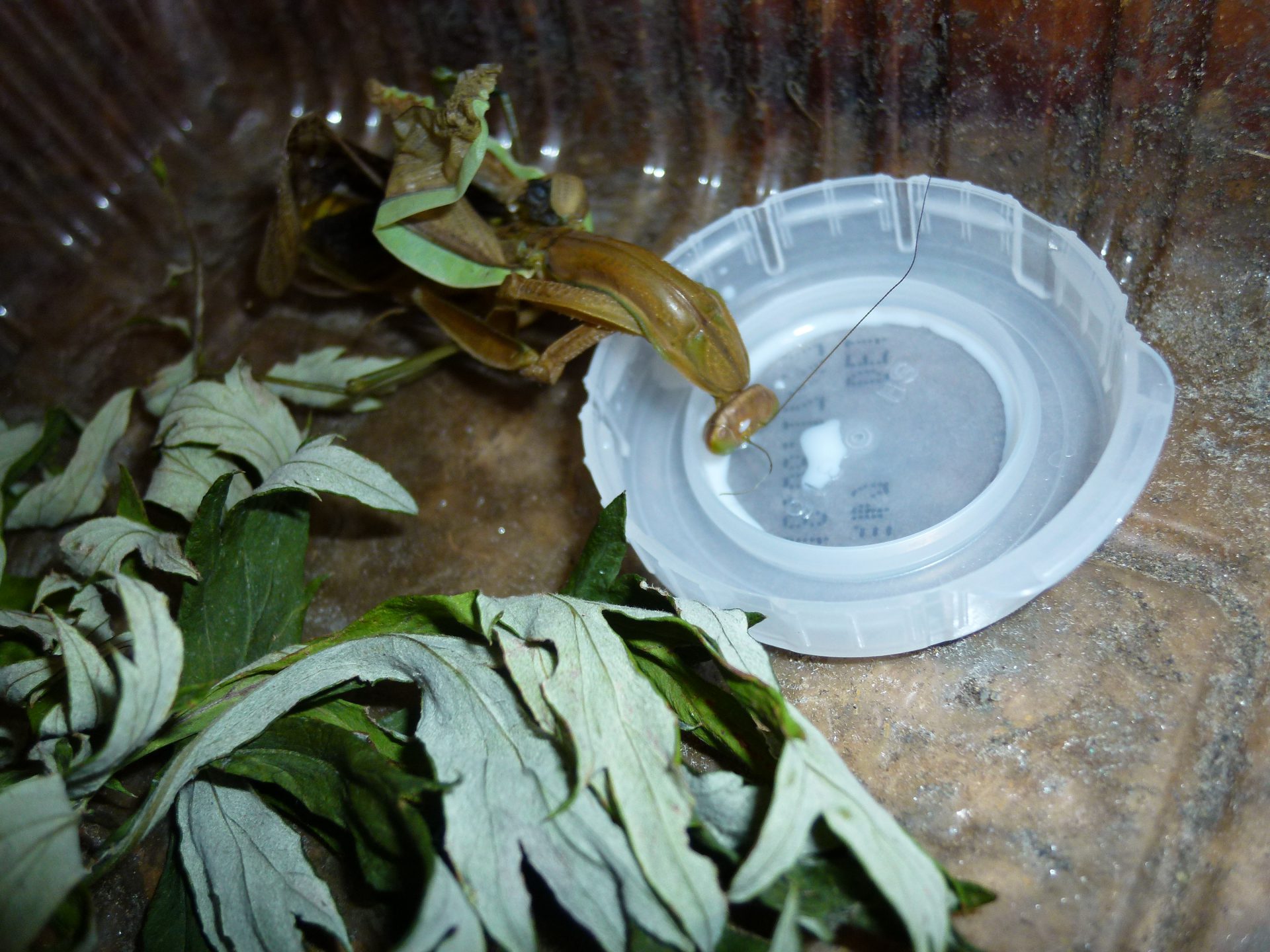 「バッタ食べなかったから牛乳あげたら元気になるかな?」とおやつに出た牛乳を少しカマキリに飲ませてあげることに。