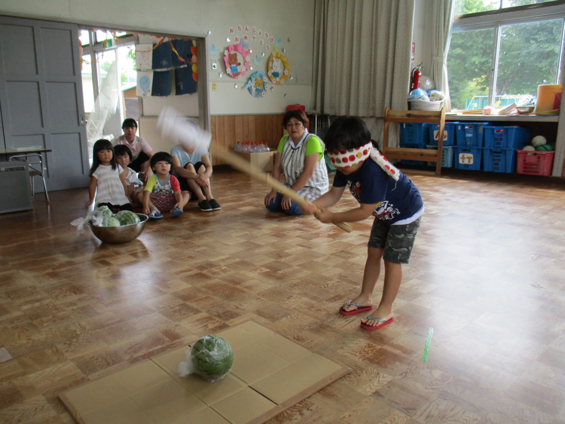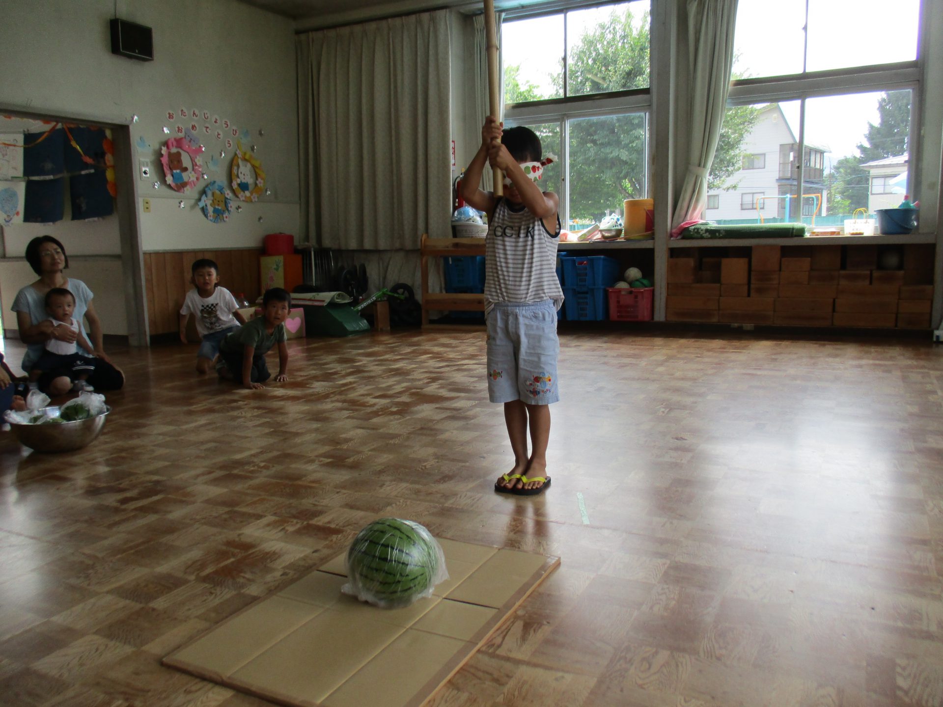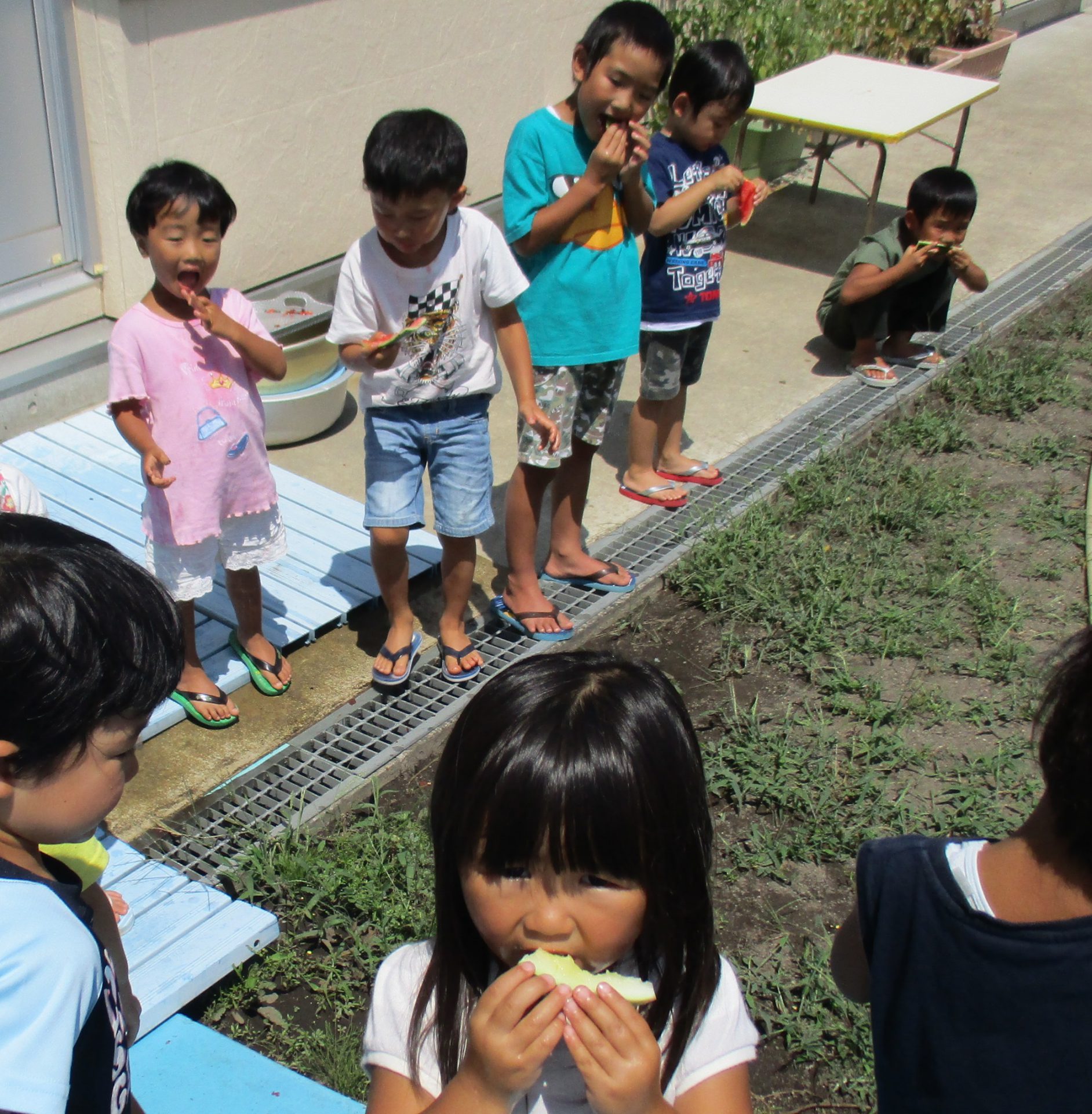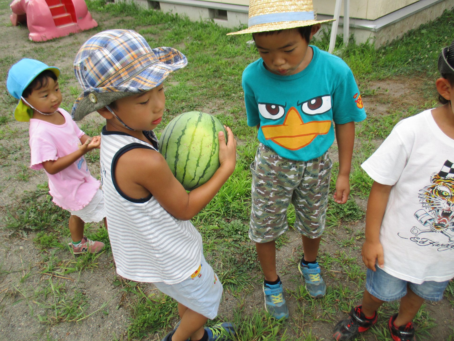 自分たちで育てたすいかを収穫し、みんなですいか割りができたことはとてもいい体験になりました。自分達で収穫したすいかは格別おいしかったと思います。目の前でスイカが割れたときの子どもたちの反応がとても可愛らしかったです。これからも保育園で様々な食に関わる体験を通して、楽しみながら食材や食べることに興味関心を持ってほしいと思います。またすいかが収穫できたらすいか割りを楽しみたいです。