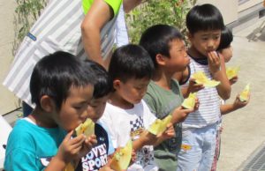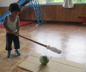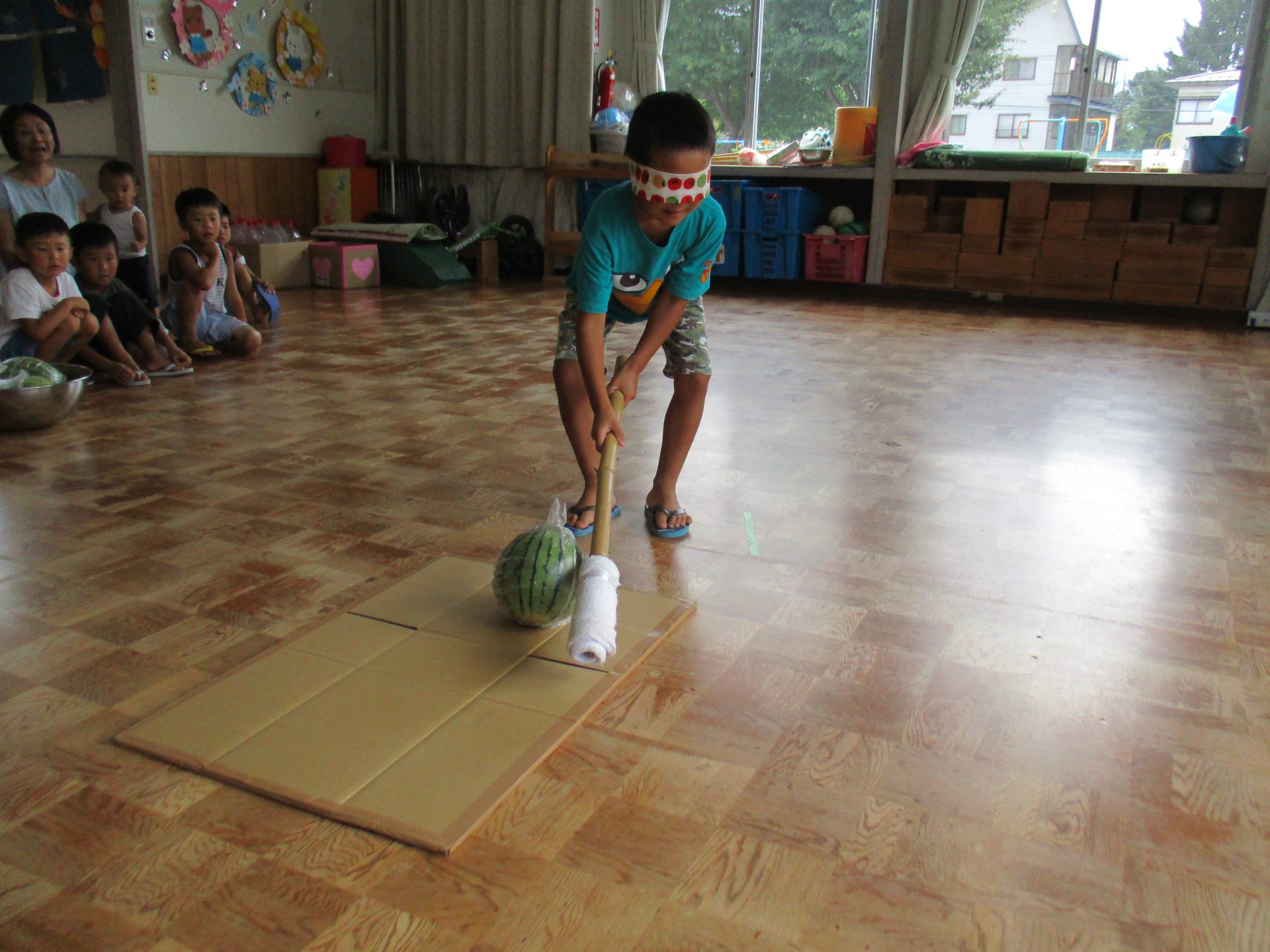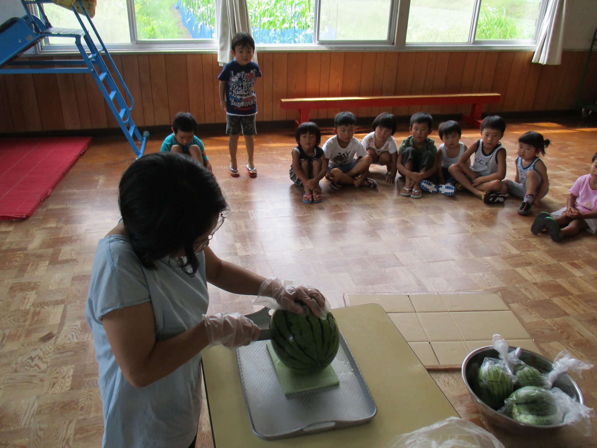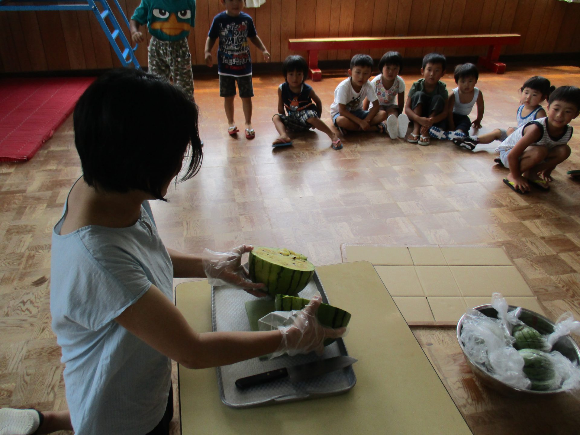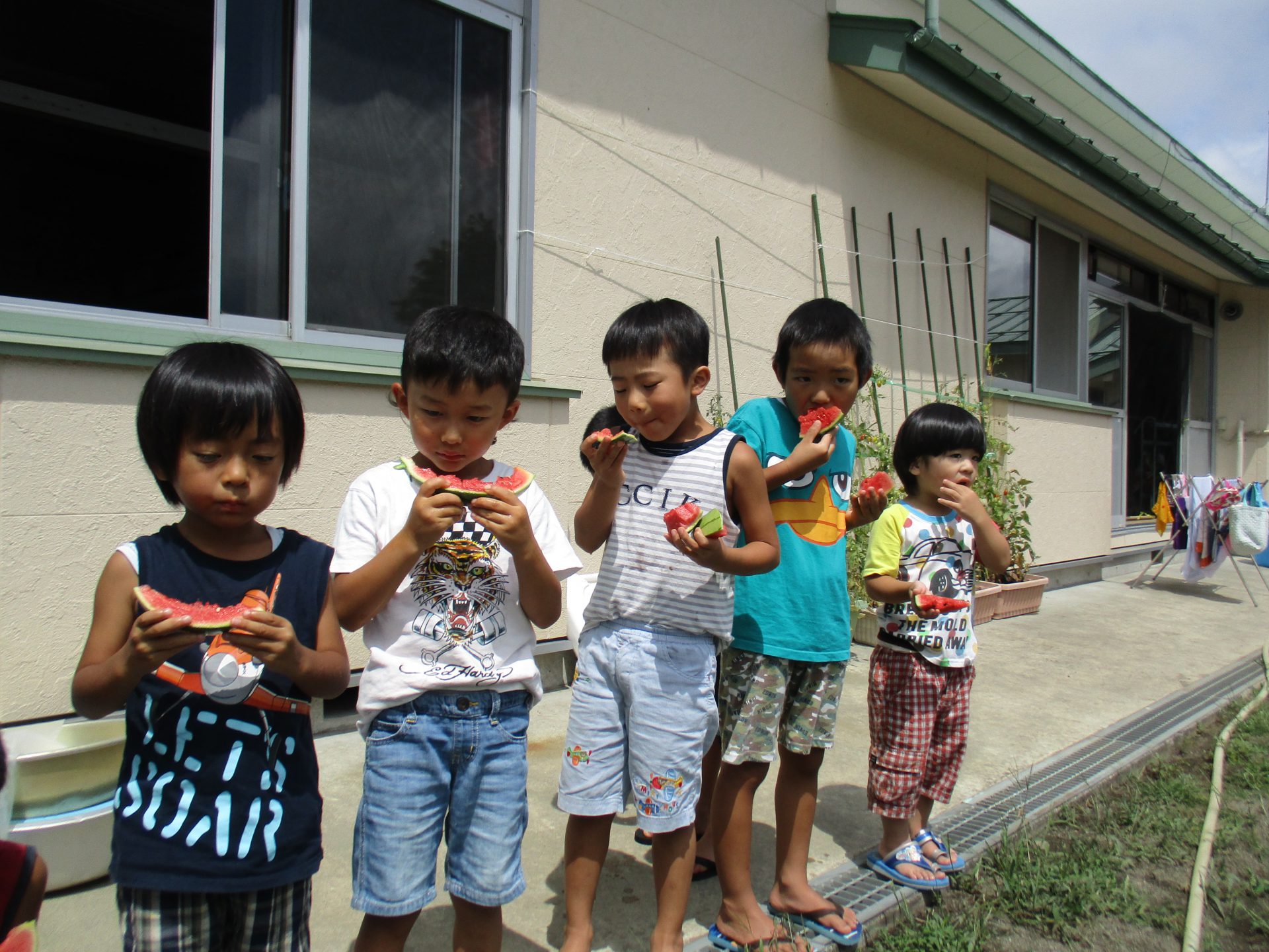 自分たちで育てたすいかを収穫し、みんなですいか割りができたことはとてもいい体験になりました。自分達で収穫したすいかは格別おいしかったと思います。目の前でスイカが割れたときの子どもたちの反応がとても可愛らしかったです。これからも保育園で様々な食に関わる体験を通して、楽しみながら食材や食べることに興味関心を持ってほしいと思います。またすいかが収穫できたらすいか割りを楽しみたいです。