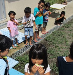 すいかの種は外に飛ばしちゃえ! 「こうやってやると飛ぶよ!プッ!」 息を吸い込んだり、口をすぼめたり、みんなで種飛ばし競争を楽しみました!