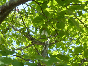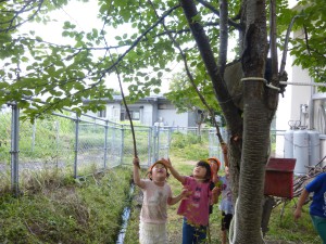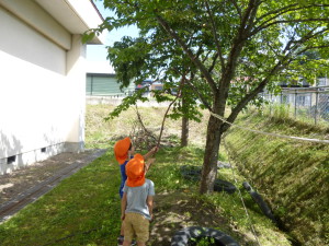 そこで子ども達は考え、木の枝を使って落とすことにしました。