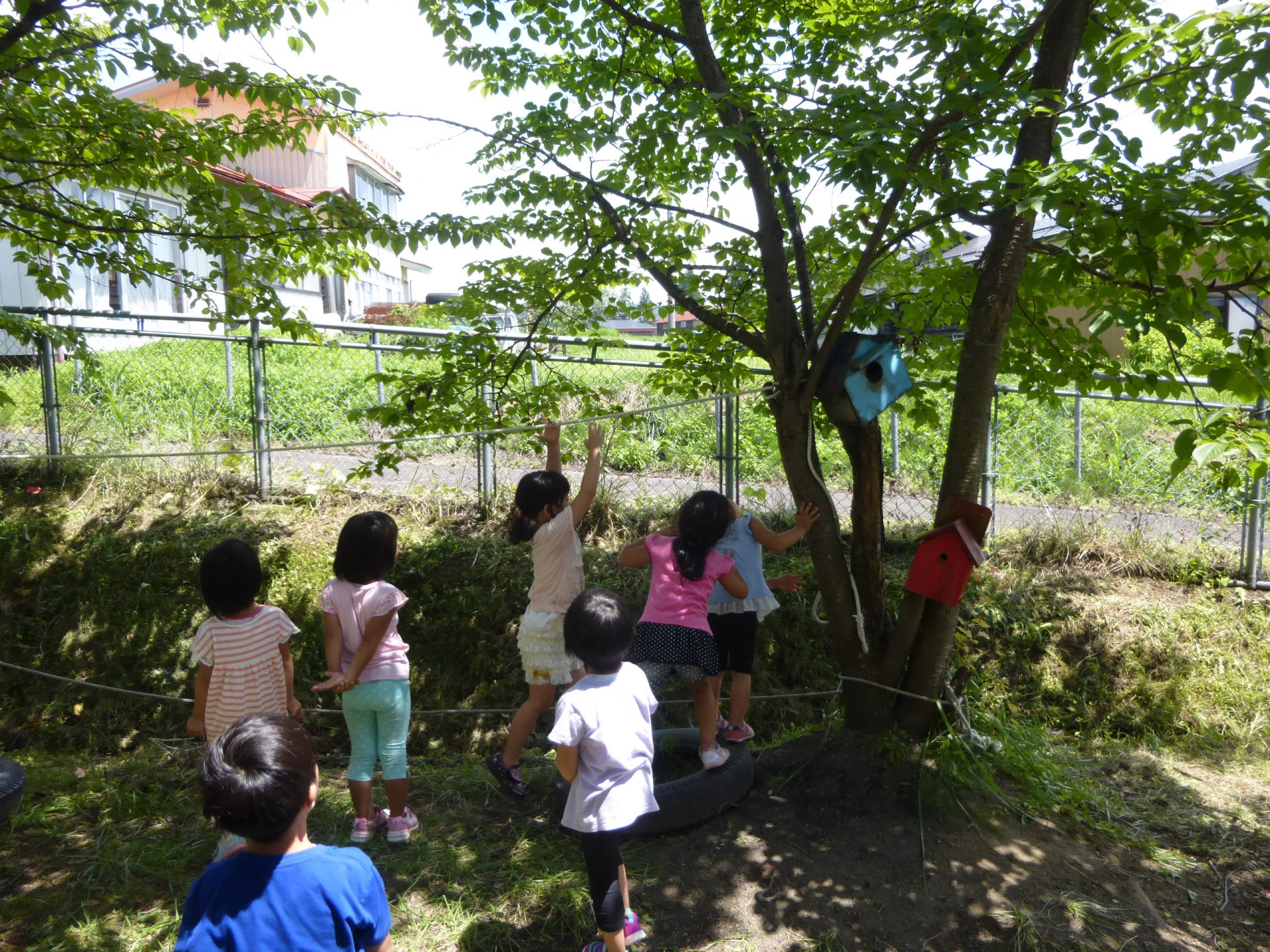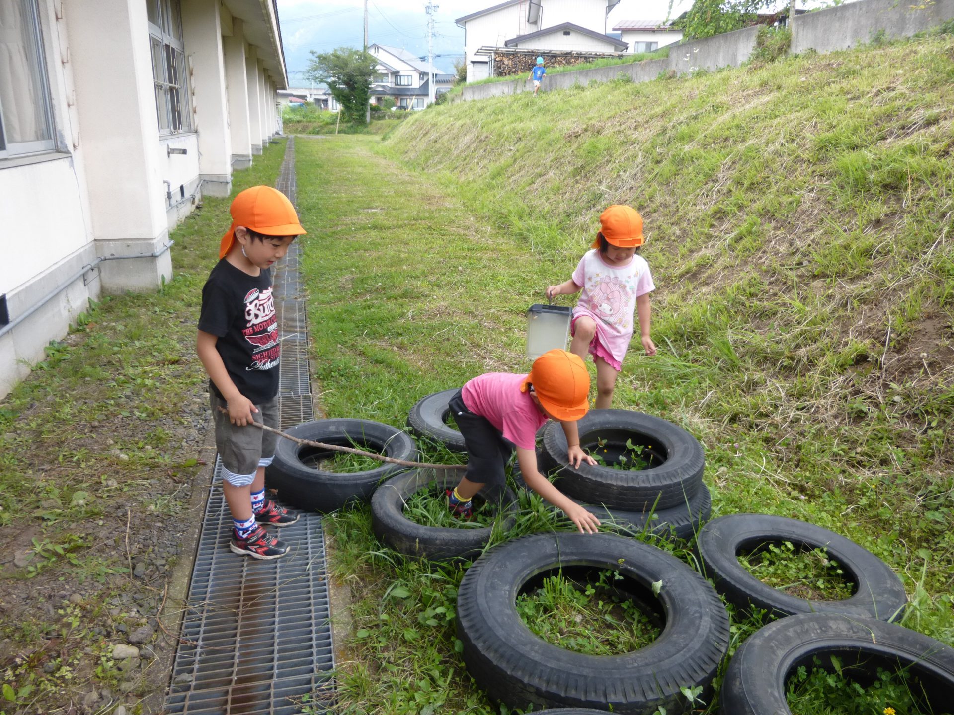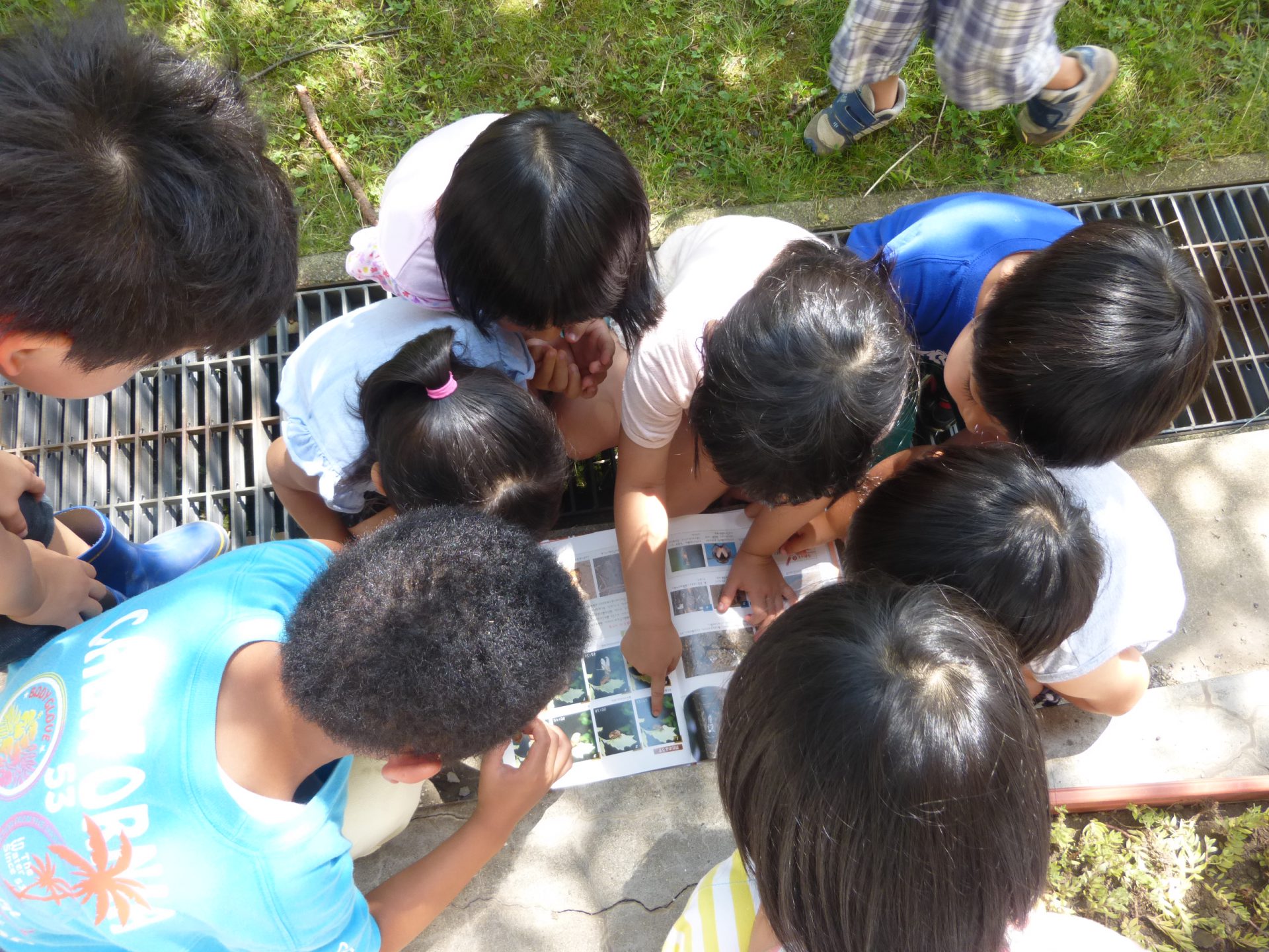 園舎裏のちょっとした広場でもそれぞれに遊びを見つけたり、生き物に触れたりと楽しんでいました。