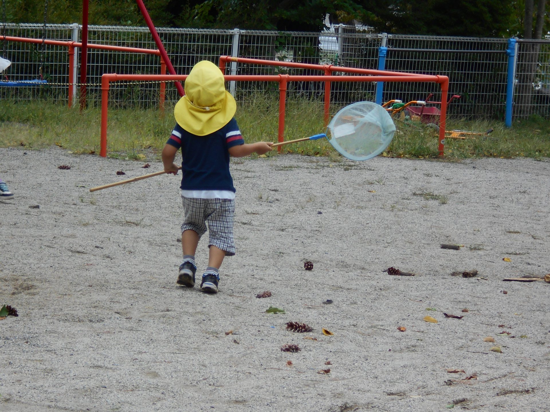 「あっトンボ!」空にいっぱい群れをなしてとぶ様に「すごーい!!」といいながら補虫網片手に追いかけ始めます。ナツアカネかな。