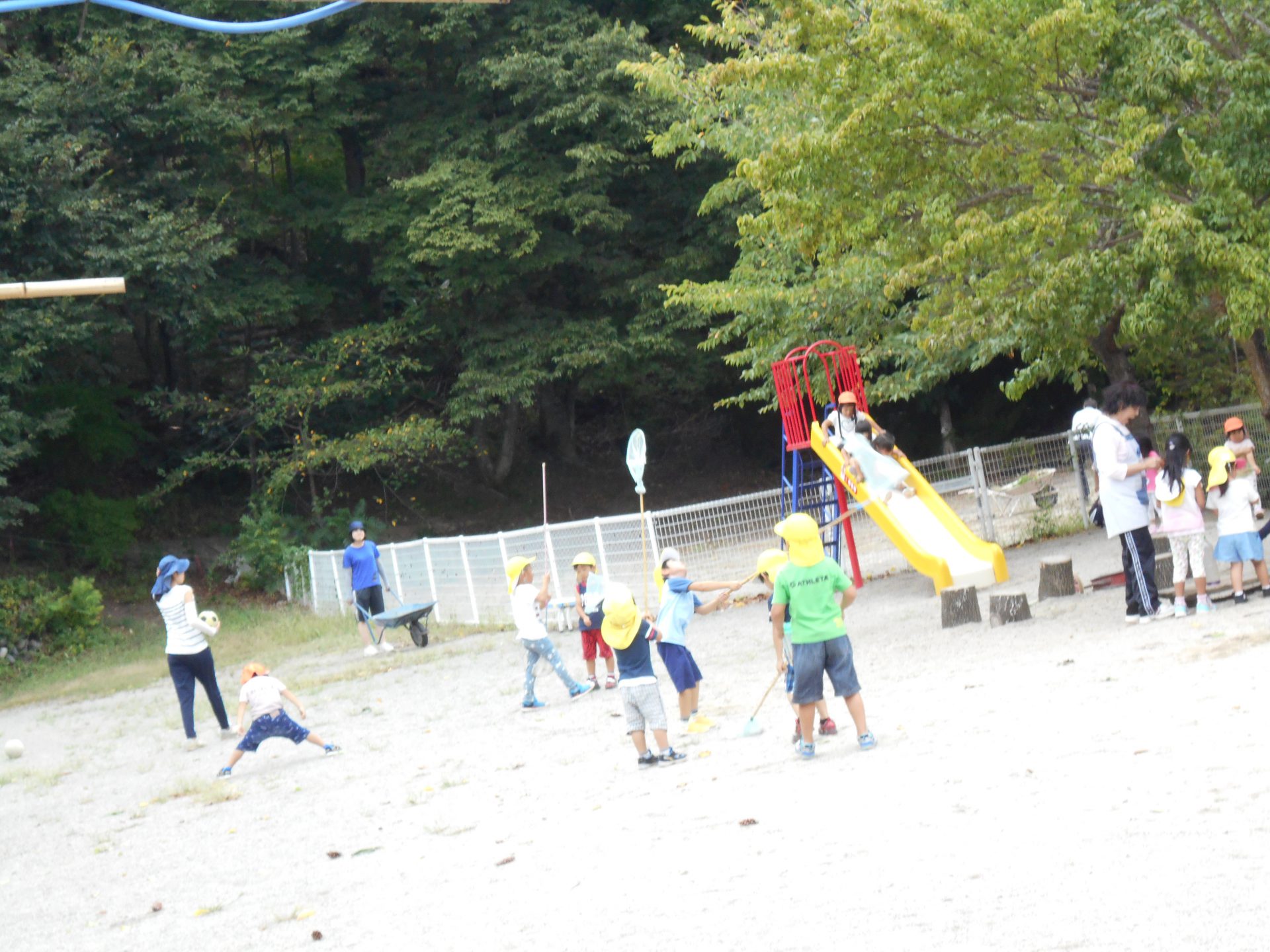 次第にお友達が増えて、何人もで追いかけ始めました。園庭中を走り回り、笑顔が広がります。