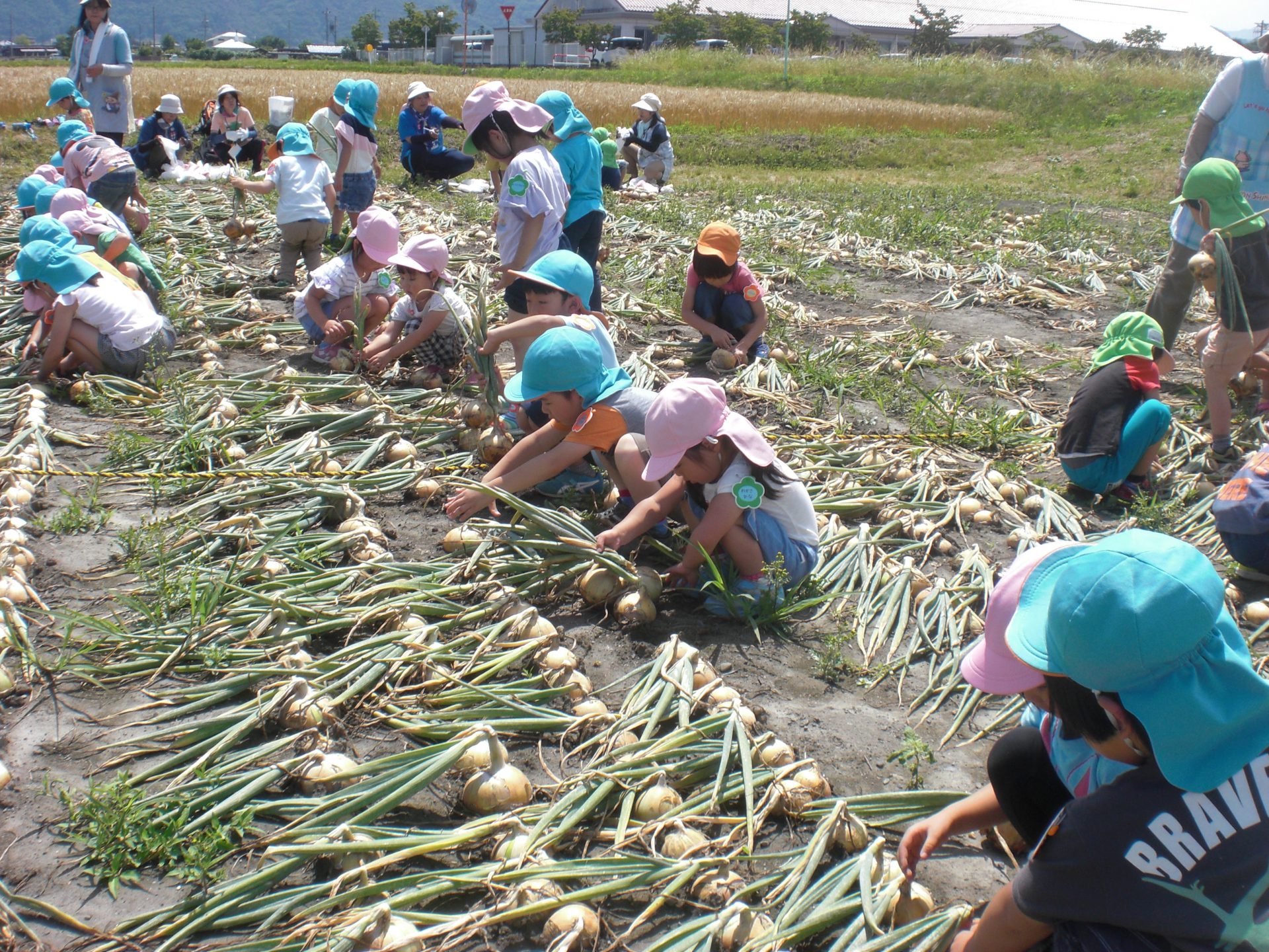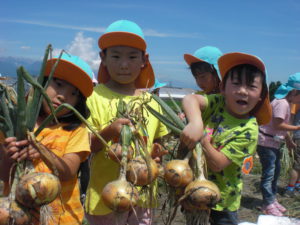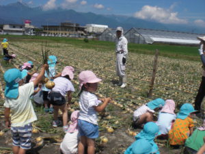 年中さん・年長さんの玉ねぎの収穫体験は、地域のたまねぎ農家の望月さんに呼んでいただきました。「玉ねぎの収穫時期は玉ねぎが教えてくれるんだよ。葉っぱがバタバタ自然に倒れてくるんだよ」など大切なことを教えていただきました。