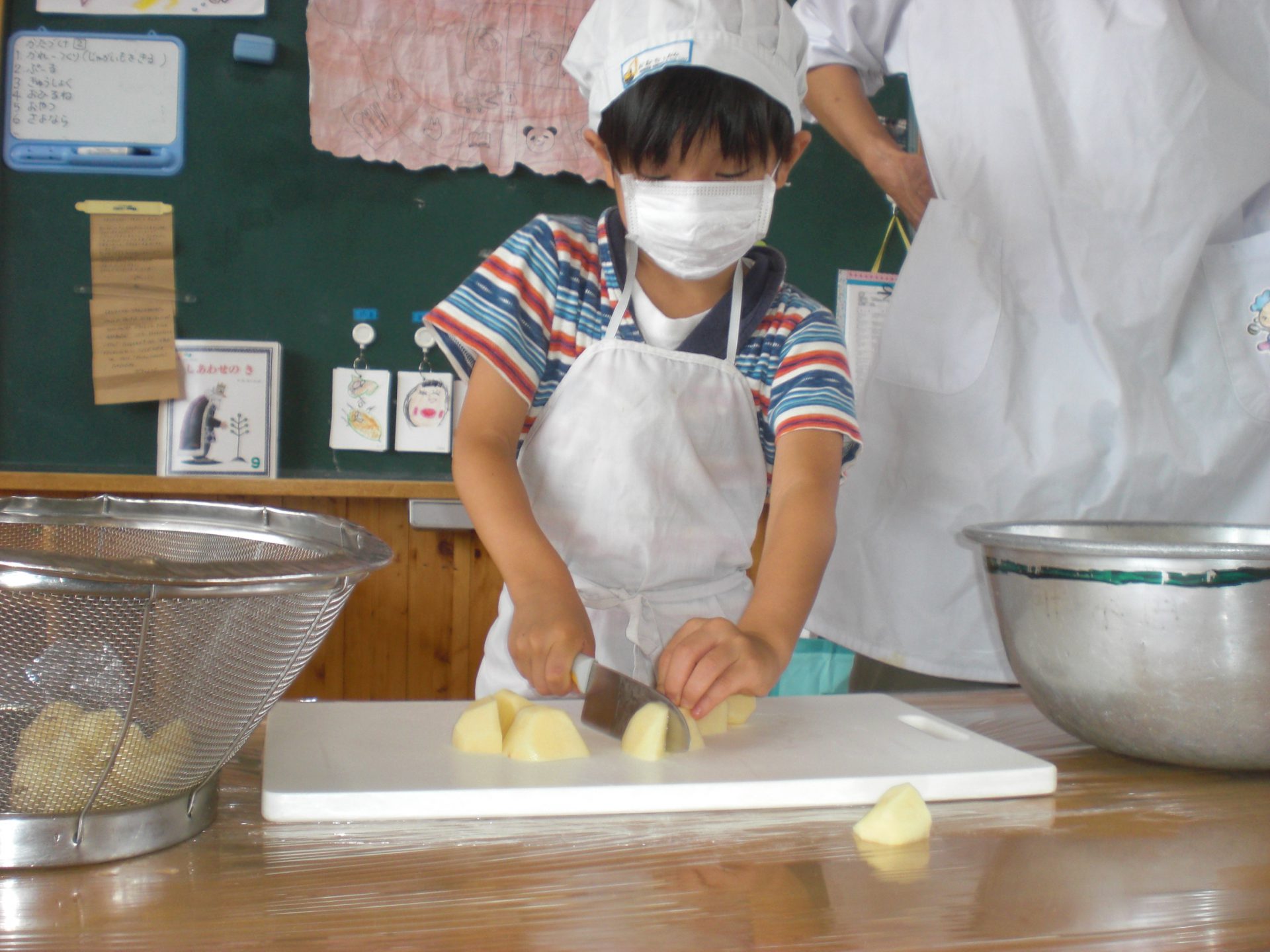 年長さんは、包丁を使ってジャガイモを切ります。「『ネコの手』おうちで練習したよ」「小さい子の口にも入る大きさで切ろう!」と、思いやりの気持ちを持ちながら、張り切って切りました。