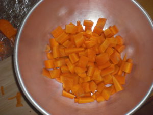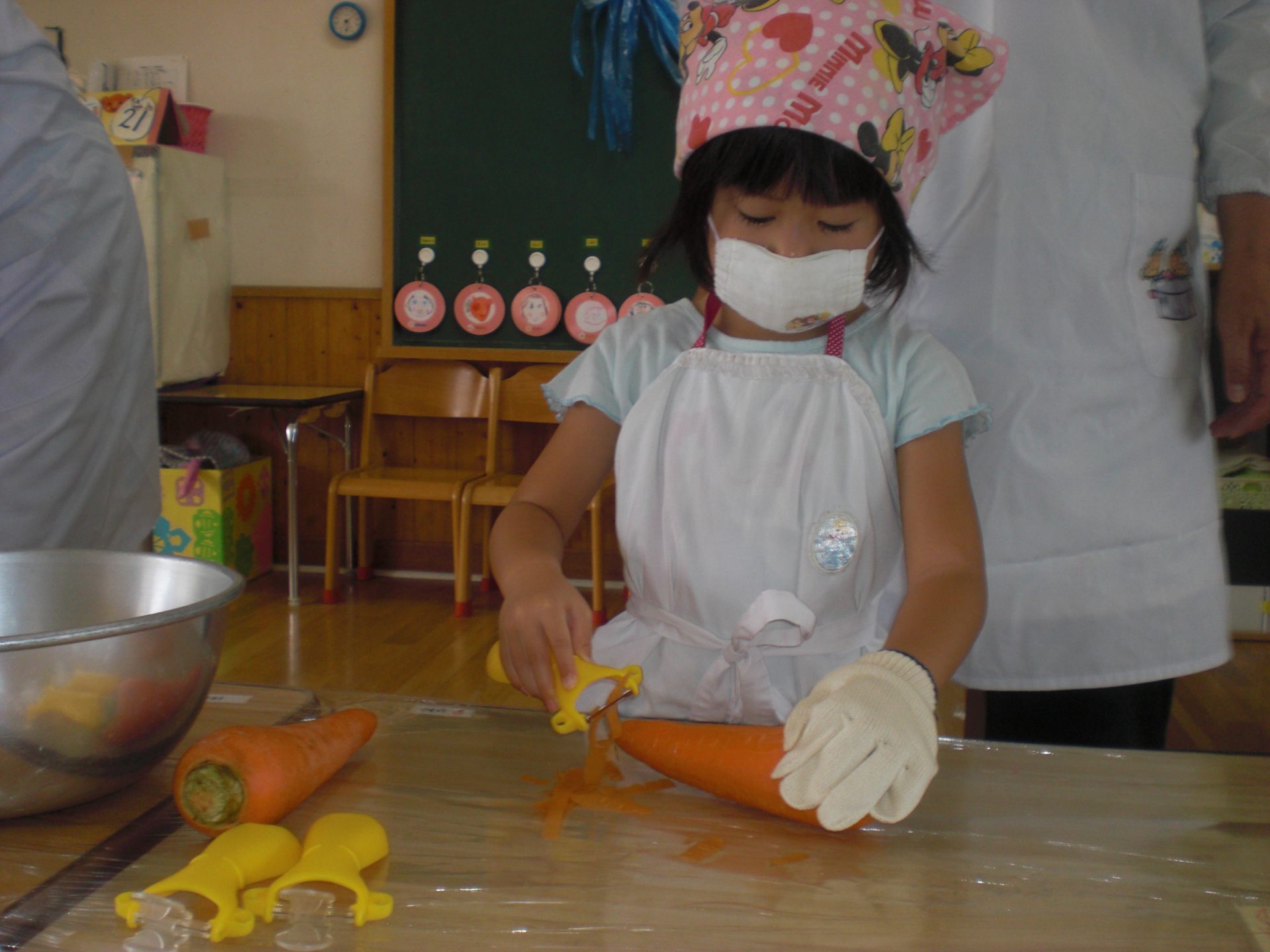 年中さんはまずはニンジンの皮むき。