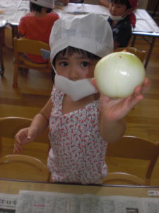 地域の農家さんに教わりながら収穫した玉ねぎと、園庭で収穫したジャガイモ・枝豆を使ってカレー会をしました。