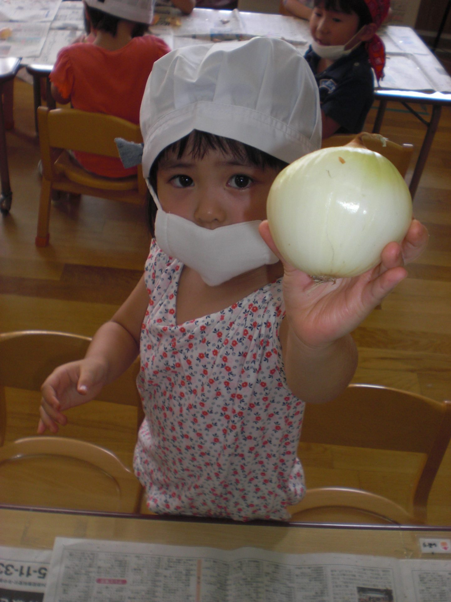 年少さんは1人1個ずつ玉ねぎの皮をむきました。「白いとこ、出てきたよー!」「むずかしい…」「においがしてきたー」