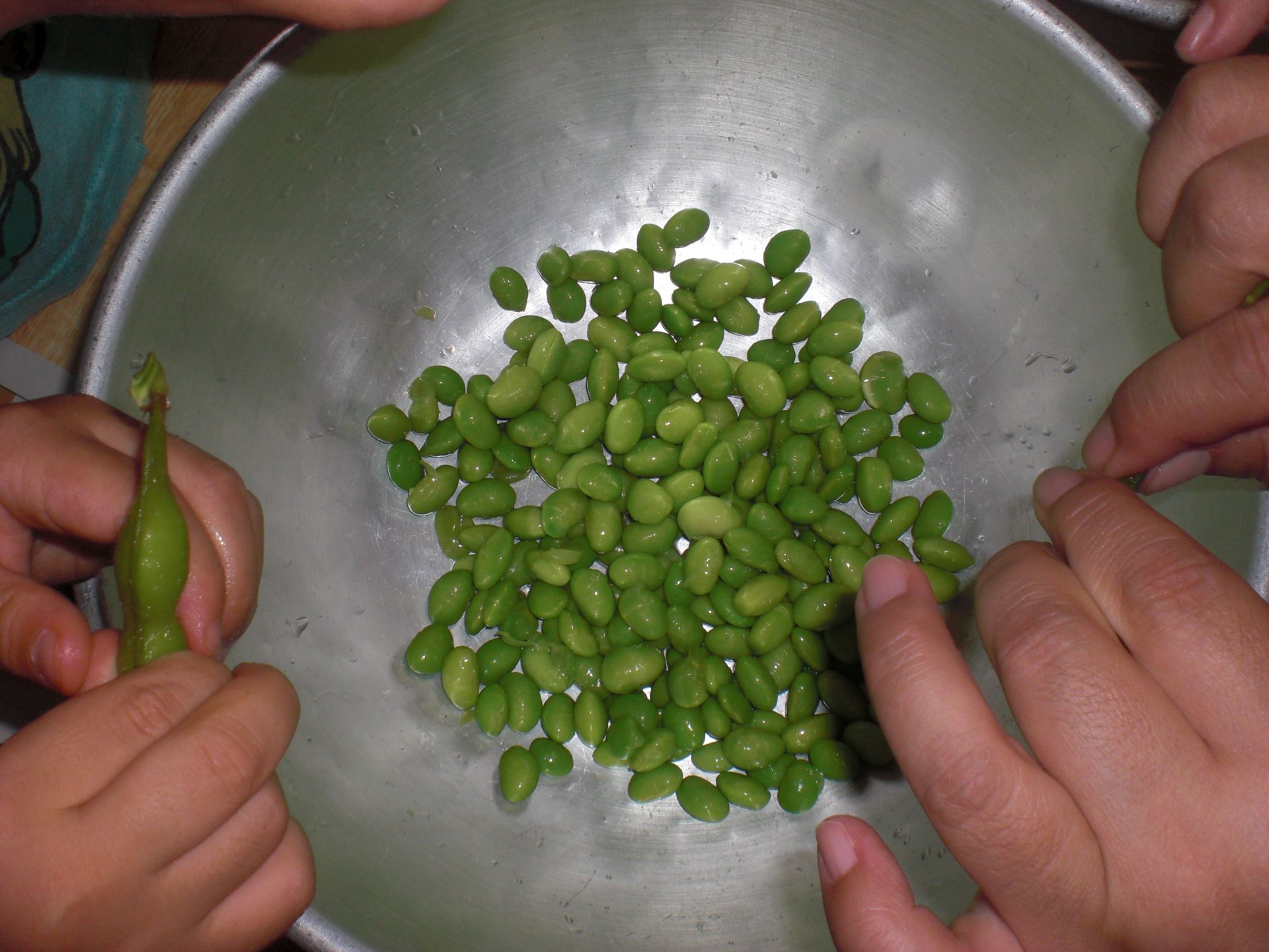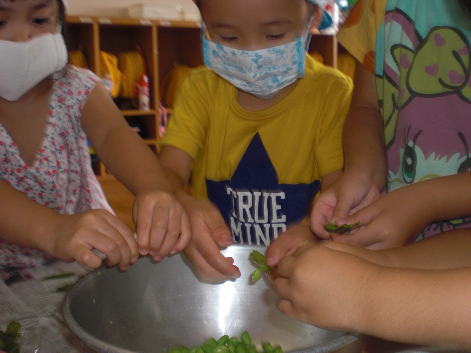 そのあとは、給食室で茹でてもらった枝豆を一粒ずつサヤから出すお手伝い。「あ!豆が出てきたよ」「おいしそうだなぁ。もう食べたいなー」「ちがうとこ とんでっちゃった~」