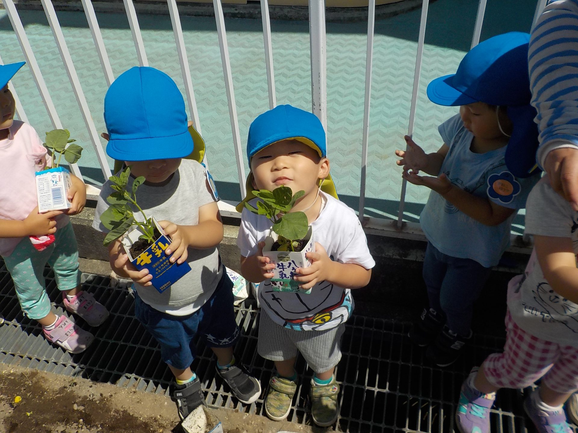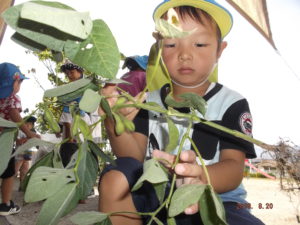 年少さんは枝豆を種から育てた経験ができ、土に触れたり、野菜の生長の過程を知ったり、楽しんだりすることもできました。
