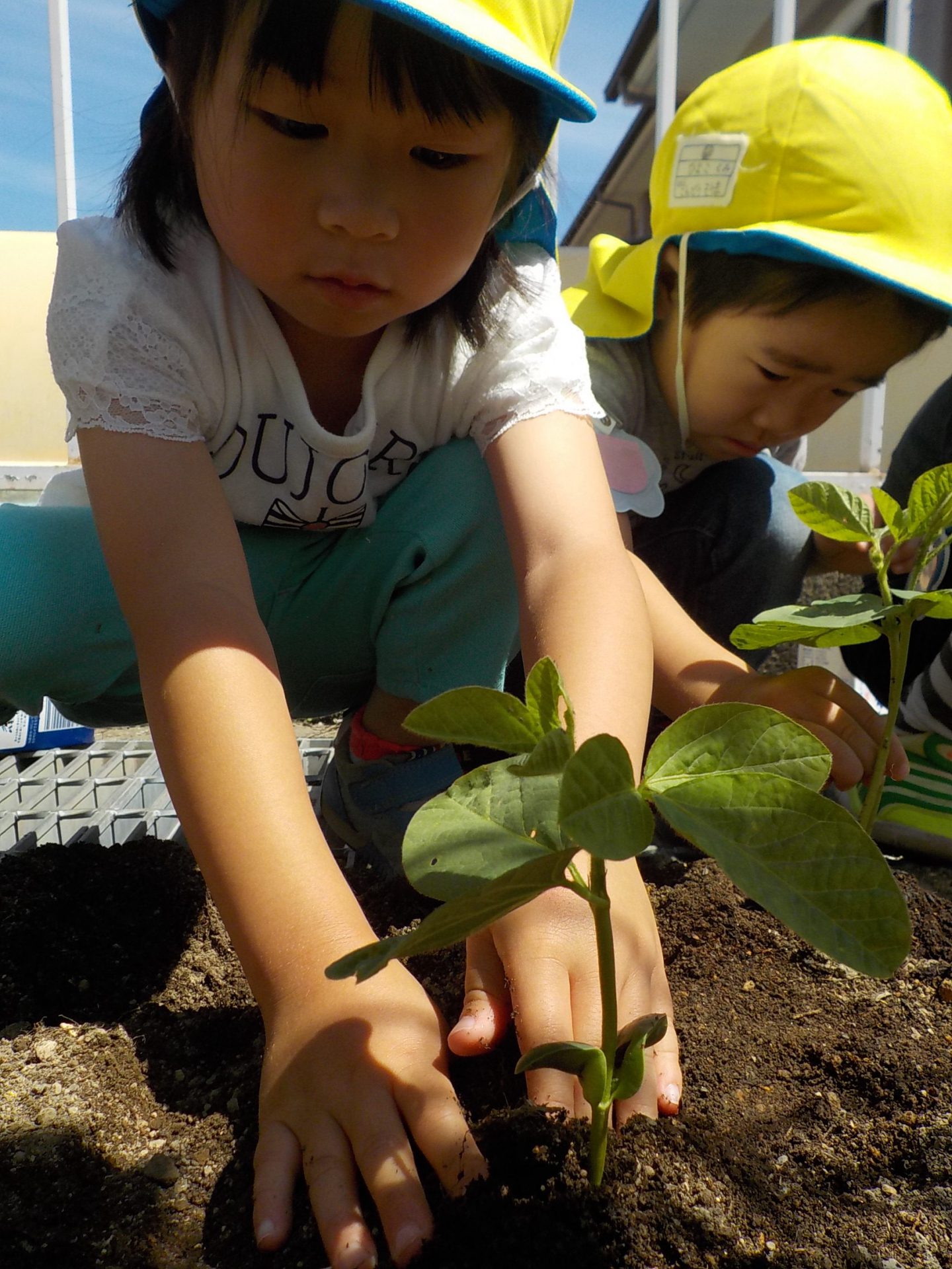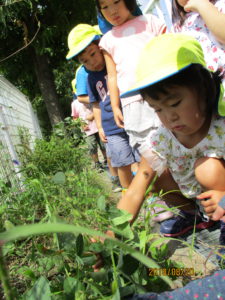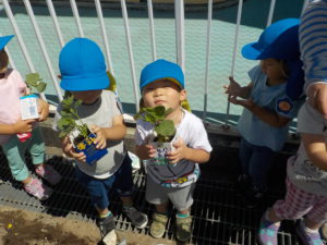 枝豆を育てた年少さんは、『豆そのものが種』であることに驚いた様子でした。芽出しをした苗を「枝豆にお布団をかけてあげよう」と、丁寧に土に植えていました。