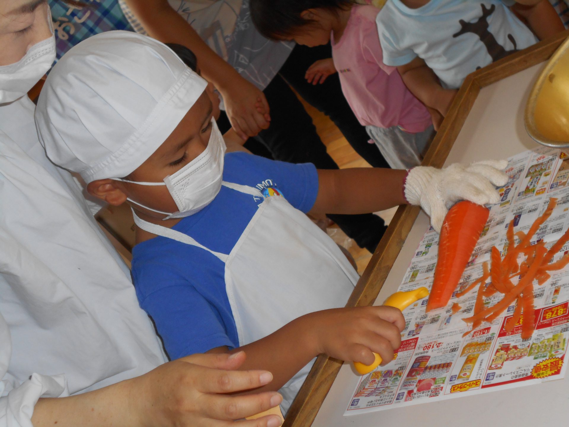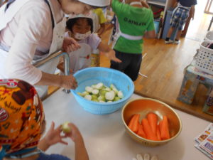 ・年少さんと年中さんは、年長さんが包丁を使って真剣に野菜を切っている姿を見て、「すごーい。」という眼差しで見ていました。
