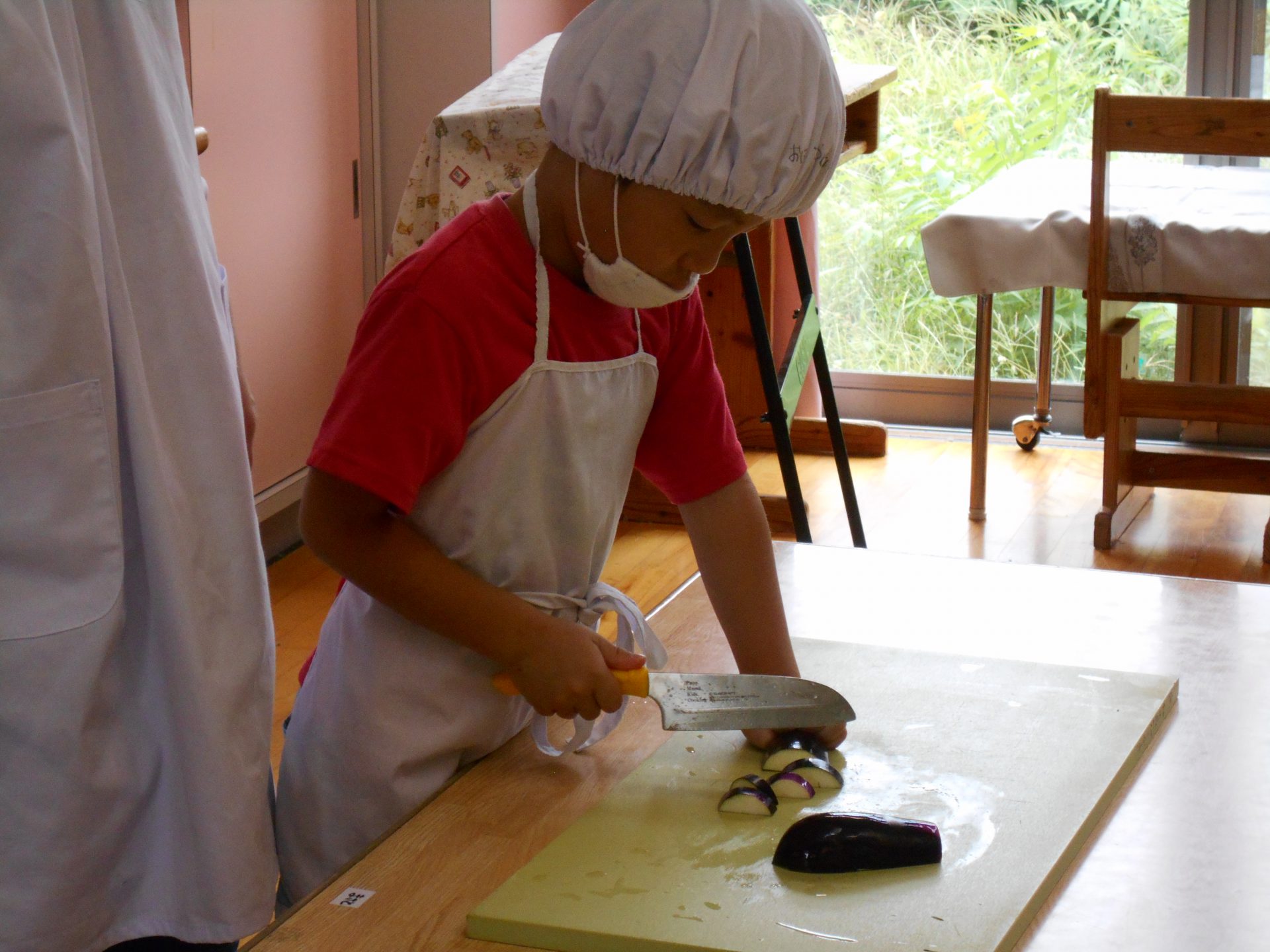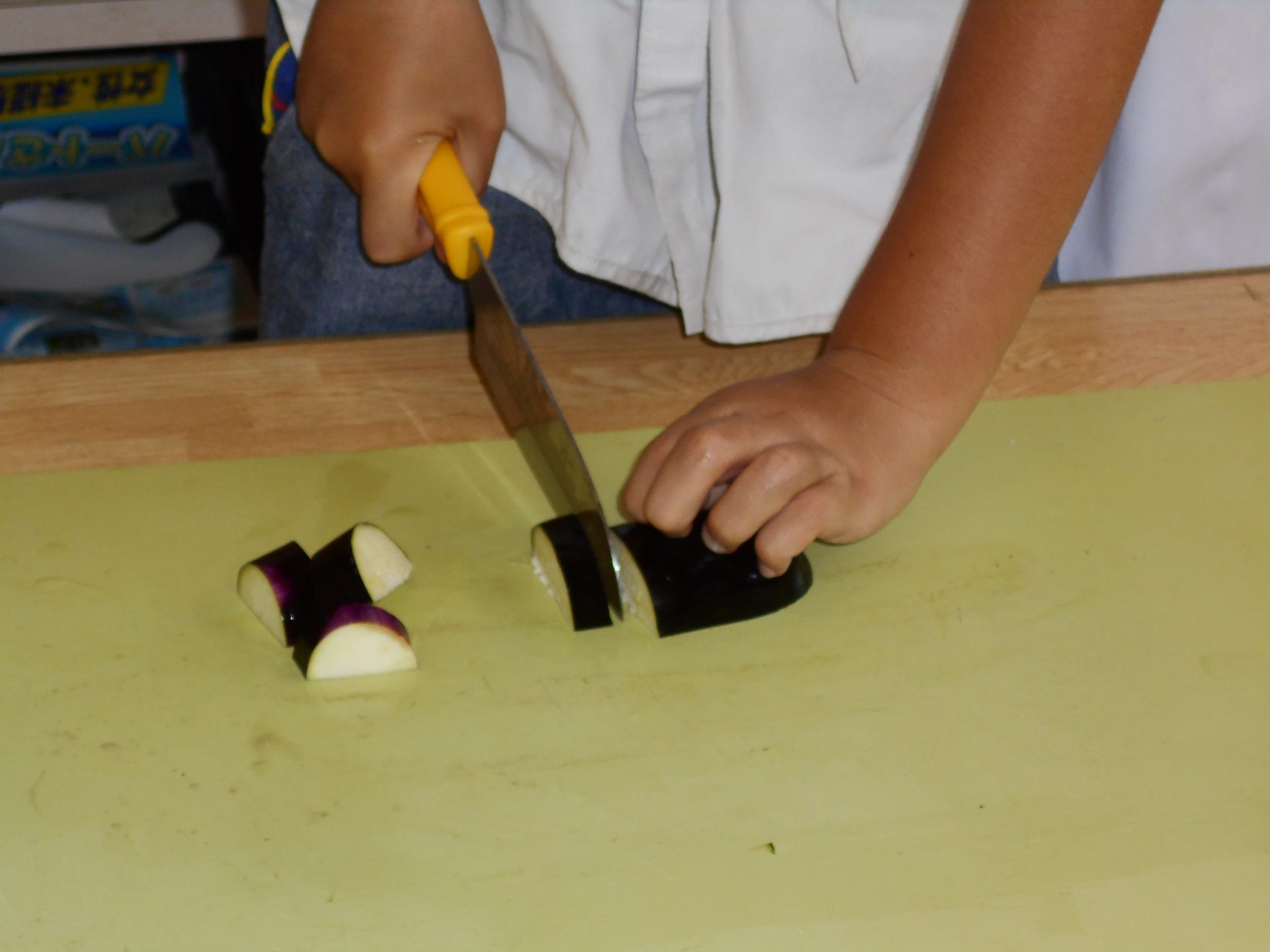 年長さんは、包丁を使ってジャガイモ、ナス、ズッキーニを沢山切ってくれました。