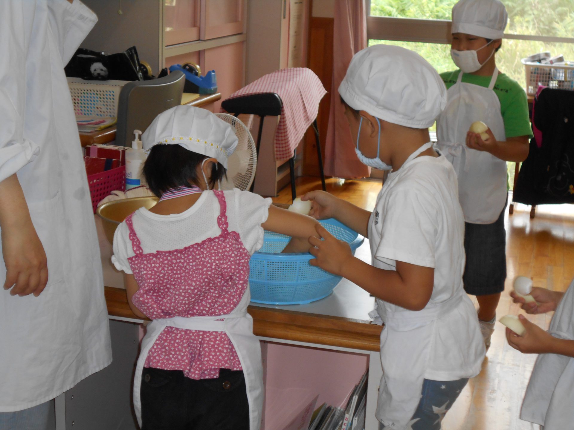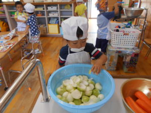 玉ねぎの皮むきは、年少さんと年中さんのお仕事。部屋の中は、玉ねぎの匂いでいっぱい。