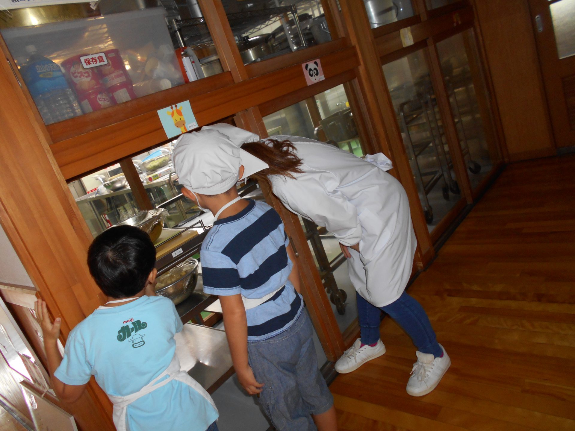 ・年長さんは、担任が「こうやって給食の先生やお母さんは毎日お料理してくれているんだね。大変だね。」という声かけに、「うちのお母さんもお料理いっぱいしてる。」「野菜切ってるよ。」など、会話を楽しみました。