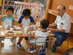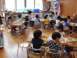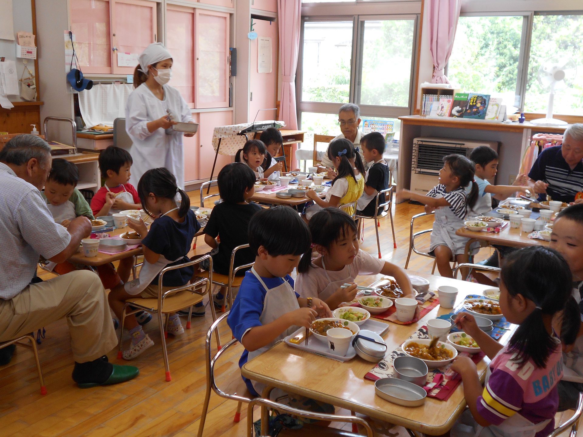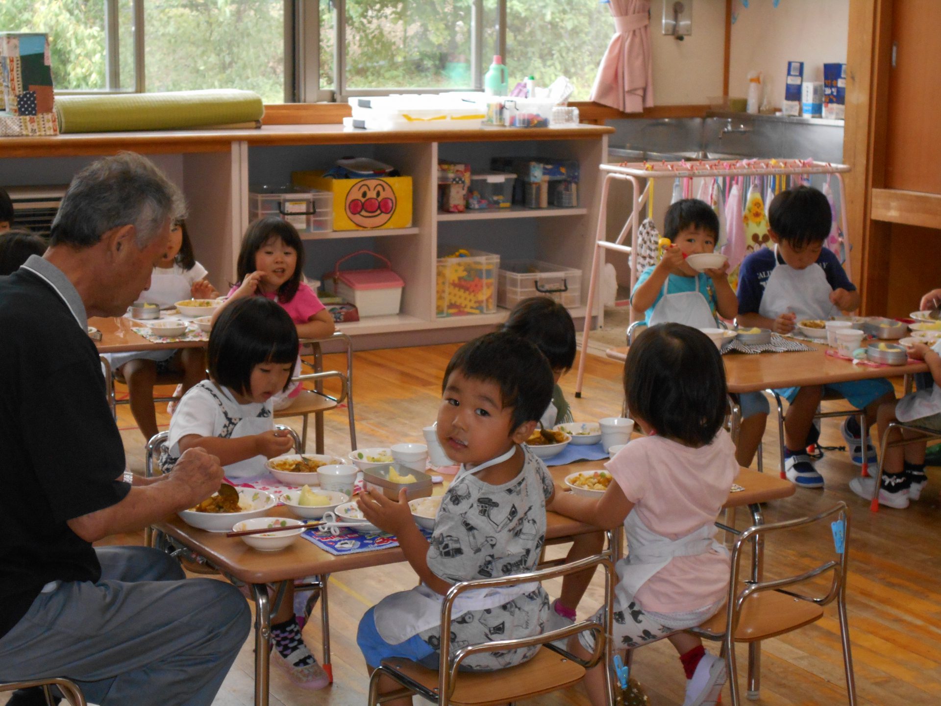 7月にサワガニ採りでお世話になったおもと会(老人会)の方々をお招きして、カレーが出来上がるまでの間、遊戯室で歌や手遊びのプレゼント ♪