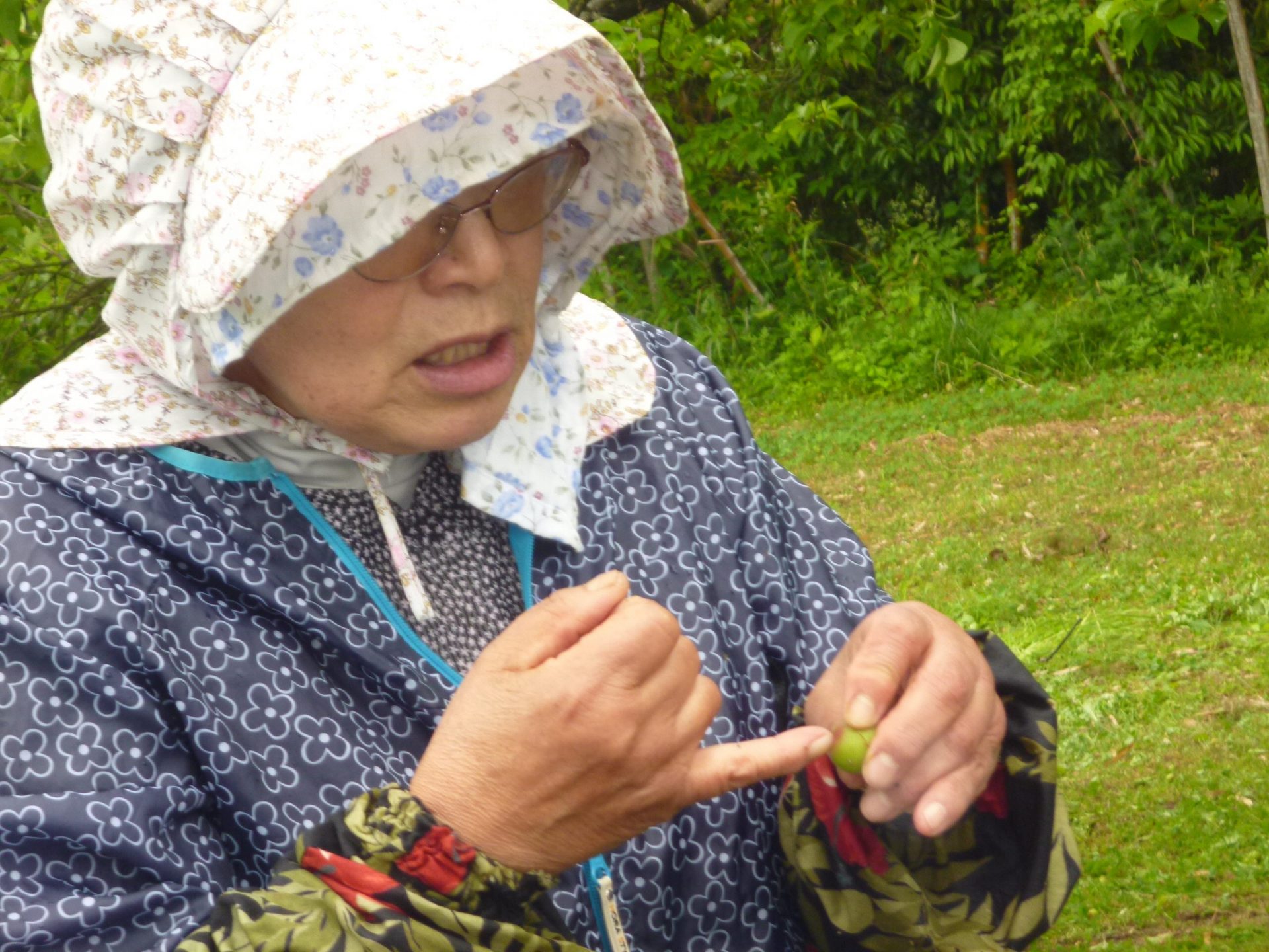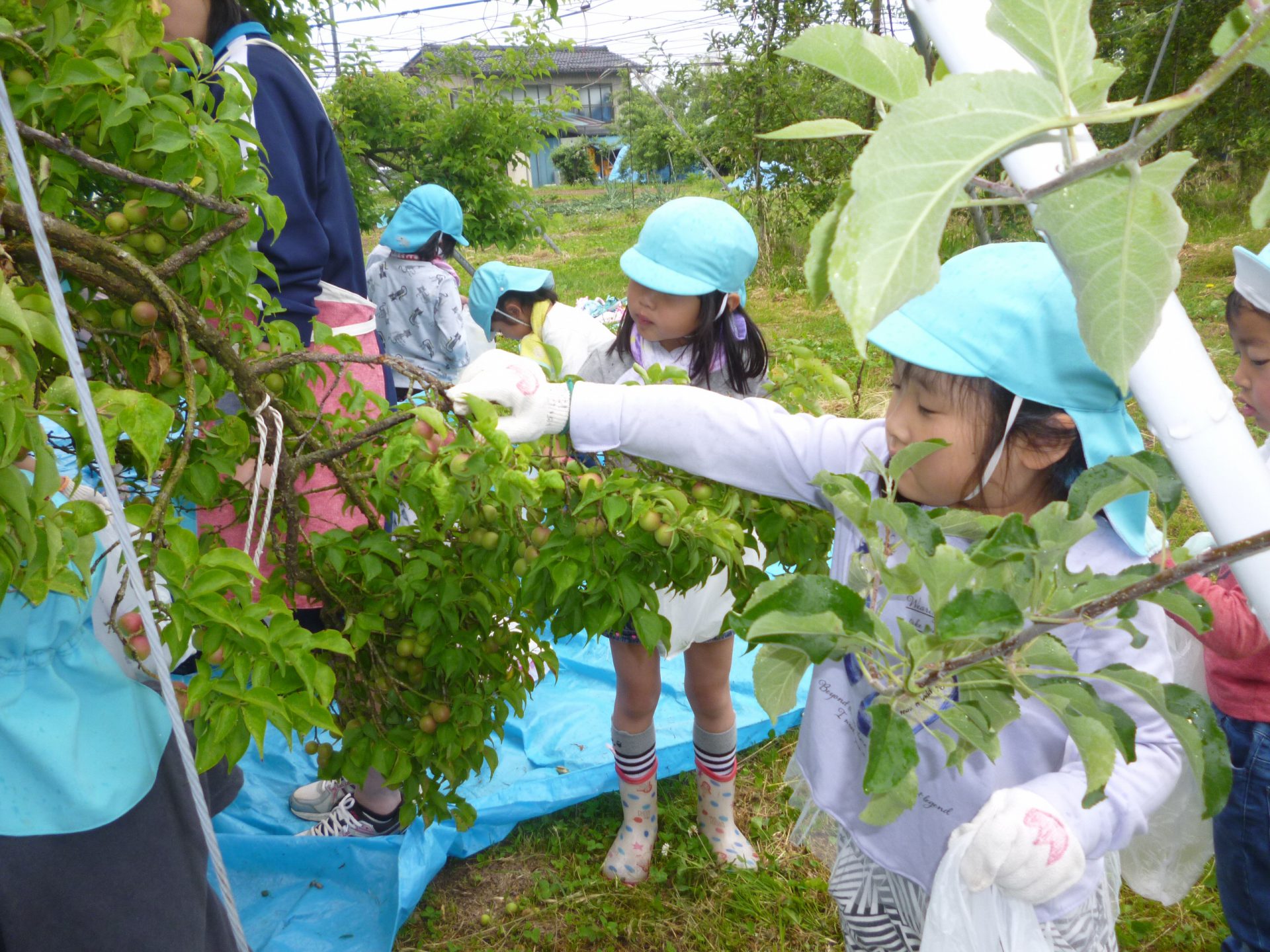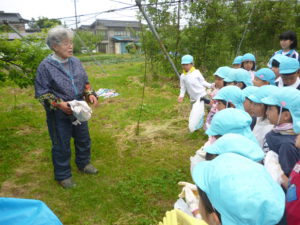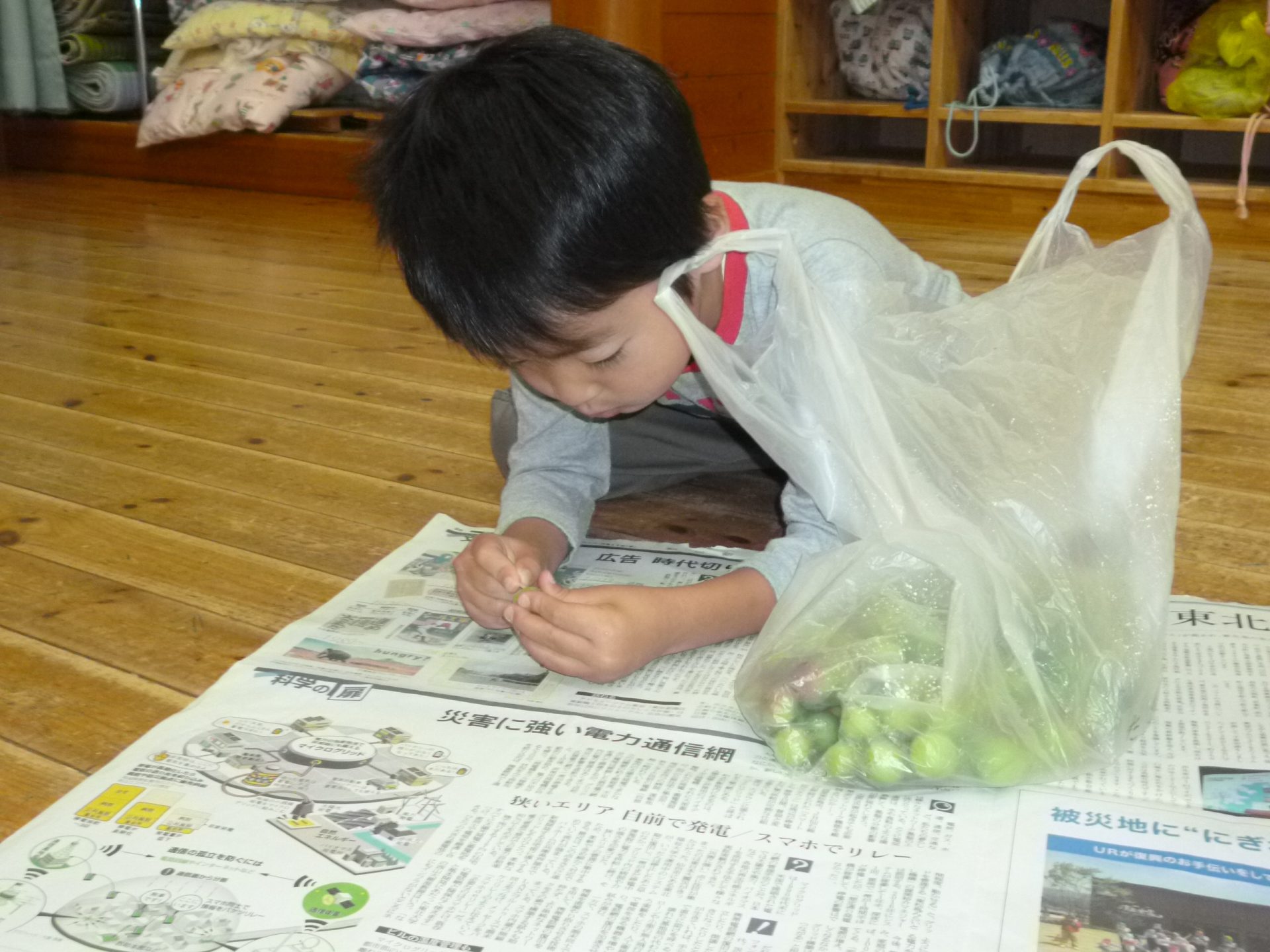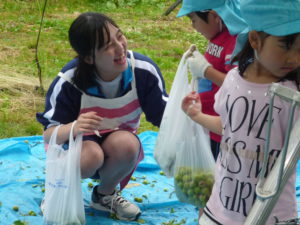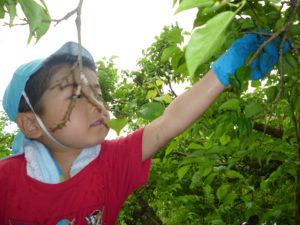 「この梅たべられますか!!!」との子どもからの問いに宮澤さんは「ここの堅い所を取れば食べられるよ」と教えてくださいました。早く食べたいのか早速堅い所を触る子どもたち、けどなかなか取れません。。。保育園に帰って取ろう‼‼‼