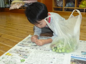 帰ってくると早速、梅の堅い所を子どもたちが探してきた爪楊枝で取り除きます。