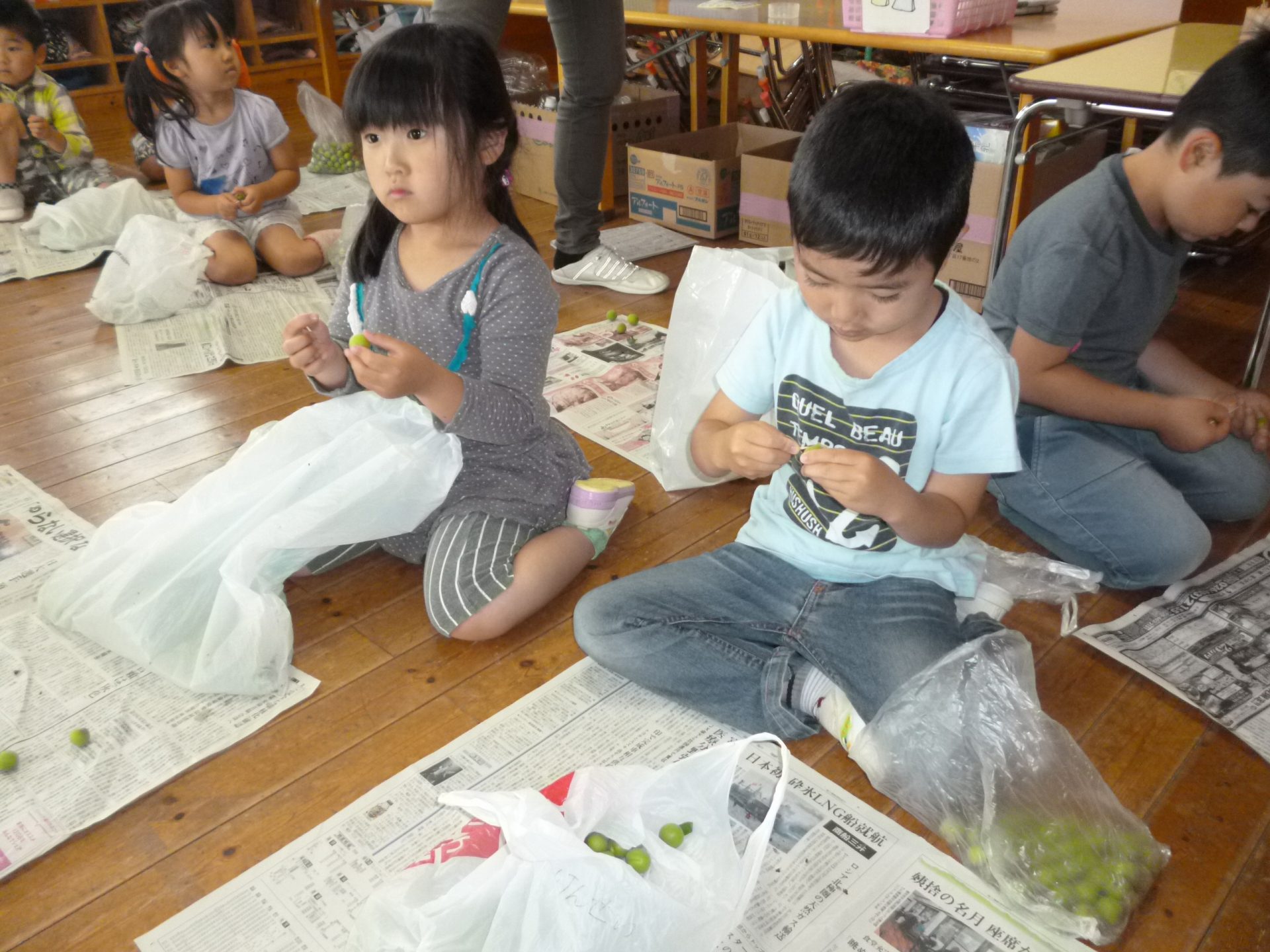 梅の堅い所にも、一つ一つ違いがあることや取り方にはただ力任せにやるのではなく、グリグリっとほじくるように(子どもの声)取ると綺麗に採れることを体験の中から見つけていた。