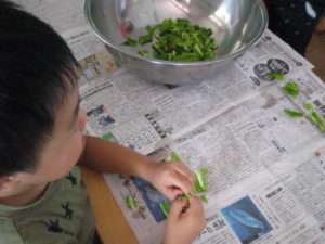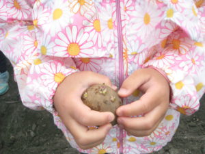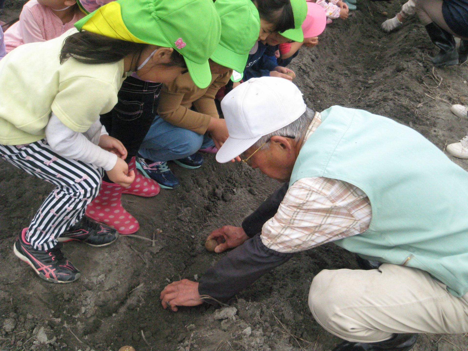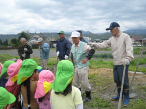 ・おじいちゃん達から「じゃがいもの種いものゴツゴツしたところから芽が出るんだよ。」と教えてもらいとても感心した子ども達。後日畑に行くとジャガイモの葉っぱがワサワサと風に揺れていました。その葉っぱが黄色くなるころが収穫時期だとお聞きし「また畑に来る頃は黄色くなってるかや~」と、楽しみに待つことできました。
