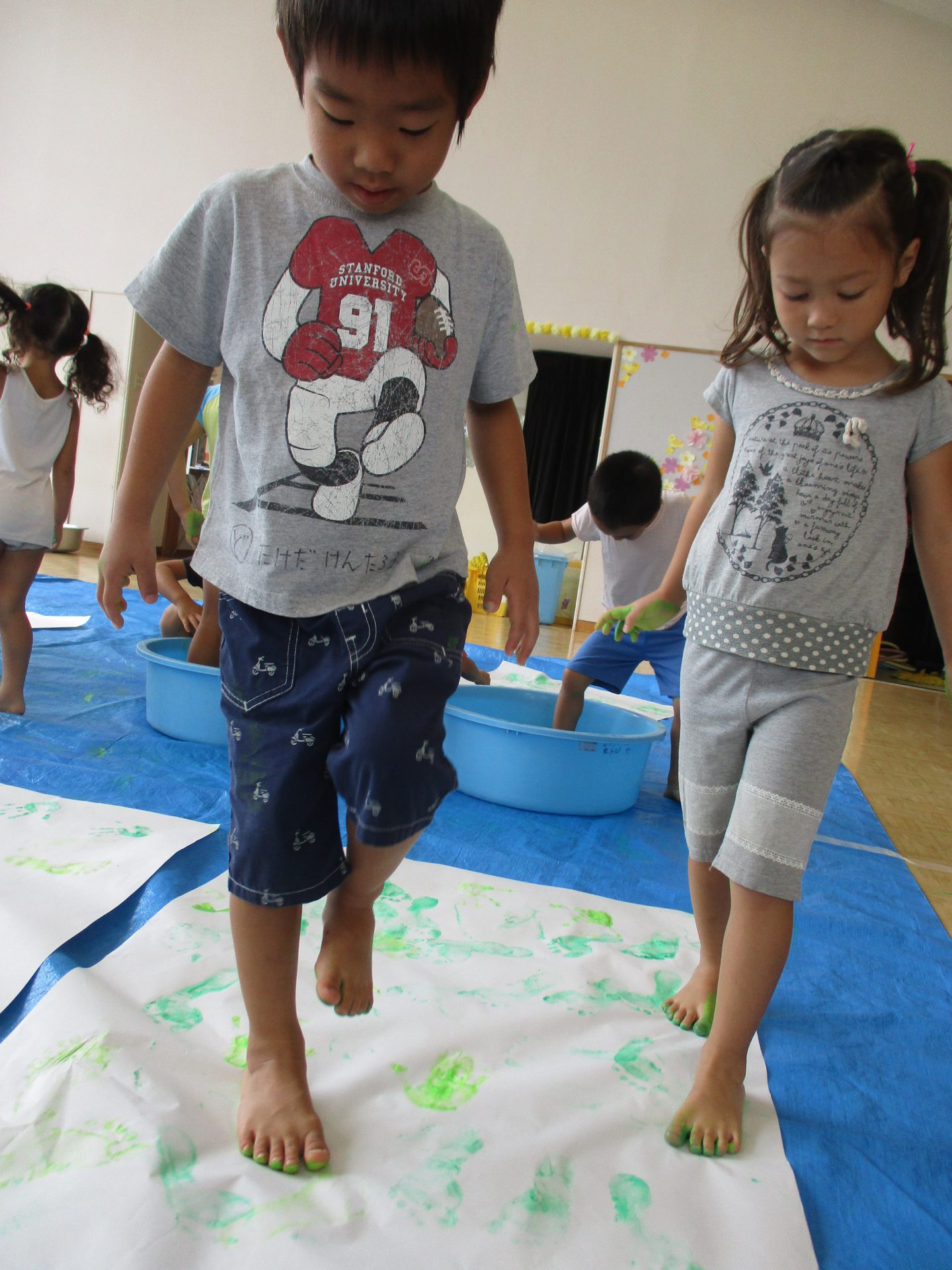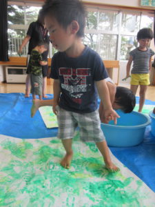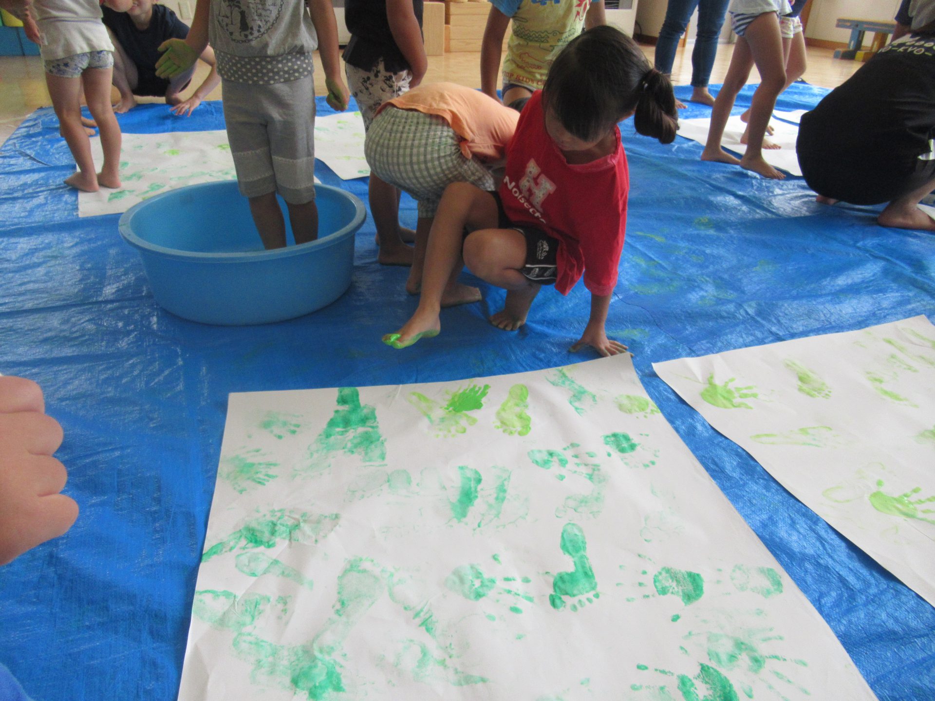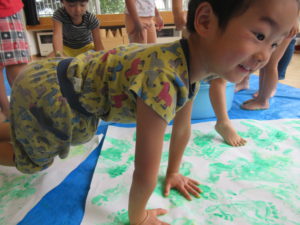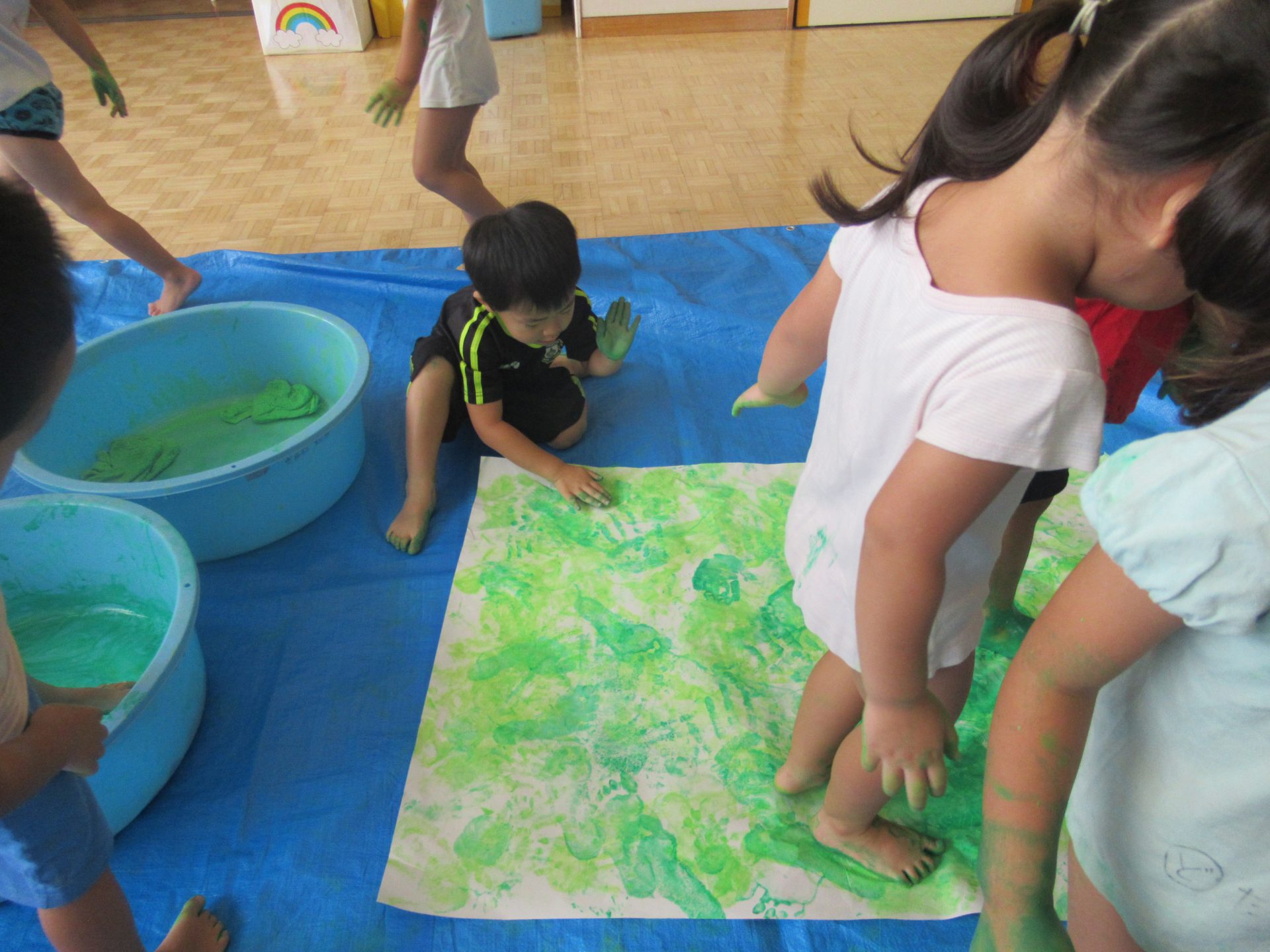 プール遊びと平行して楽しんでいた運動会ごっこ。より仲間意識を高めてほしいと思い、チームでの絵の具遊びを取り入れました。絵の具の感触を楽しんだり、匂いを嗅いだりして絵の具という素材に親しむ姿、「ここにペタってしようか?」「いいね。私はその隣にしようかな?」友達と一緒に活動することを楽しむ姿、年上の友達が年下の友達に「一緒にやろうか?」と関わりを深めながら思いやりを持つ姿等、1つの活動のなかで色々な子どもの姿に出会えることが出来ました。勝ち負けのある競技では、ジャンプして喜んだり上手くいかずに涙したりする姿が見られます。それでも、「また頑張ろう!!」「負けちゃっても大丈夫」を伝えていきながら、次へのパワーとなるように寄り添っていきたいと思います。