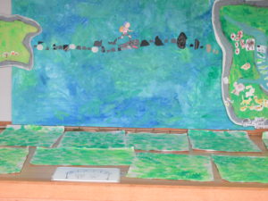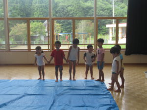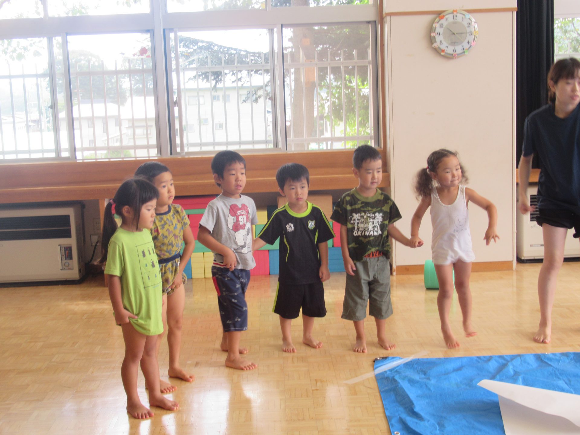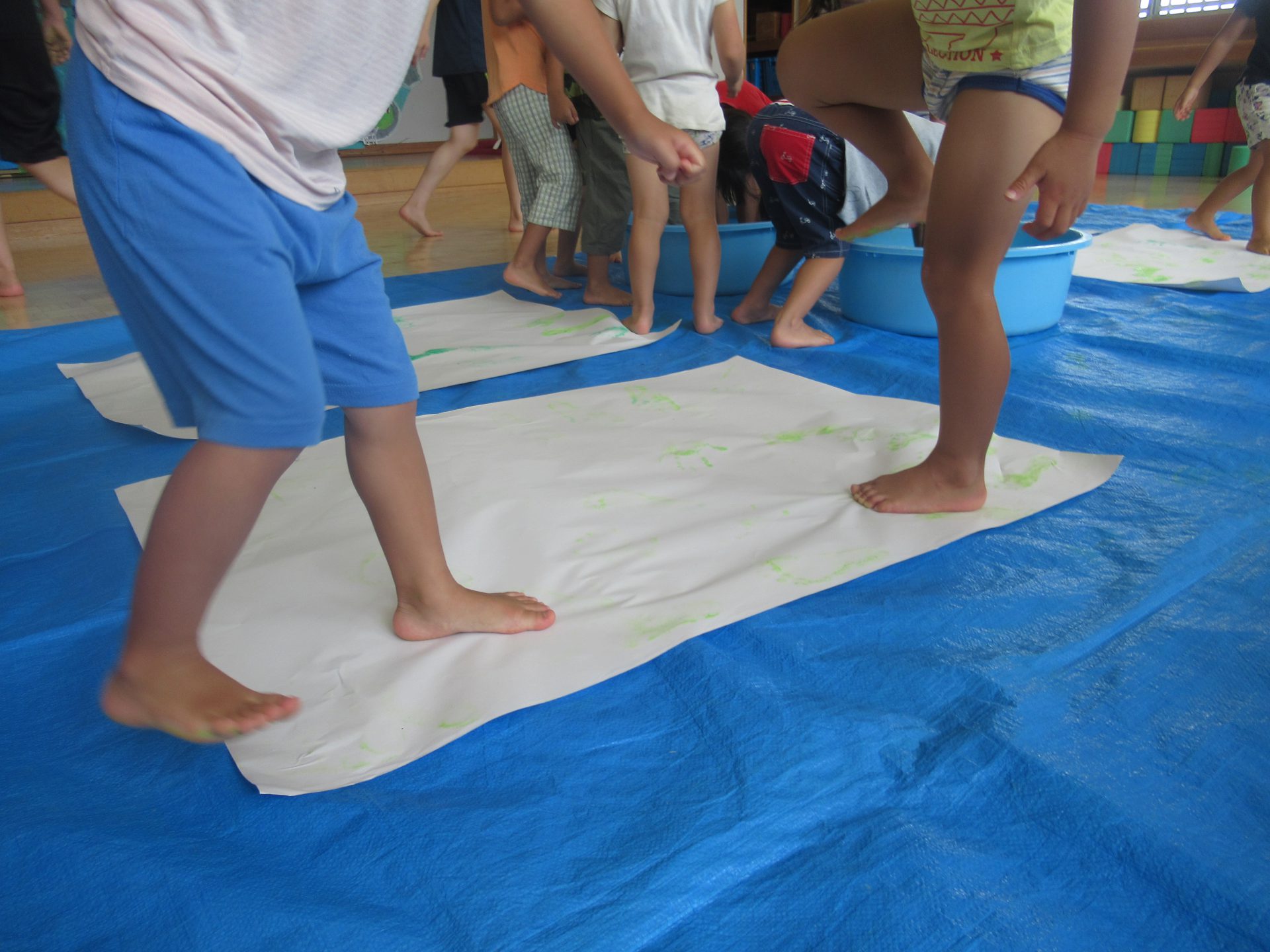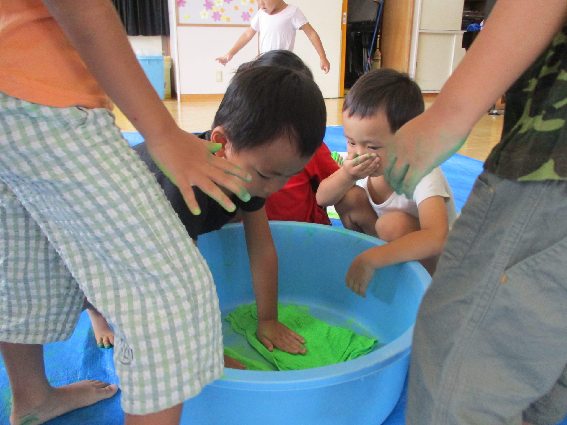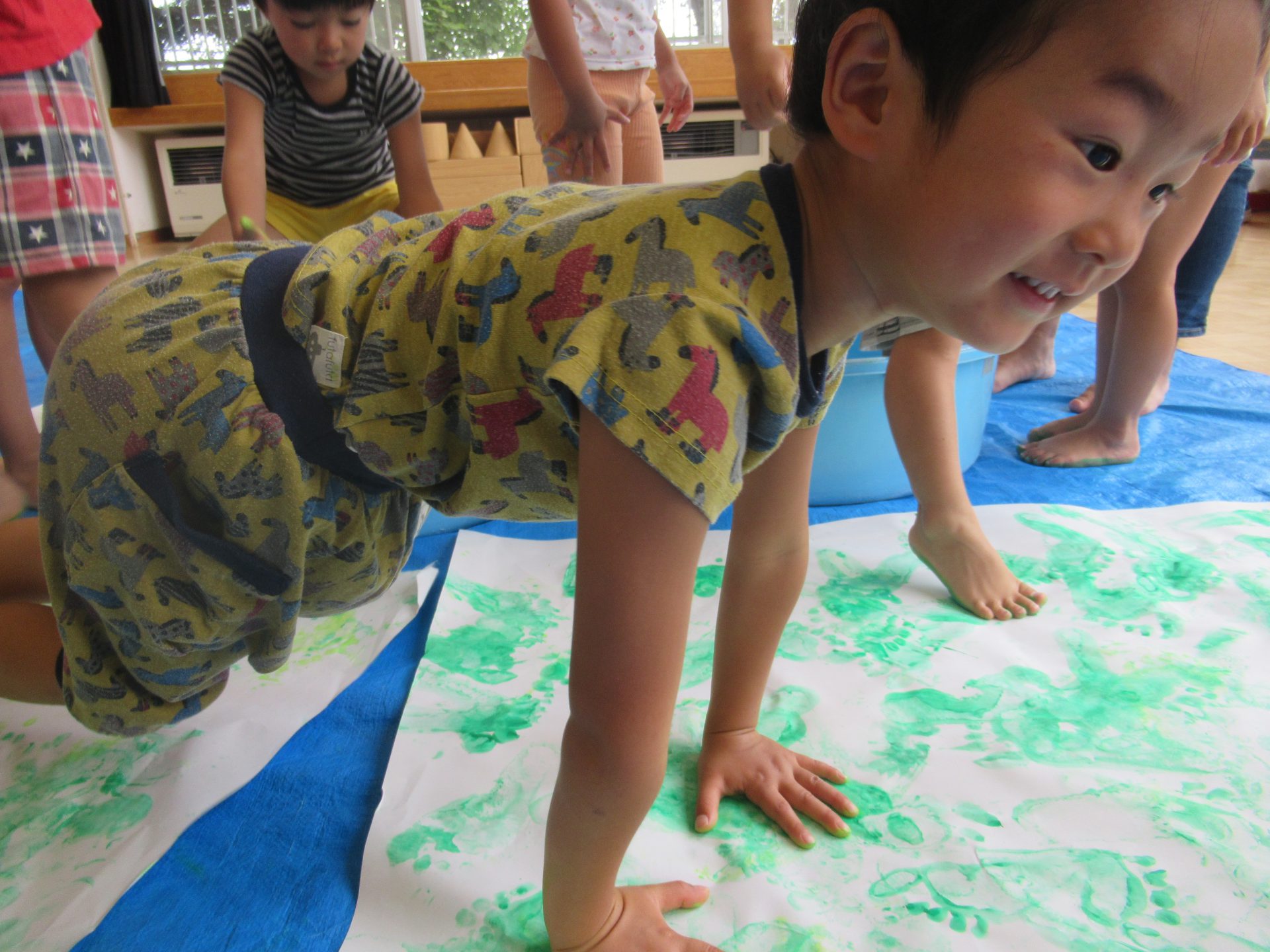 プール遊びと平行して楽しんでいた運動会ごっこ。より仲間意識を高めてほしいと思い、チームでの絵の具遊びを取り入れました。絵の具の感触を楽しんだり、匂いを嗅いだりして絵の具という素材に親しむ姿、「ここにペタってしようか?」「いいね。私はその隣にしようかな?」友達と一緒に活動することを楽しむ姿、年上の友達が年下の友達に「一緒にやろうか?」と関わりを深めながら思いやりを持つ姿等、1つの活動のなかで色々な子どもの姿に出会えることが出来ました。勝ち負けのある競技では、ジャンプして喜んだり上手くいかずに涙したりする姿が見られます。それでも、「また頑張ろう!!」「負けちゃっても大丈夫」を伝えていきながら、次へのパワーとなるように寄り添っていきたいと思います。