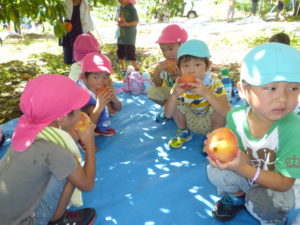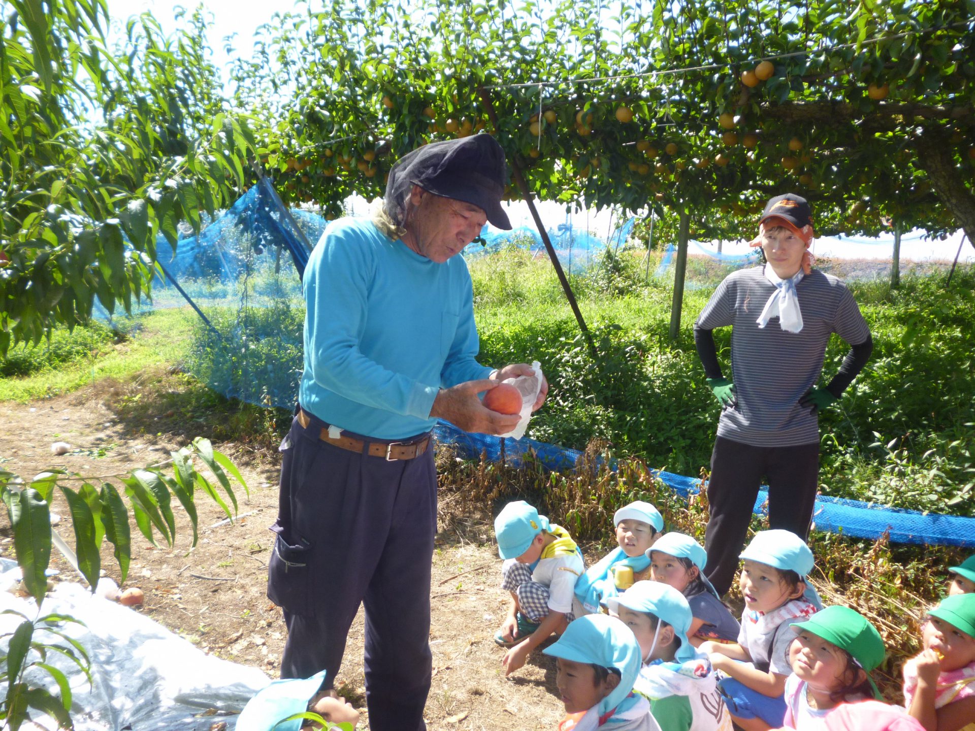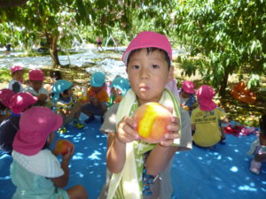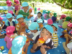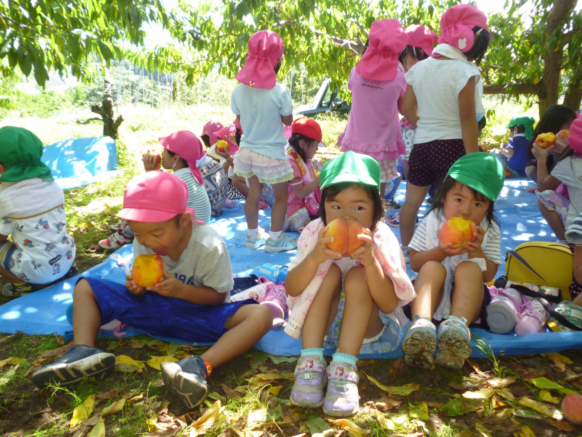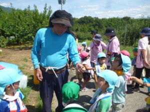 頃、年長さんを桃畑に呼んで頂いたしもむらさんが「桃がいい具合だけど、採りにくるかな?」と声をかけていただけたので遠慮気味に以上児全員80名でニコニコ向かいました。まず、しもむらさんから桃狩りの約束をききました。