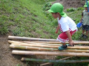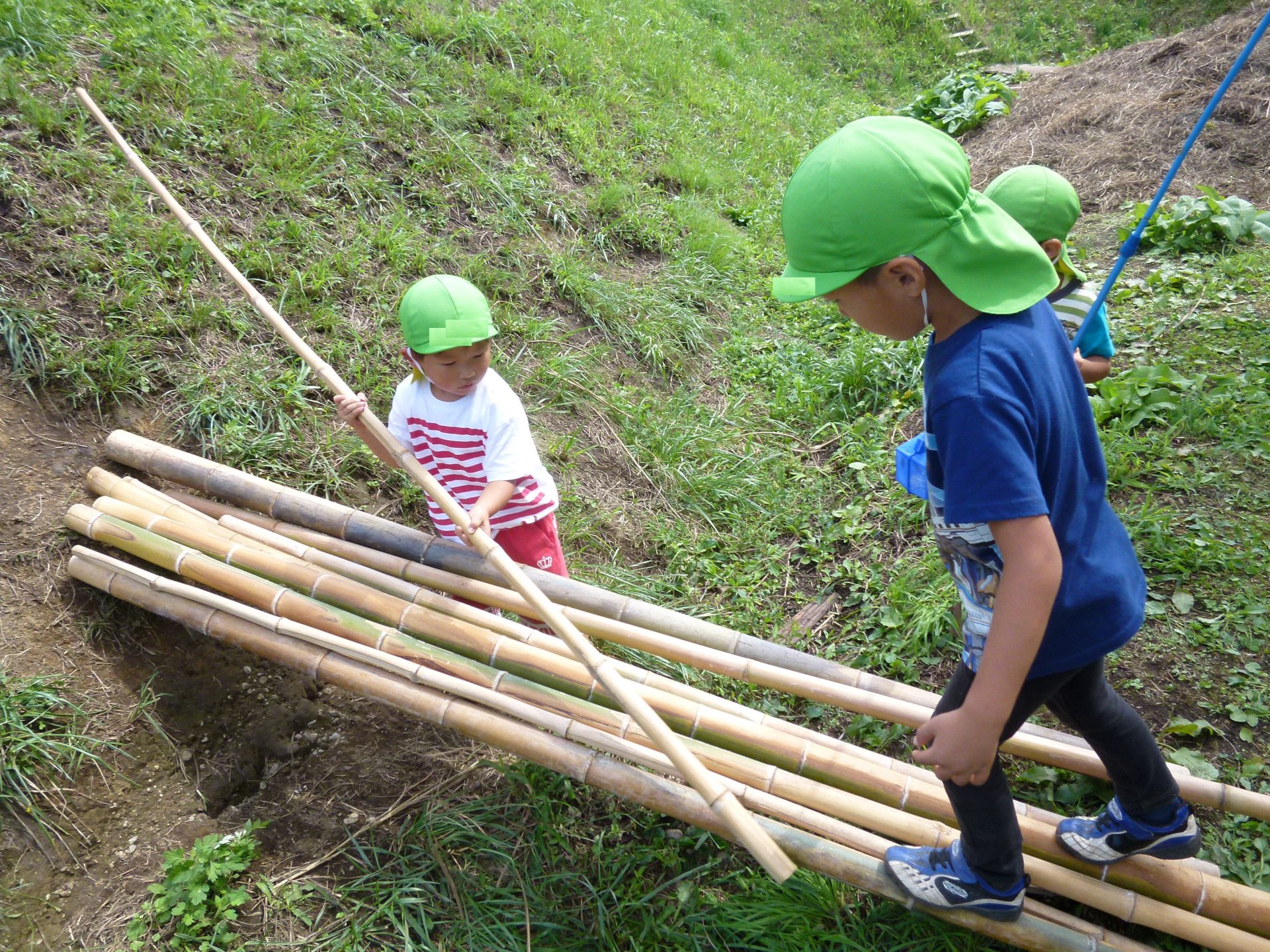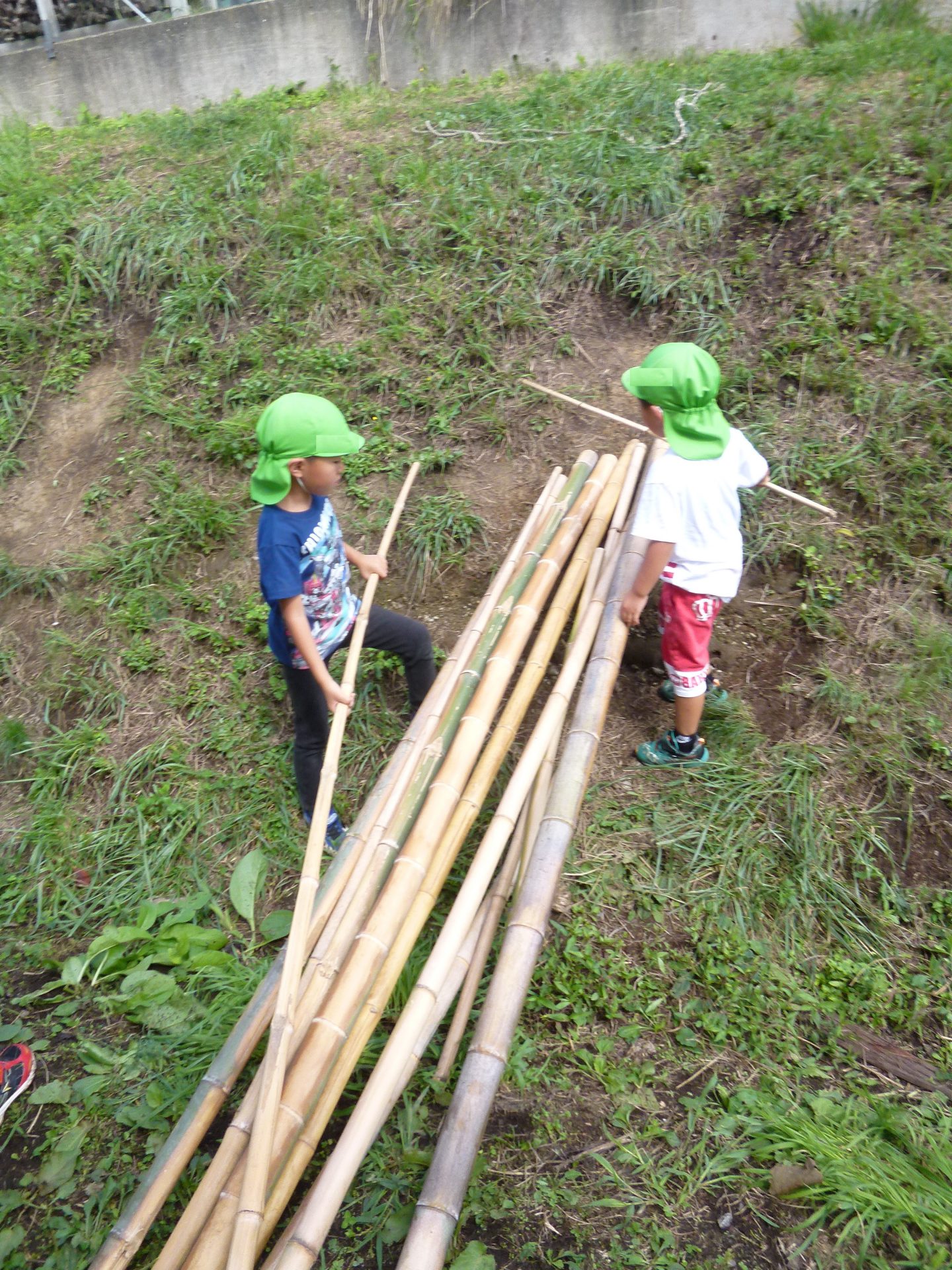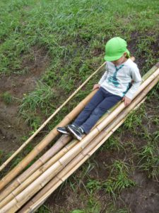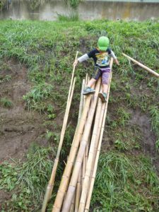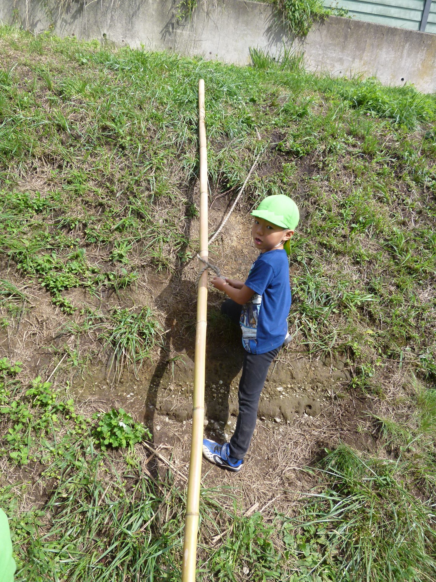 最初は1本の竹のを土手登り用のロープにくくり付けロープが上にいかないようにしていたことから、