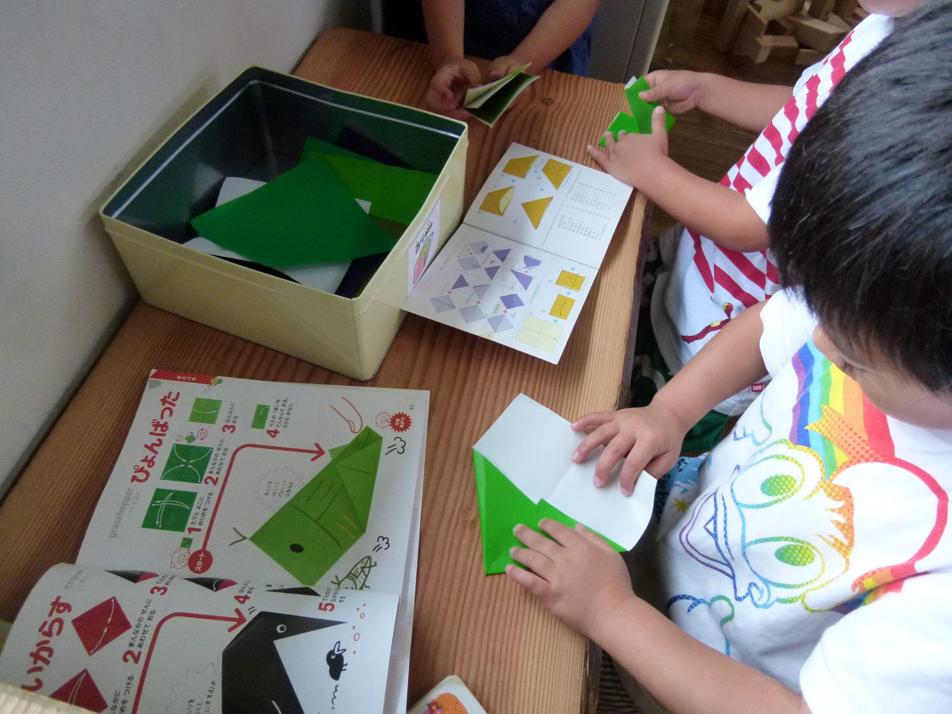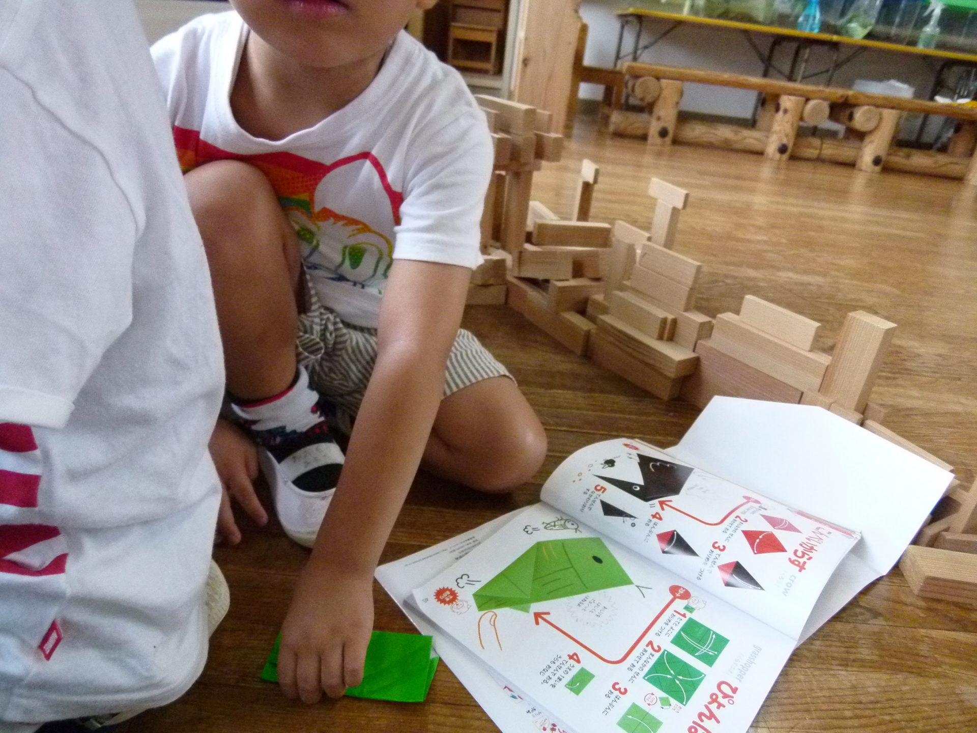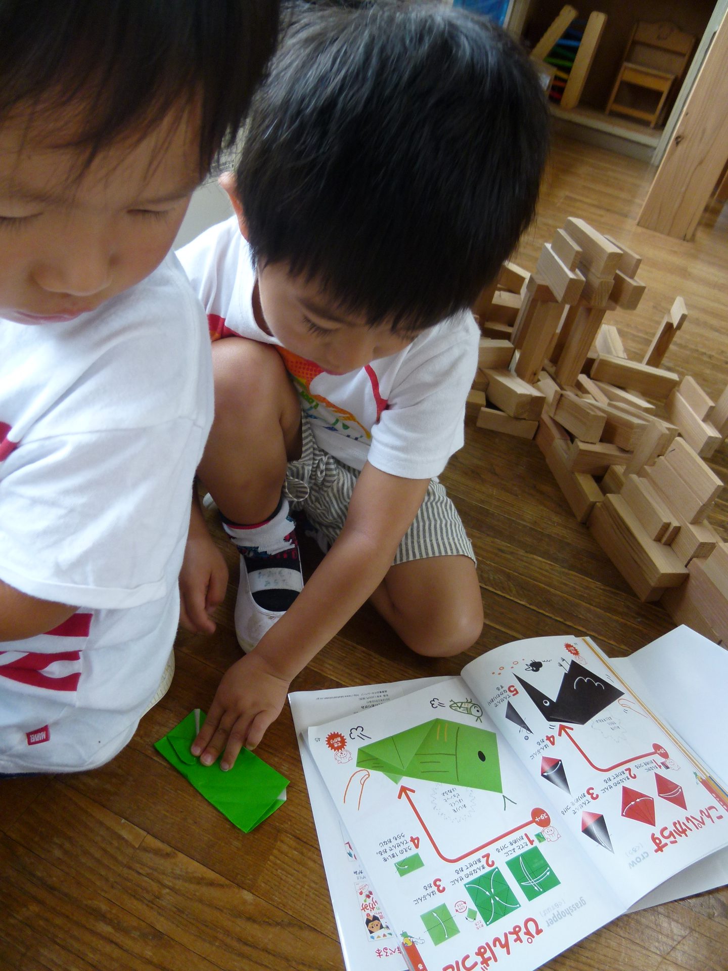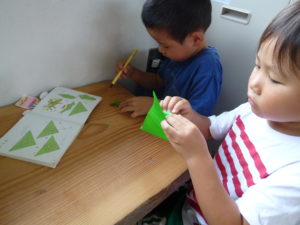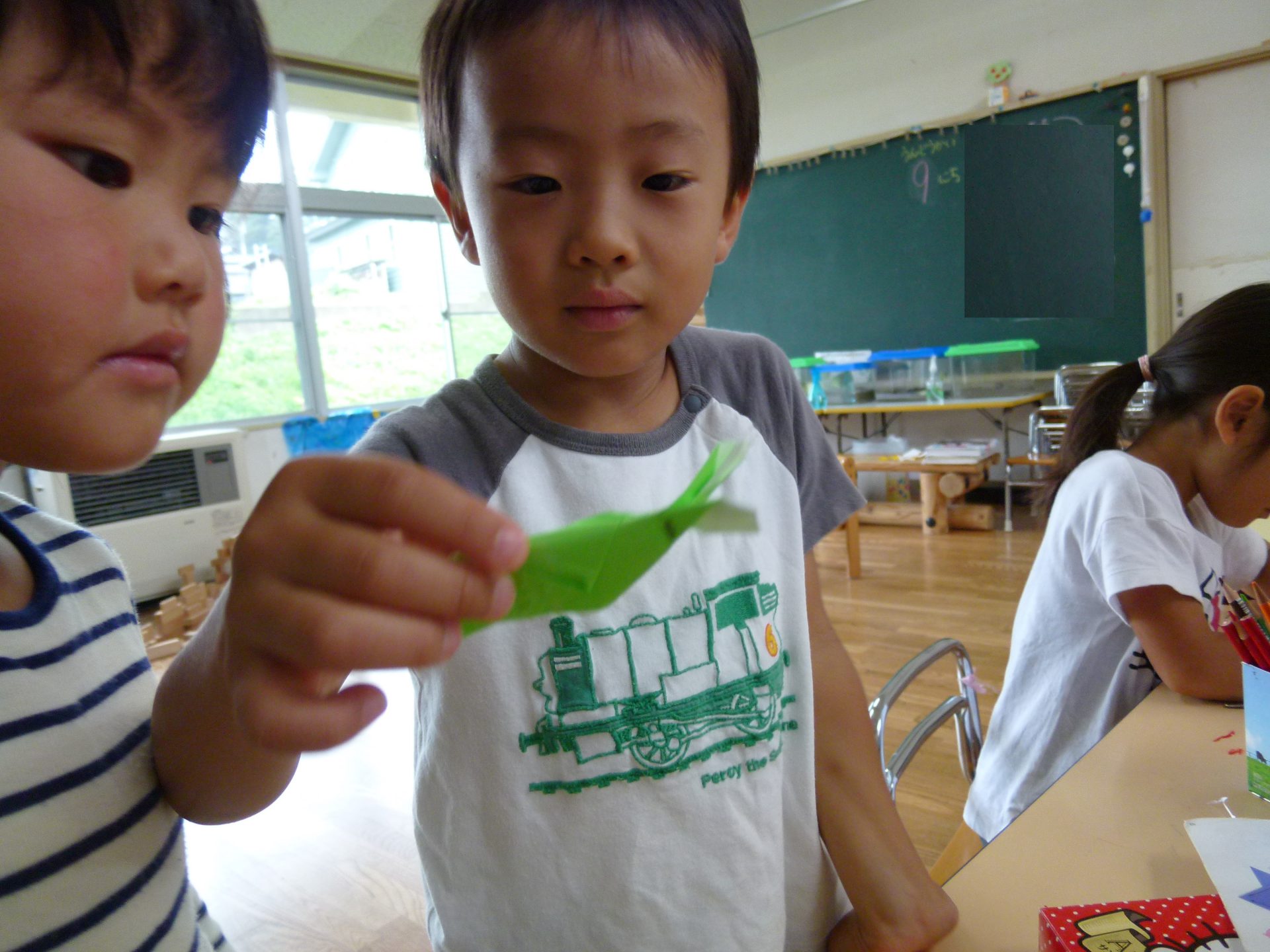 身近な小動物への興味関心から捕まえて観察し、お部屋でも折り紙で友達と一緒にバッタを作ったり、、