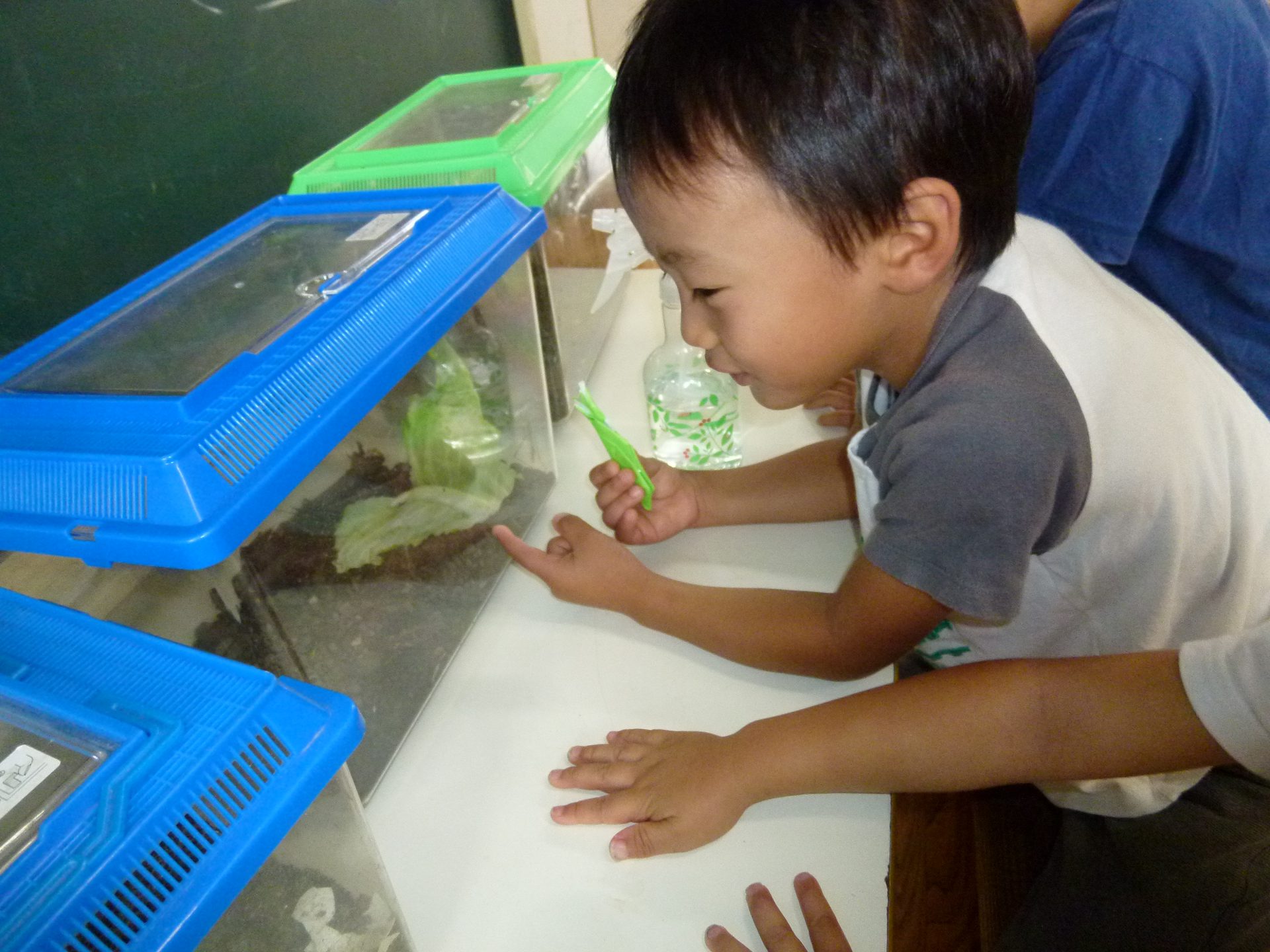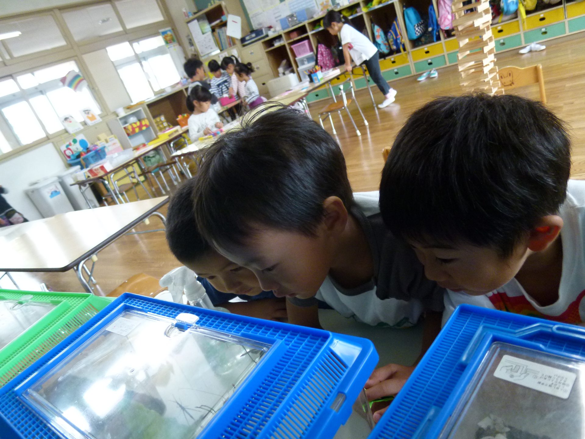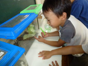 捕まえた虫たちは部屋へ持っていき、観察する子どもたちです。