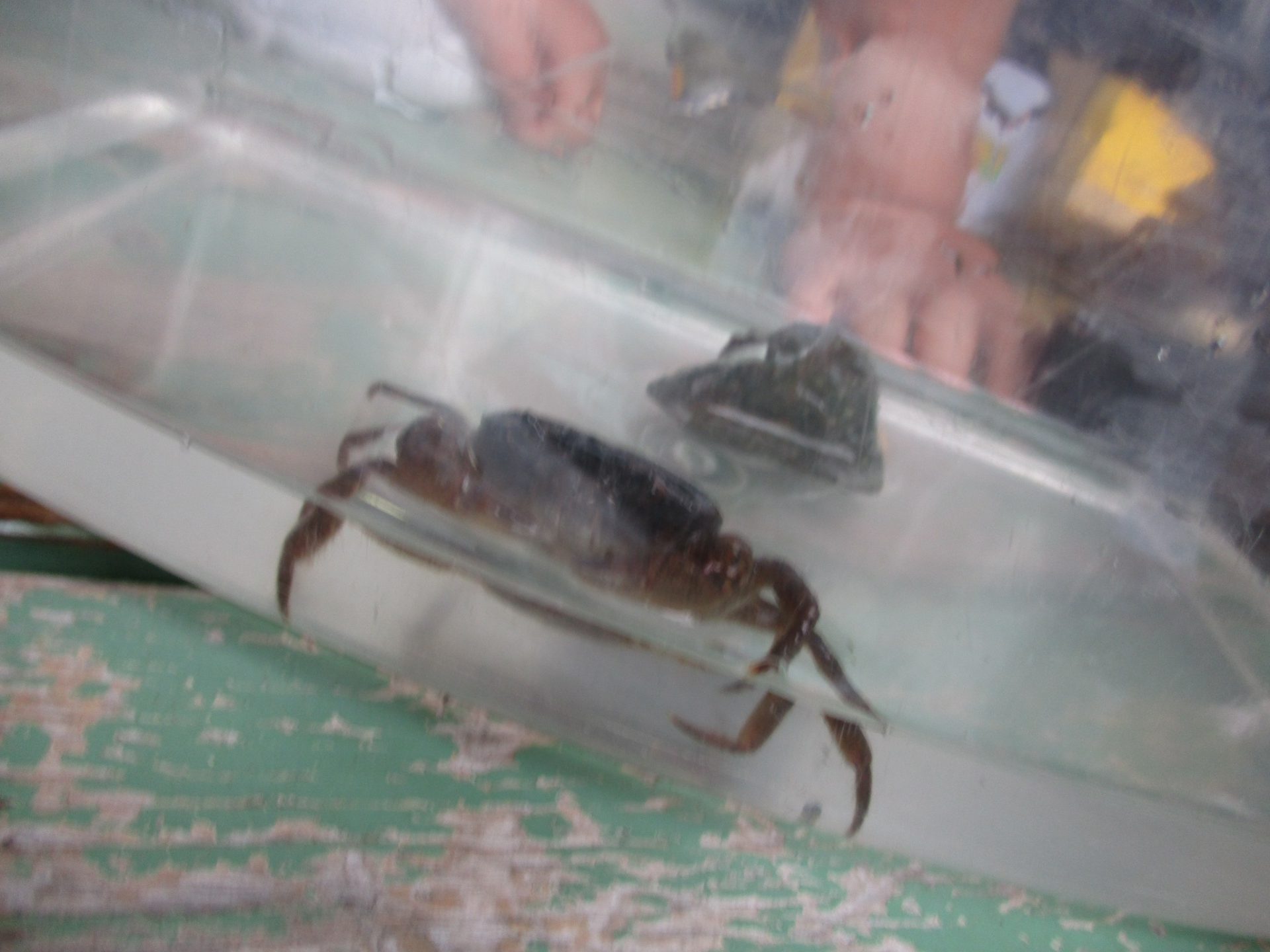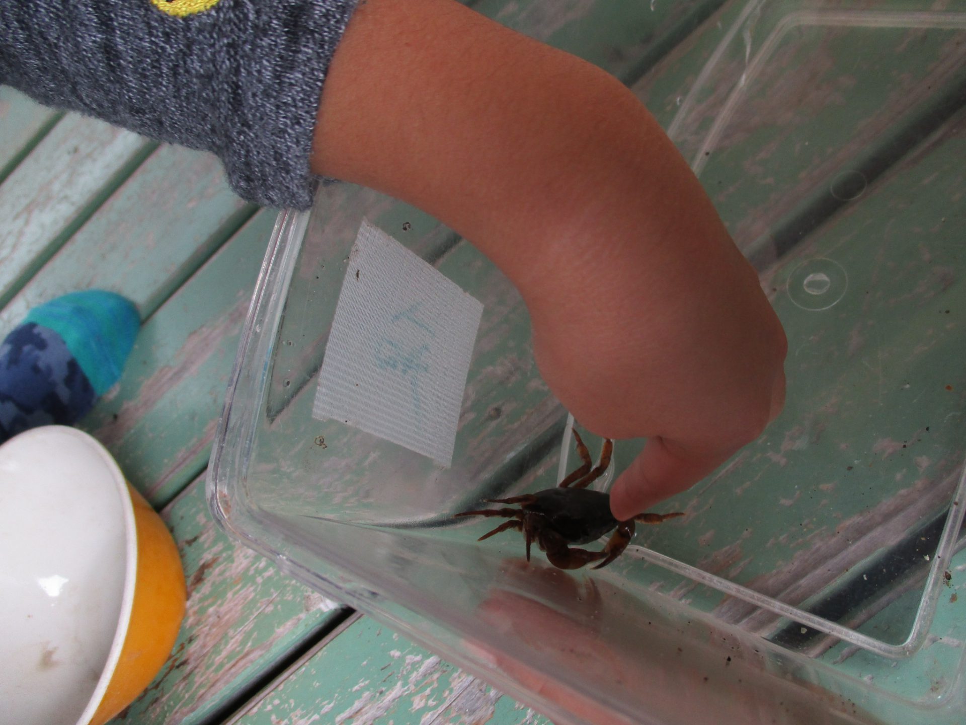 かにがびっくりしないように、そ〜っと人差し指をのばしていました。