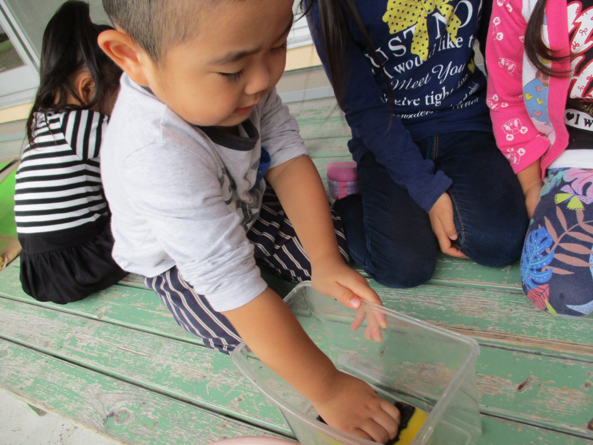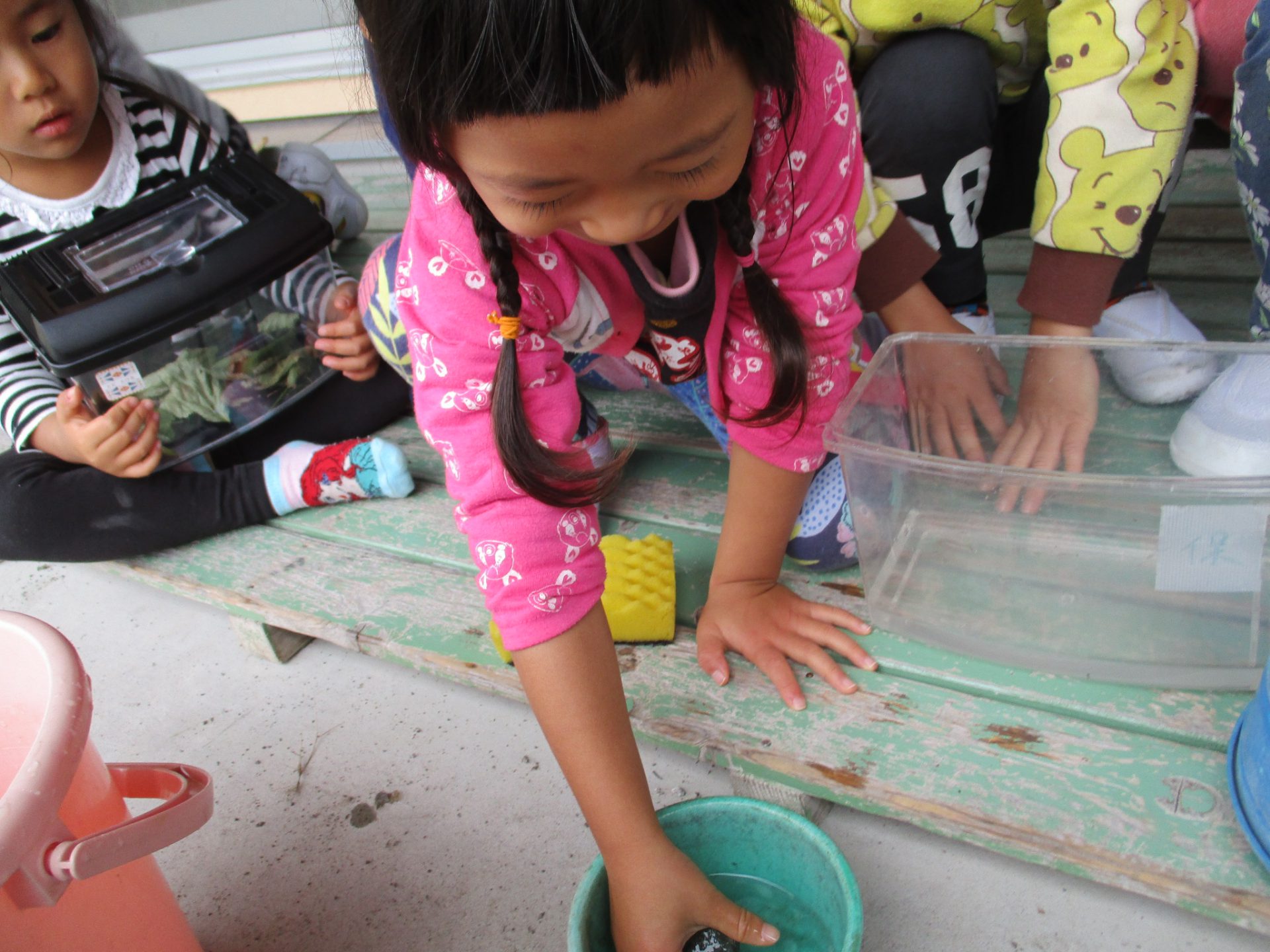 戸外で遊んでいたときに、かにを発見した年少さん。