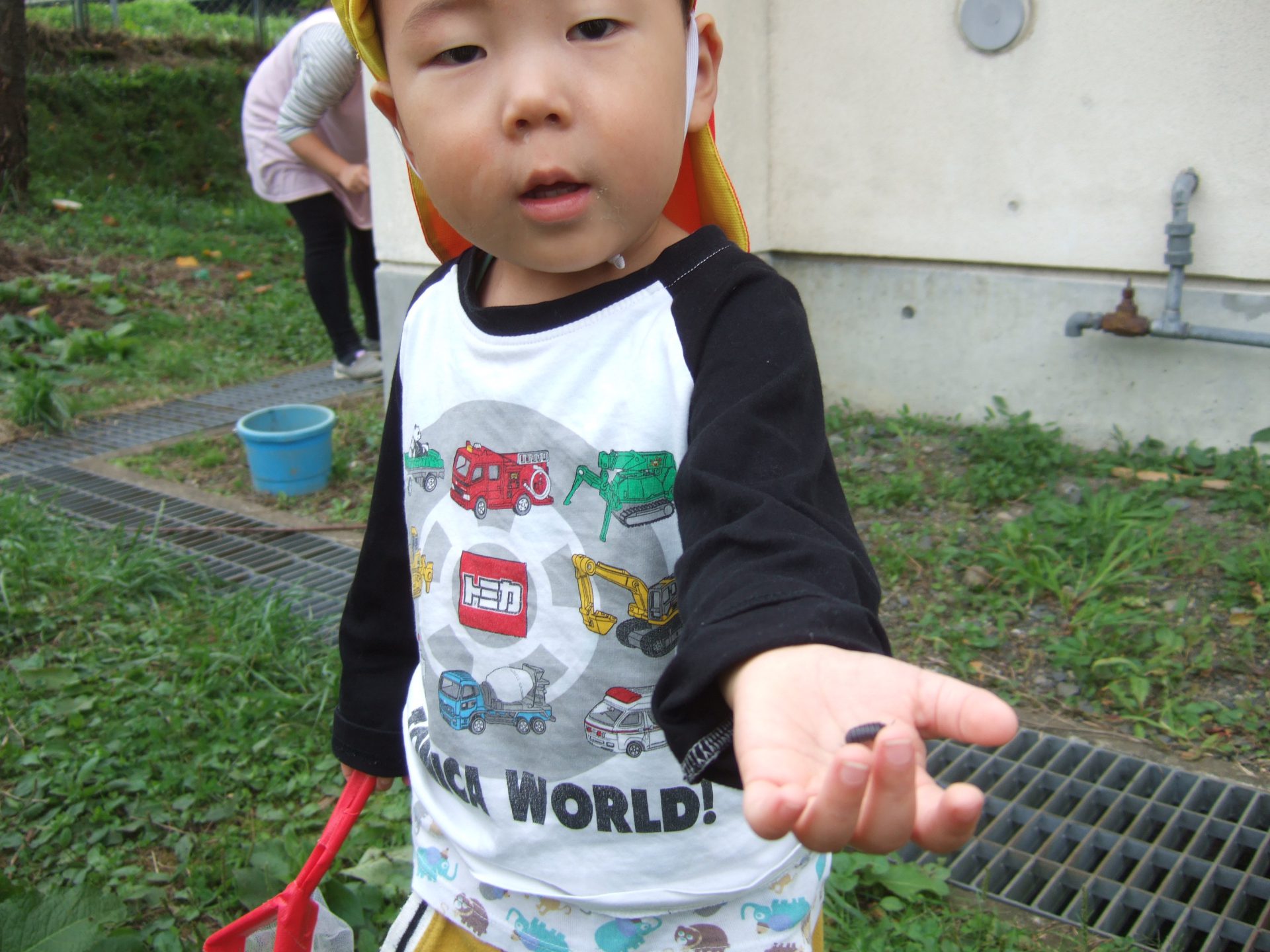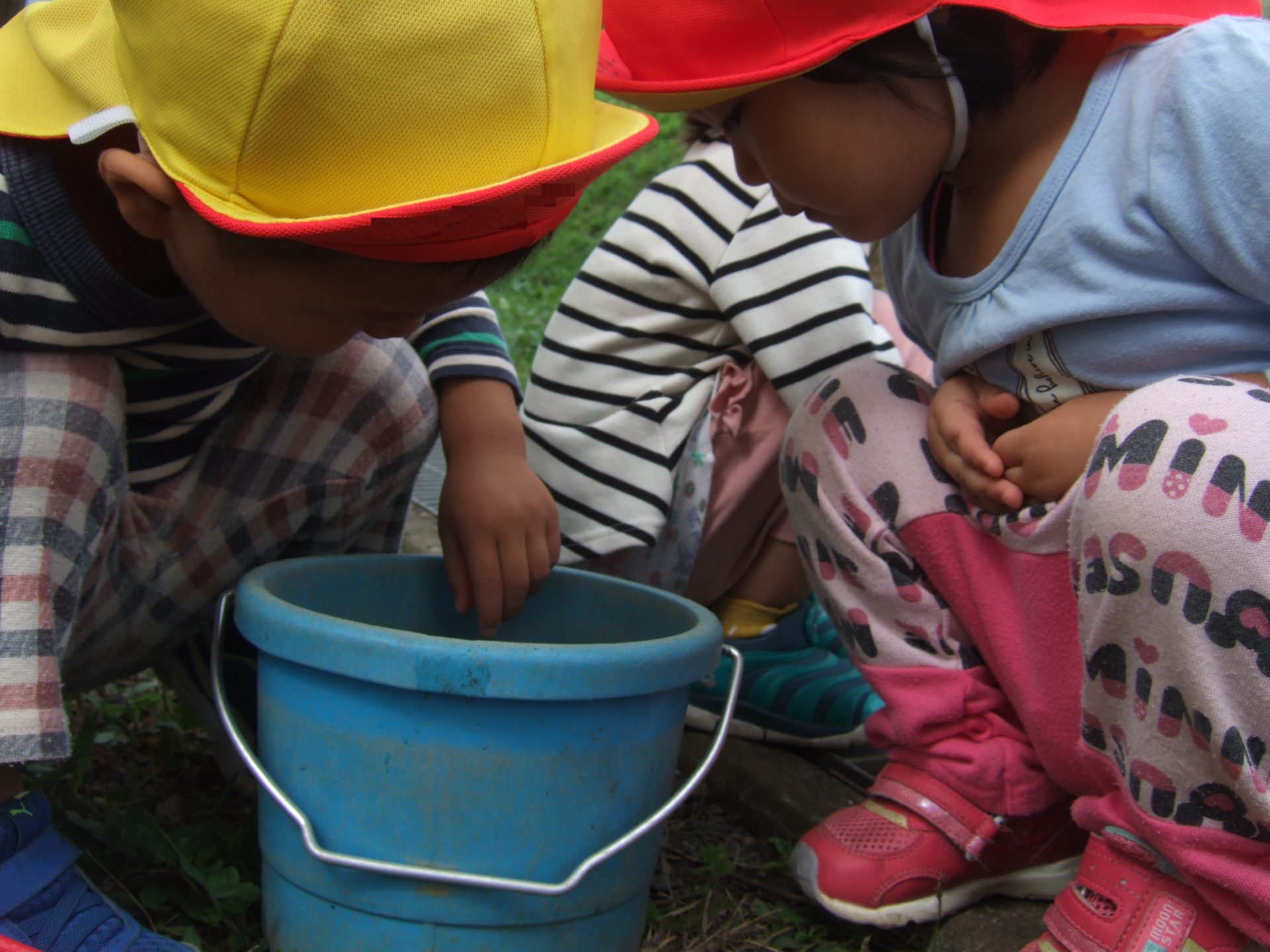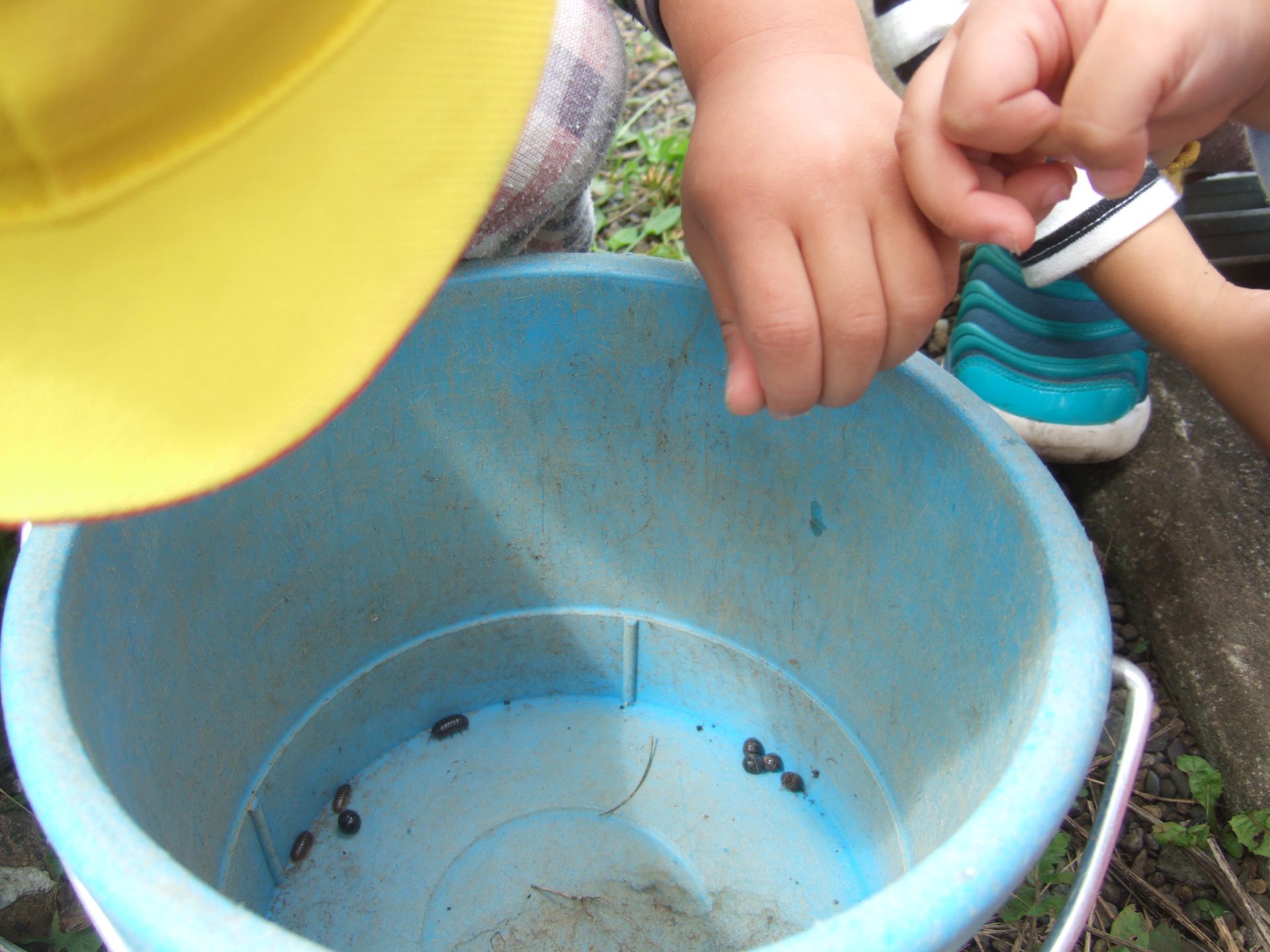虫網は狭くてよく見えないから、とバケツにダンゴムシを入れているお友達も。