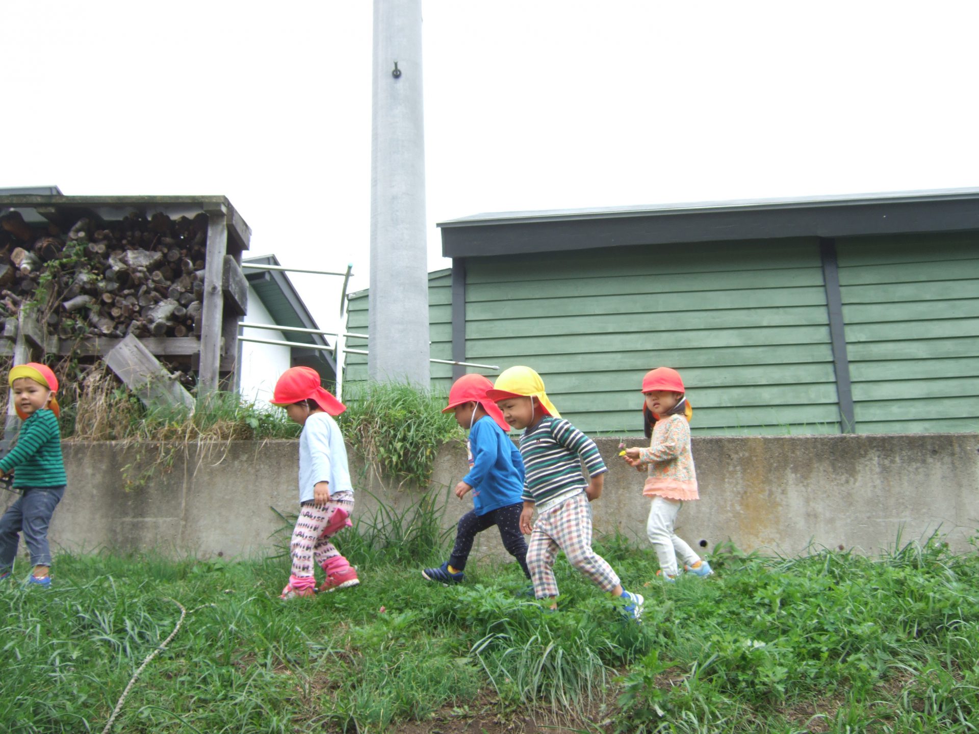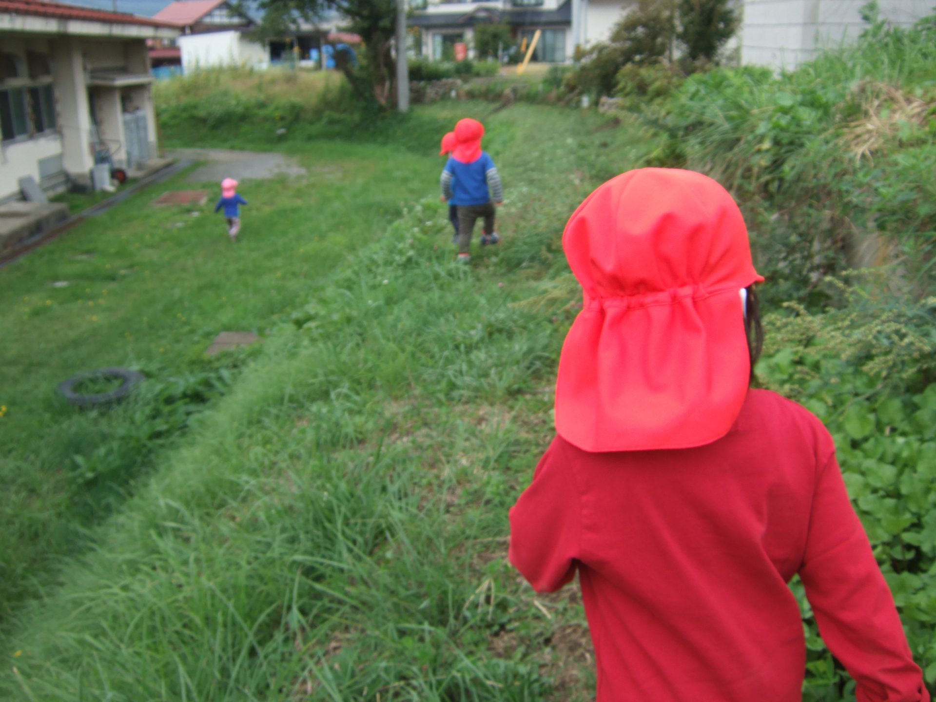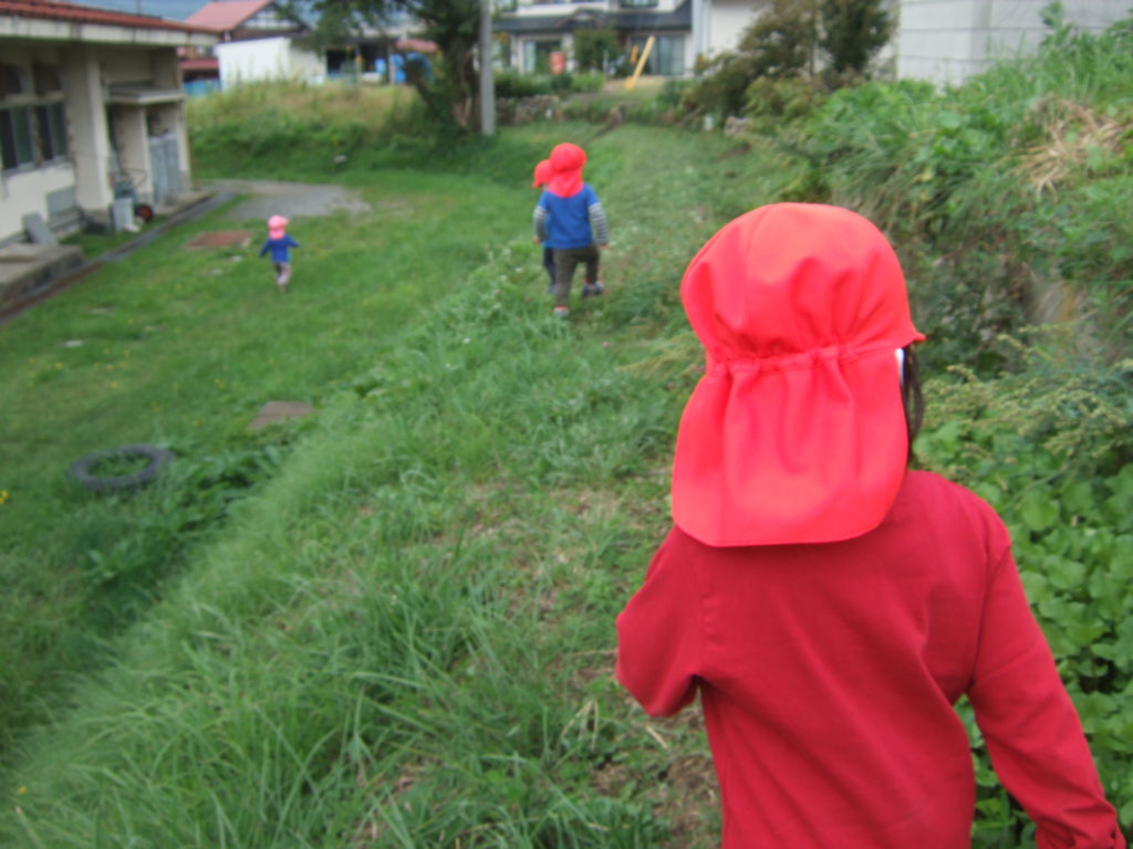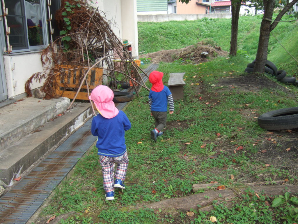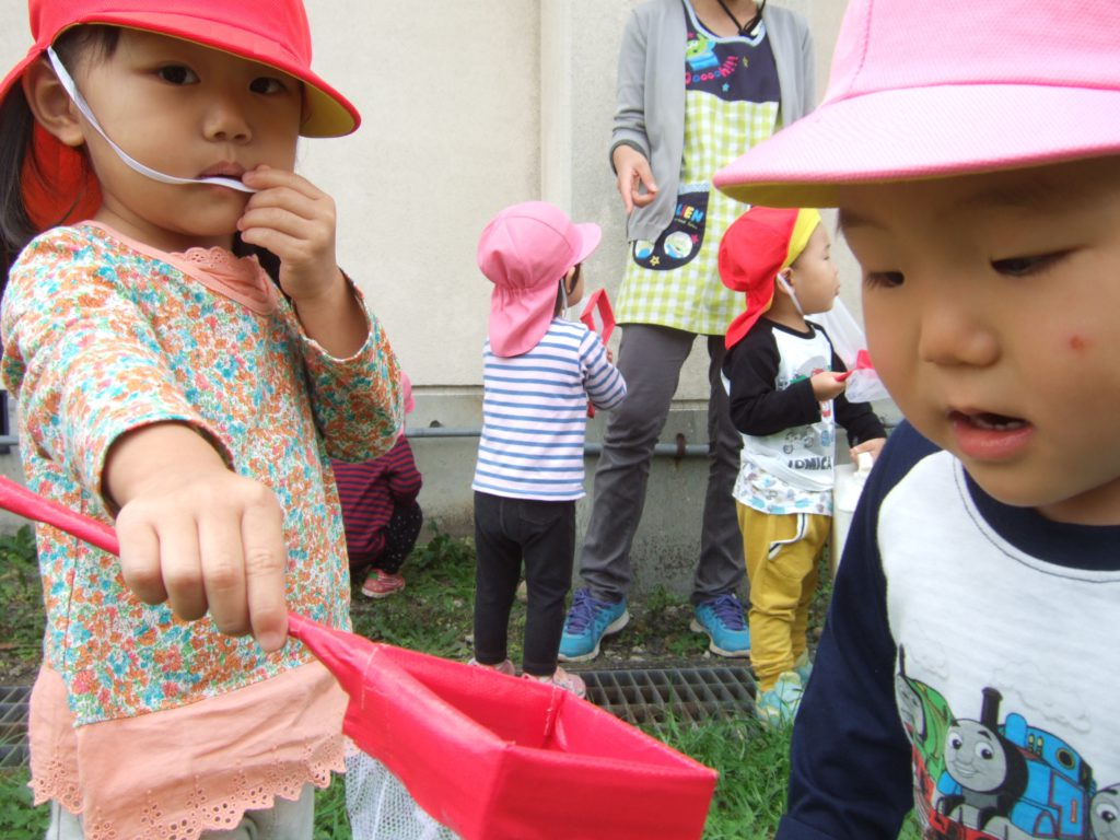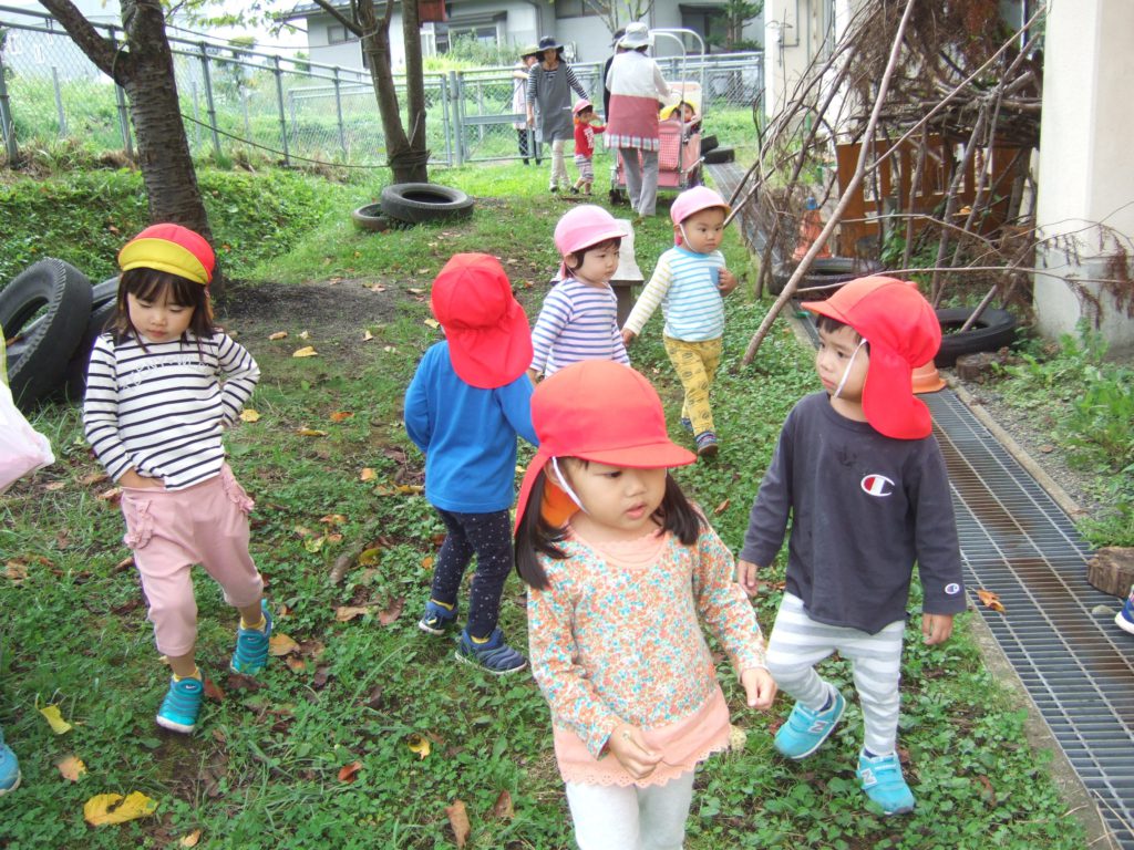 園庭やわくわく広場に出ると、木の実や葉っぱ、虫などの自然とたくさん出会えます。これから秋の深まりとともに、虫の鳴き声や、どんぐり松ぼっくりなど様々な秋をたくさん感じられる時期になりますね!園庭やわくわく広場で遊んだりお散歩出かけたり、身近な環境で遊ぶ中で、聞いたり、見たり、触れたり、嗅いだりする子どもの感覚に心を傾け、子どもの発見や感動に寄り添いながら、子どもの感性が豊に育つようにしていきたいです。