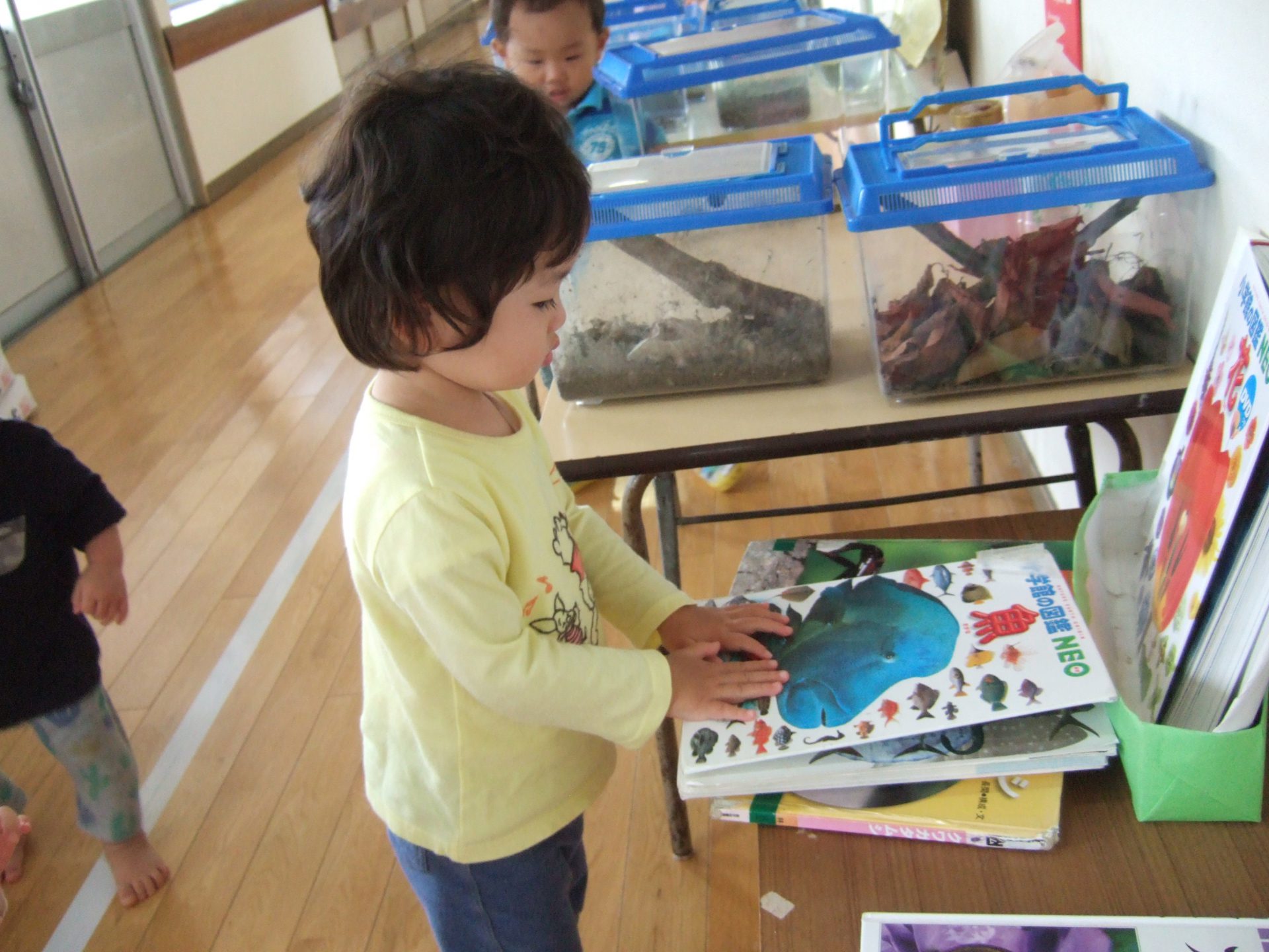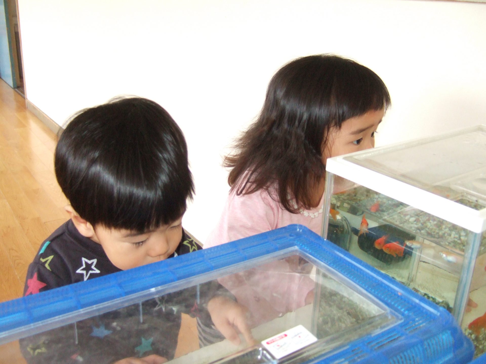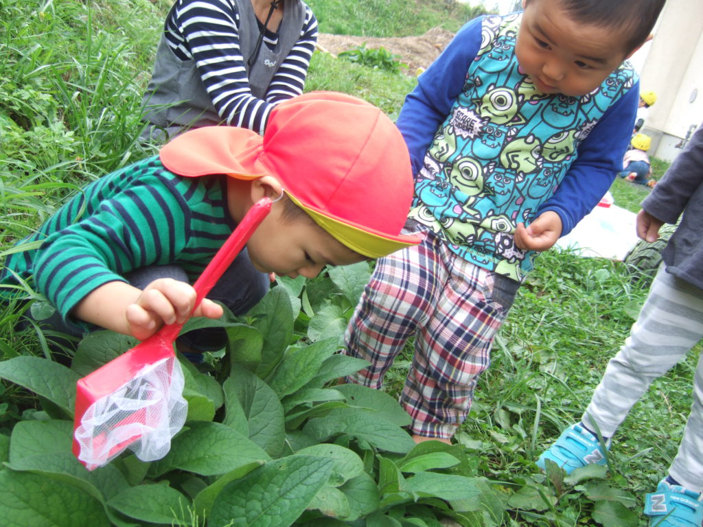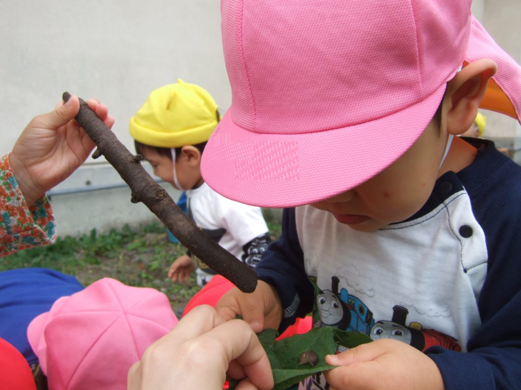 今までは通りすぎていましたが、最近はぶどうさんのお世話をしている生き物たちに興味津々の子どもたち。虫かごや水槽を覗き込むと、じーっとよーく見ていてなかなかその場から離れません。夢中なんです!成長とともに様々なことに興味を広げているのだなぁと嬉しく思います。