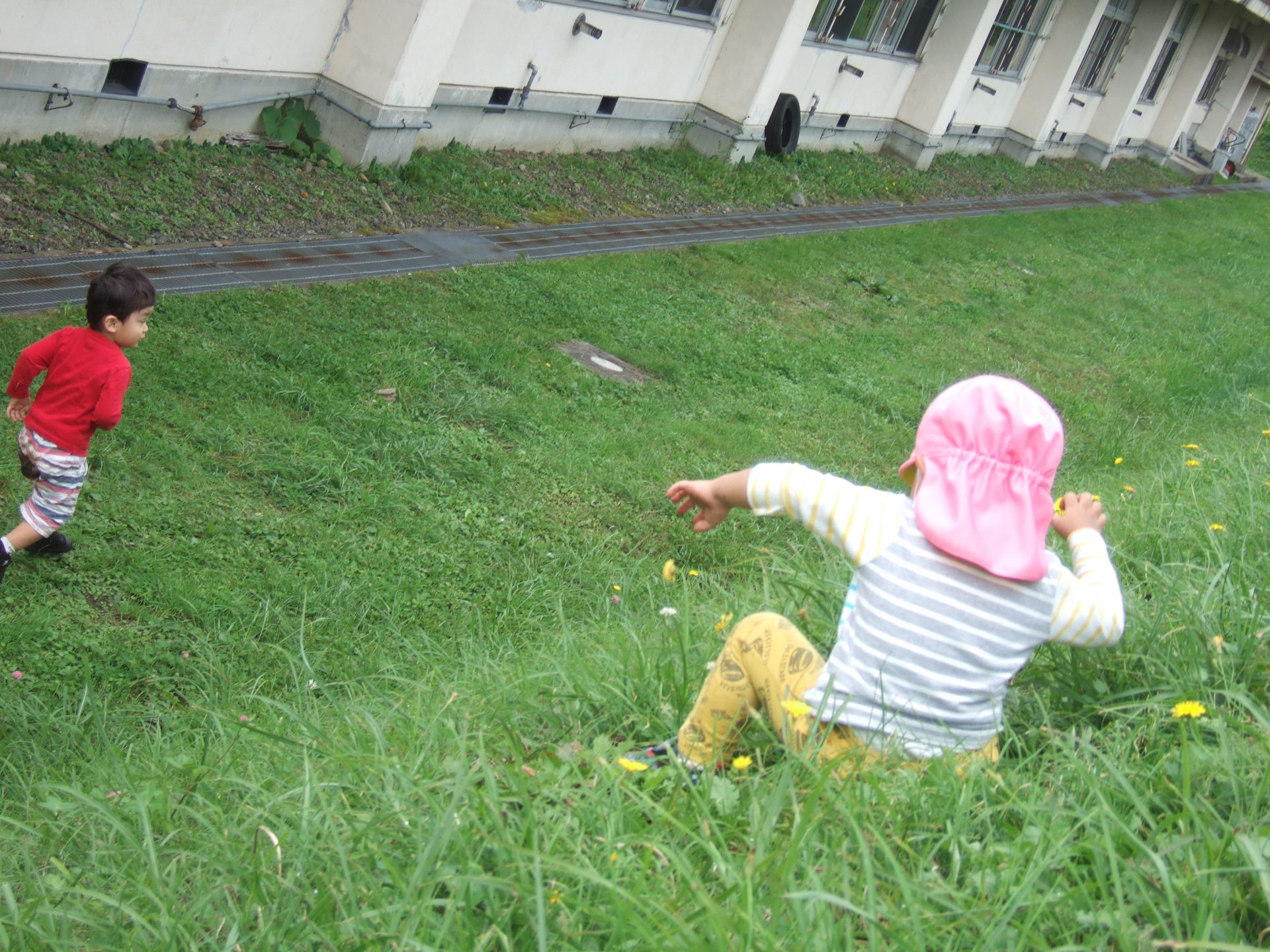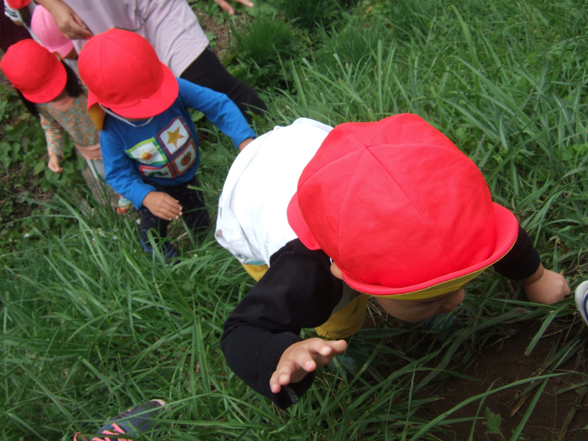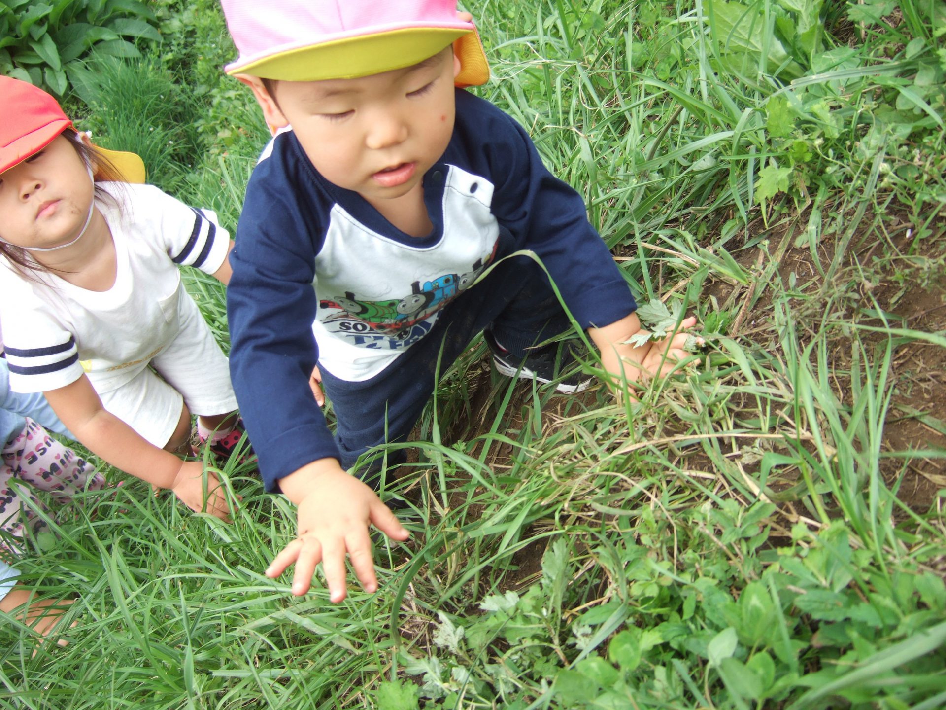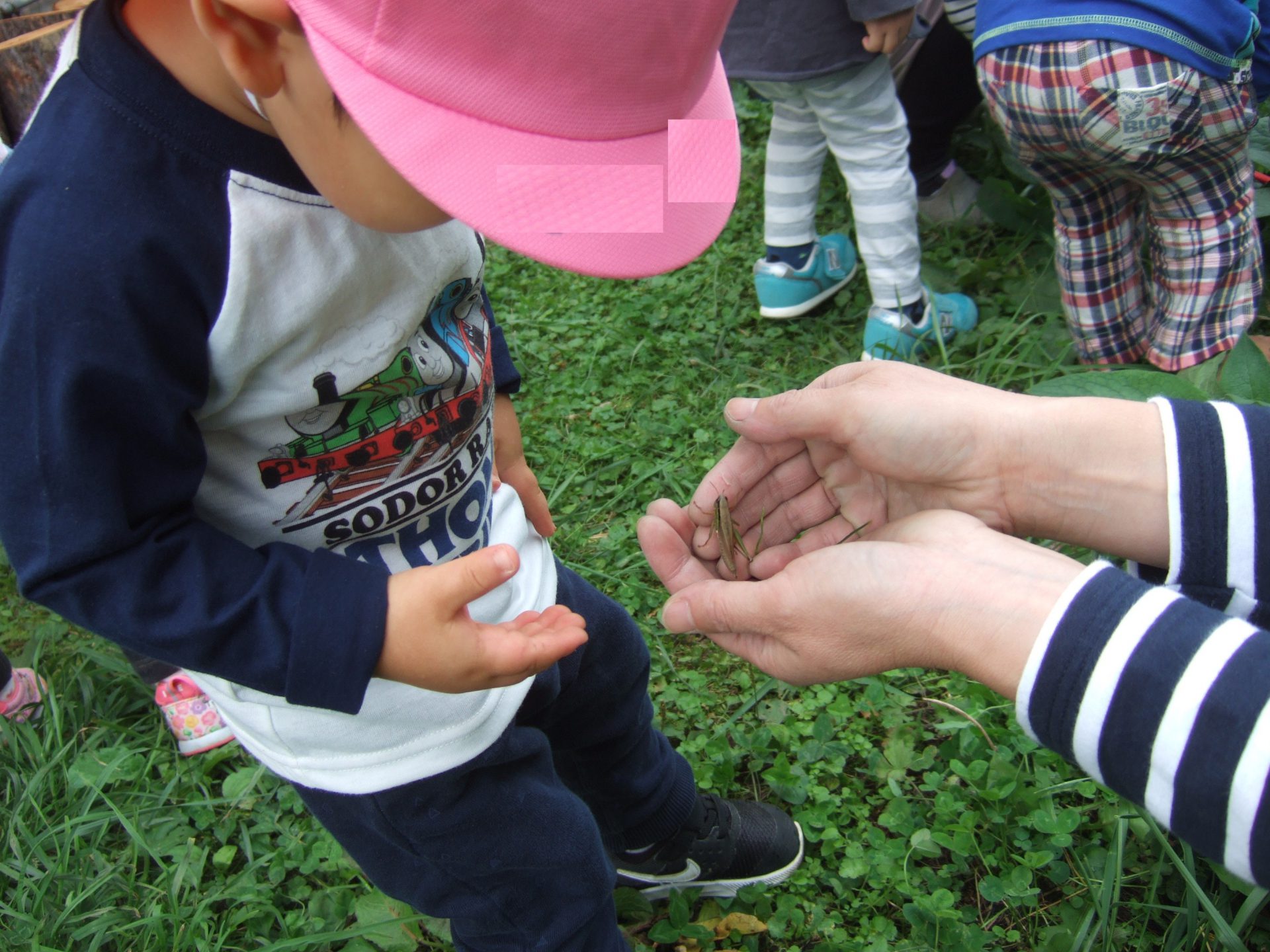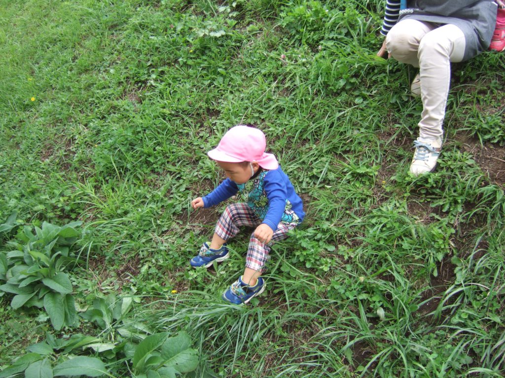 「虫探ししたい」とはりきっていたお友達、早速バッタを見つけました