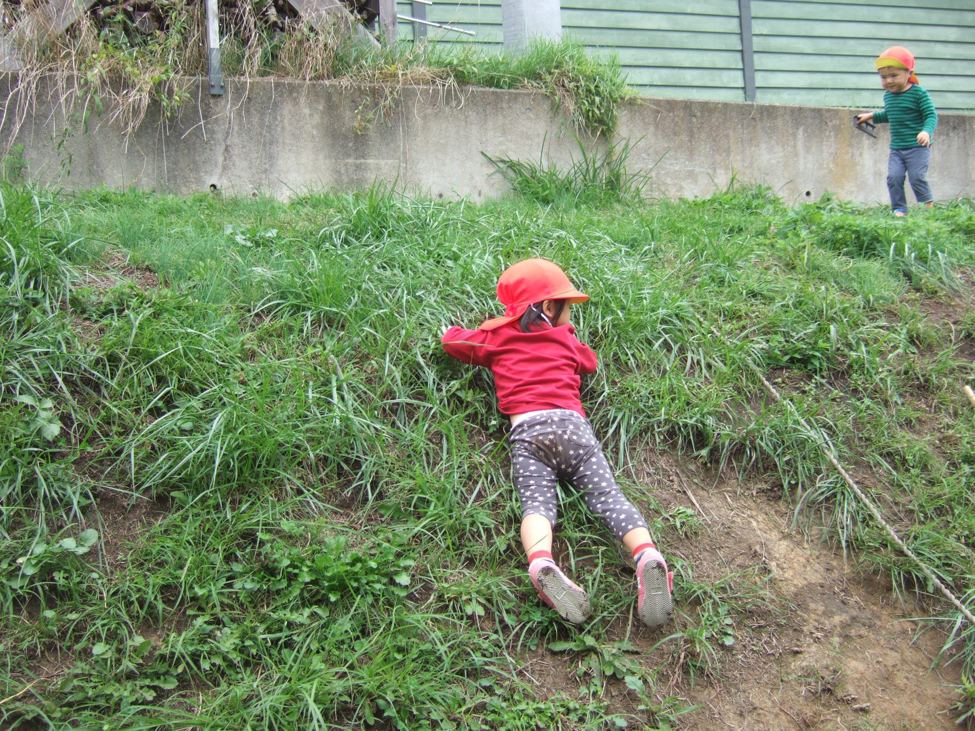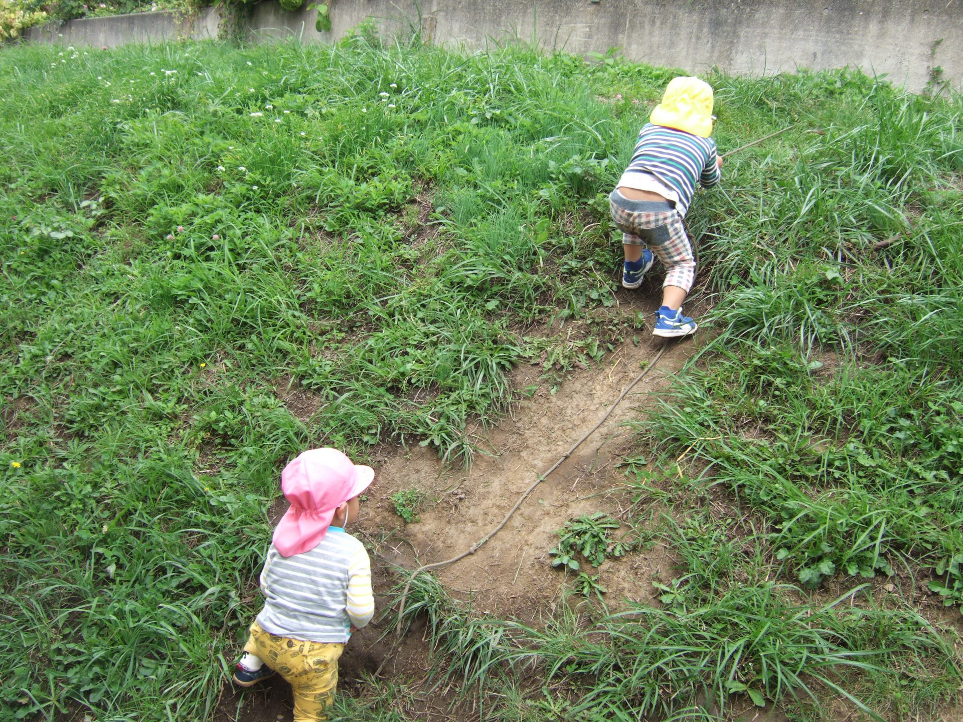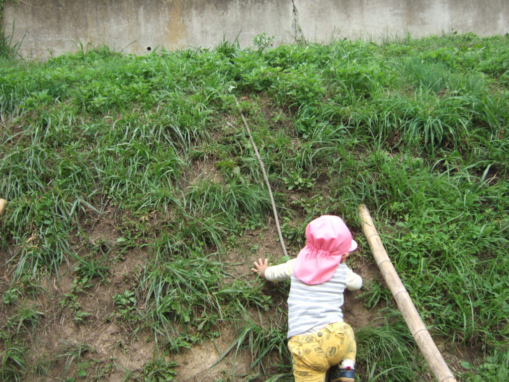 木のはしごを使って土手登りをするお友達。