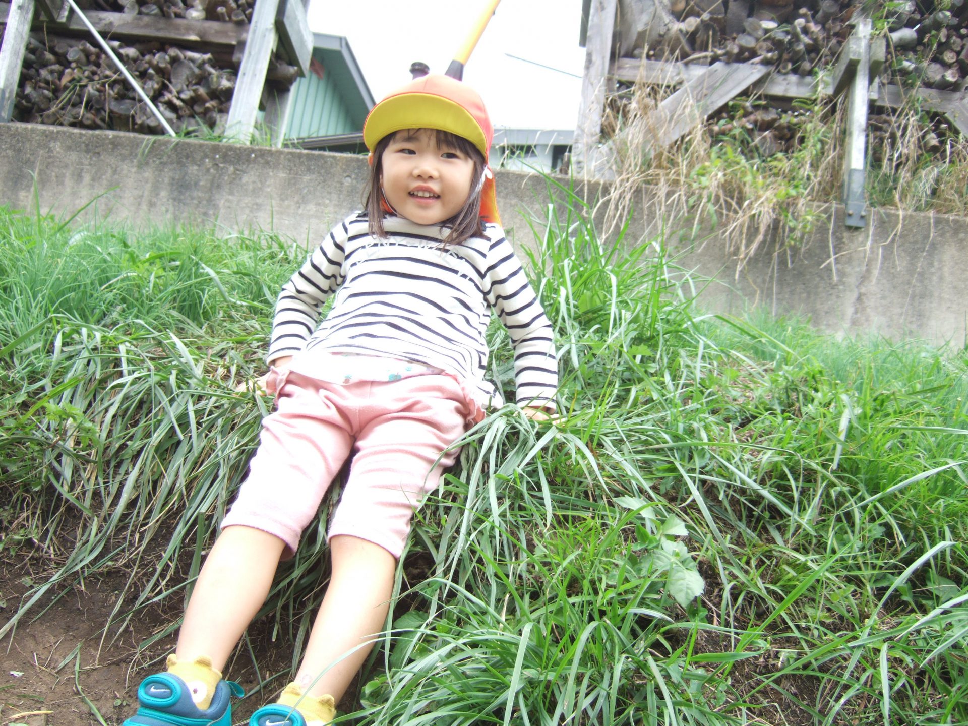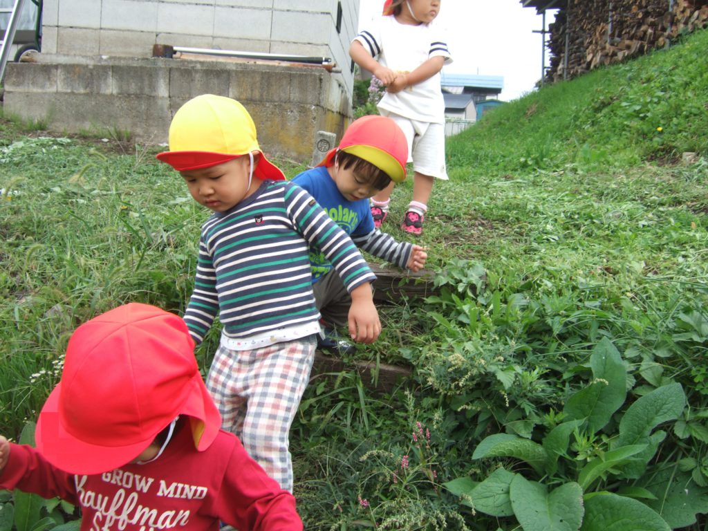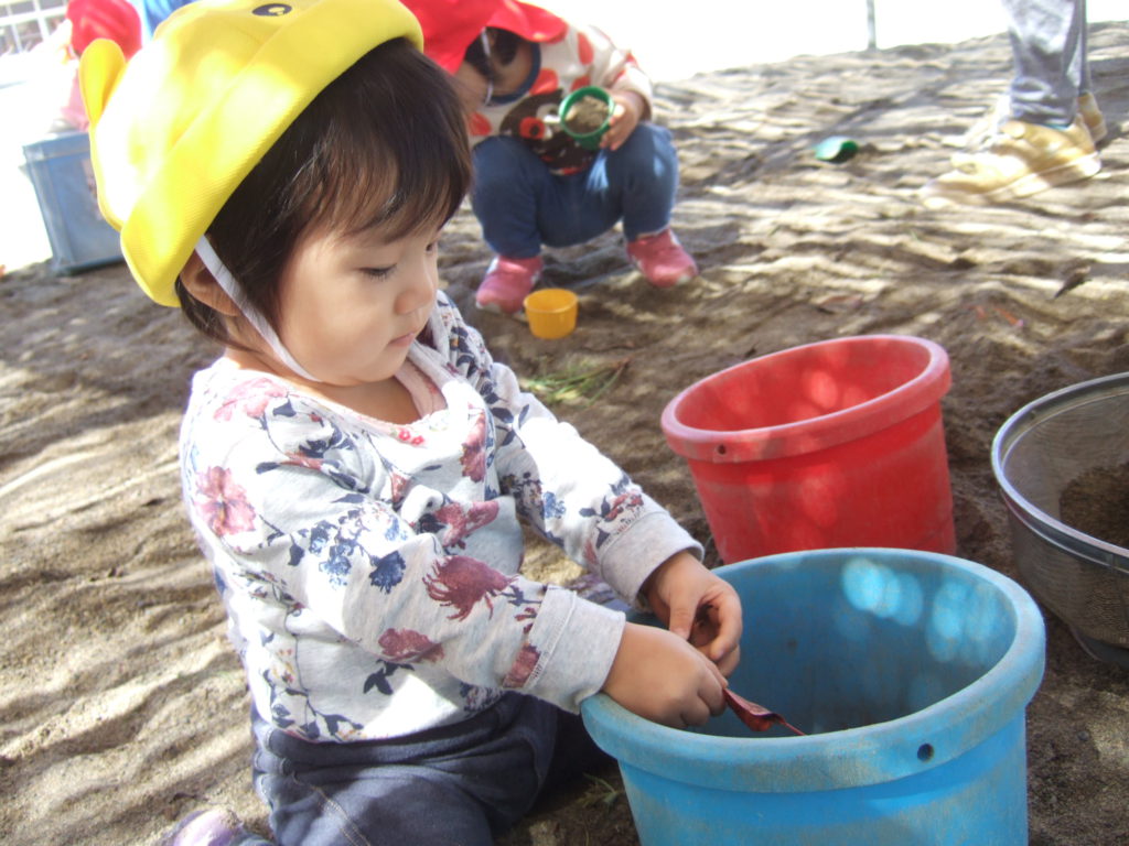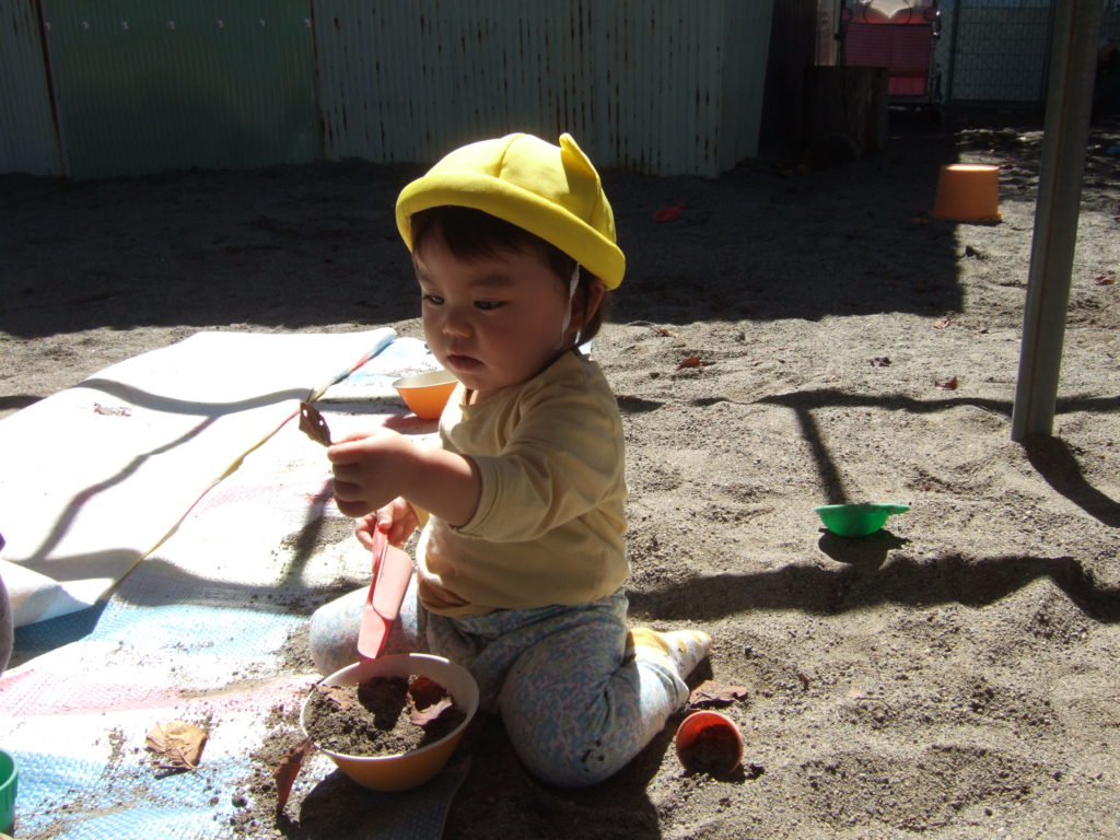 今までは未満児さんのお砂場で遊んでいた0、1歳児のあんずさんですが、活発になってきて未満児のお砂場じゃ物足りない!もっと体をたくさん動かしたり探索をしたり、興味も広がっているのでもっと遊びが広がるようにと園庭デビューをしました!
