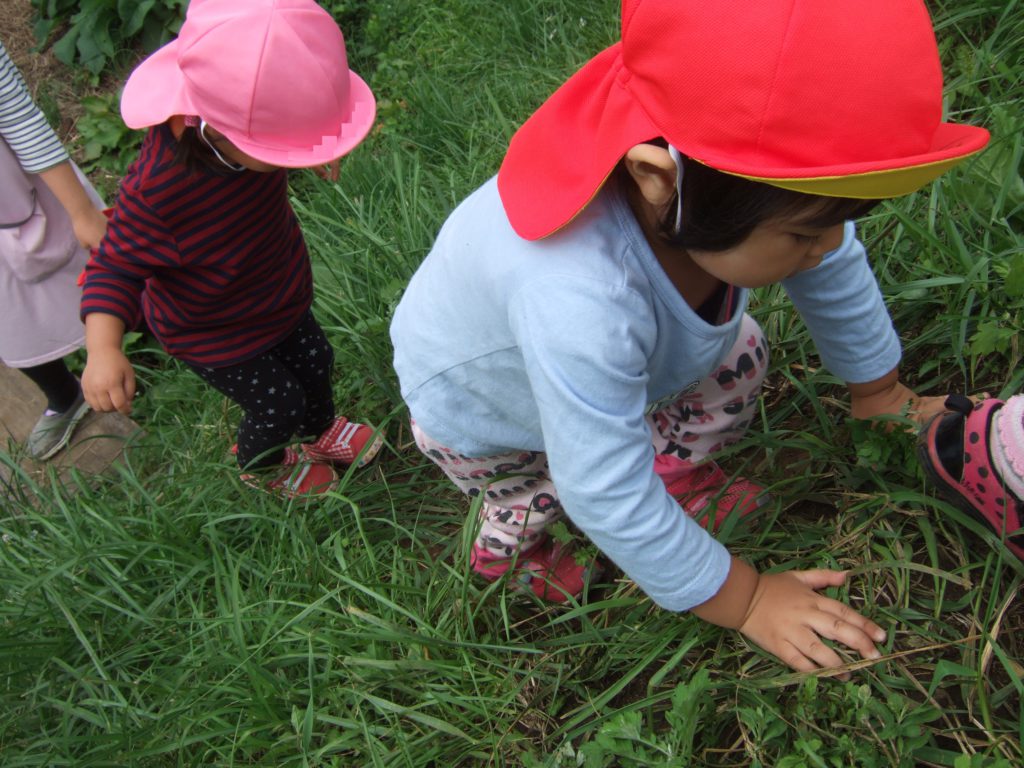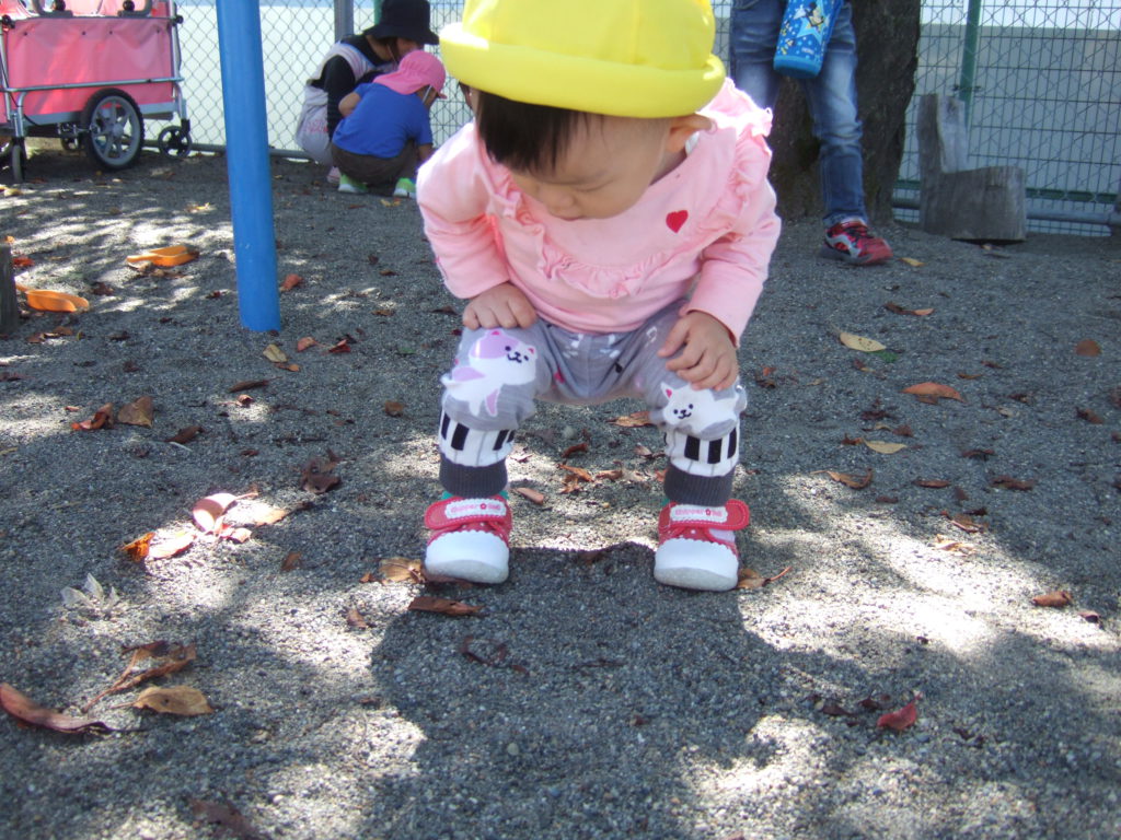 最初は葉っぱを拾っていたのですが、じーっと地面を見つめているお友達。その視線の先を見てみると、、、