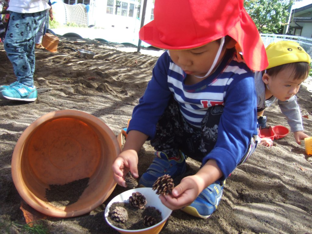 「まつぼっくりあったよ」と2歳児のお友達が見せてくれました。