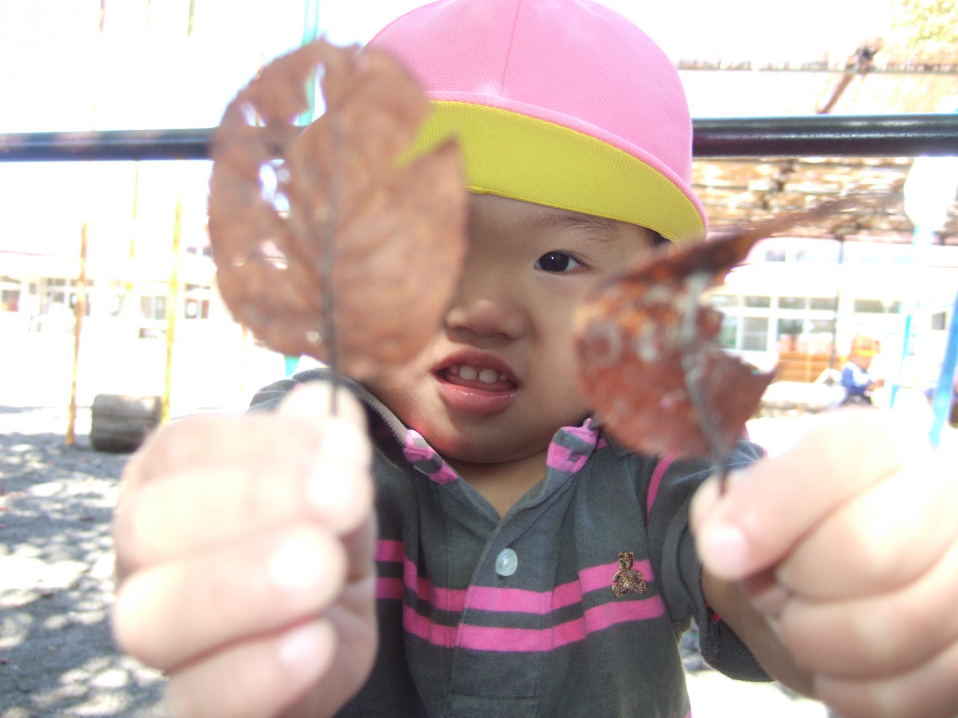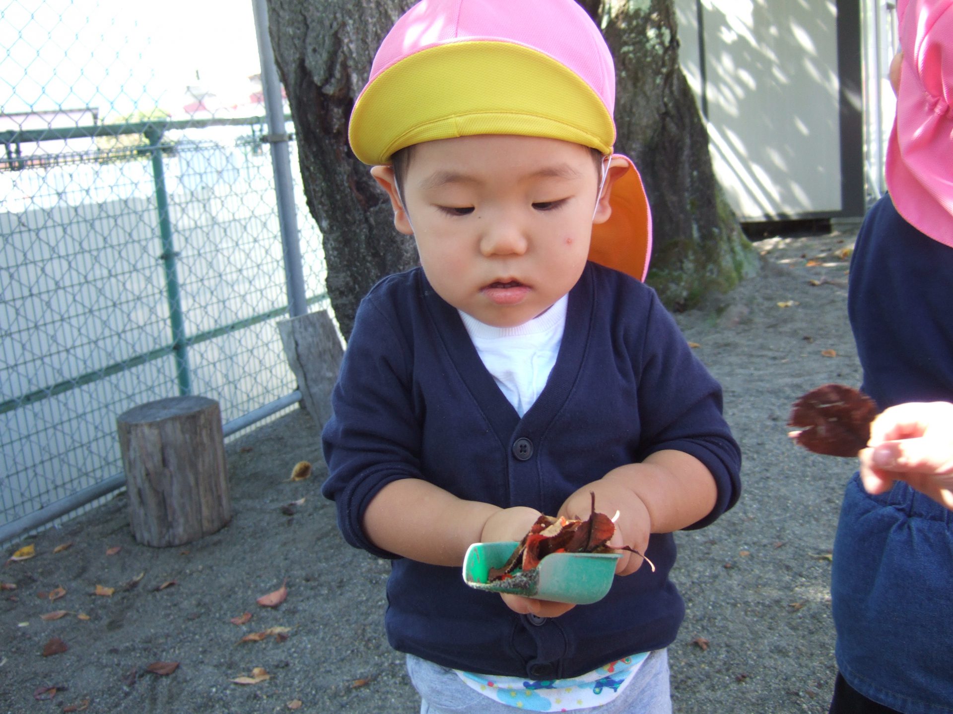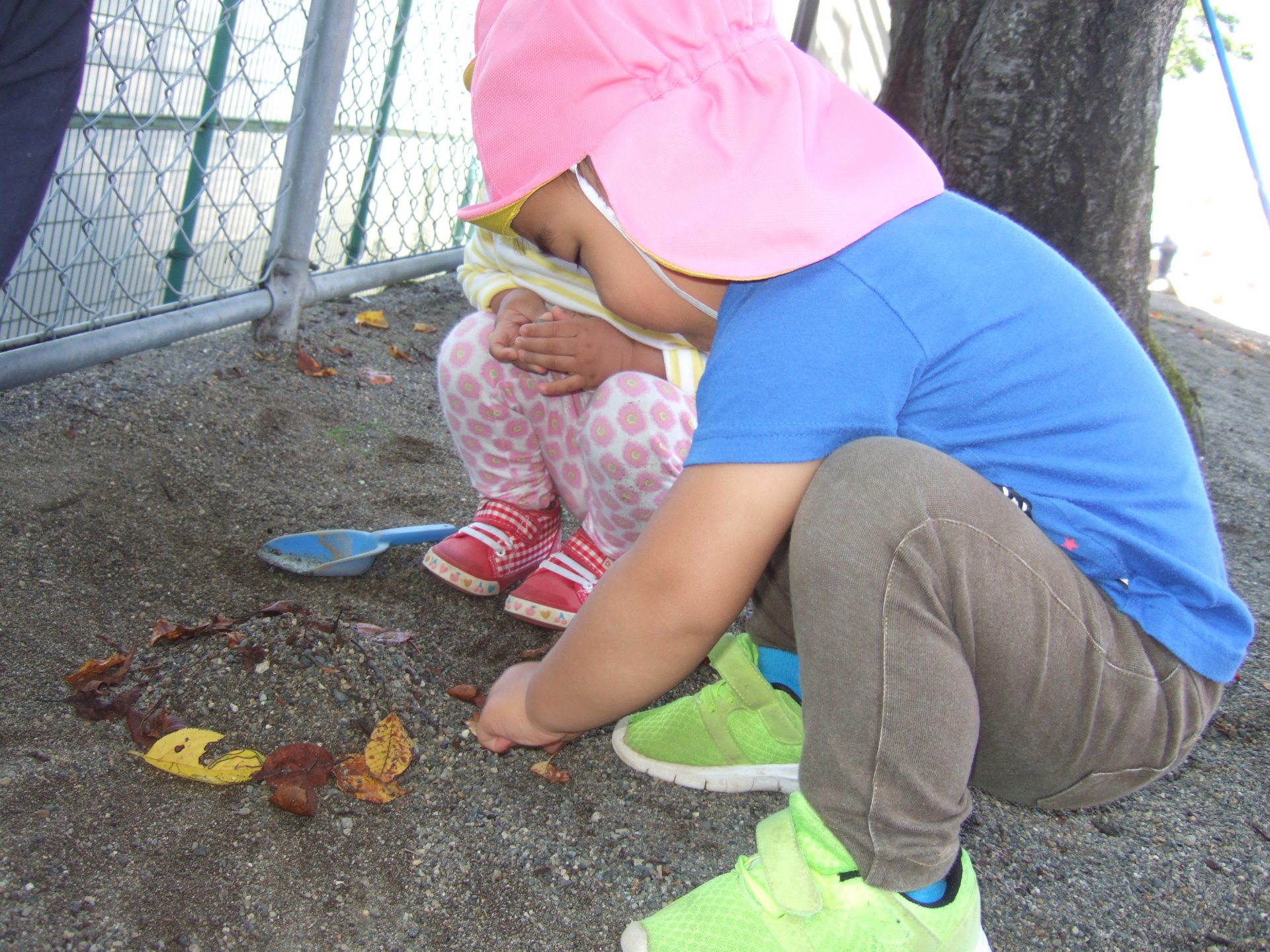 葉っぱを集めていたお友達も、気づけばこんなにたくさんスコップに乗せていました!