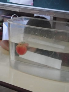 ・夏の野菜は水に浮くのと、沈むのがあるんだ。スイカが浮いてびっくり!