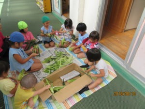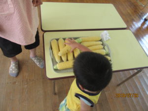 おやつのトウモロコシの皮むきをみんなでしました。