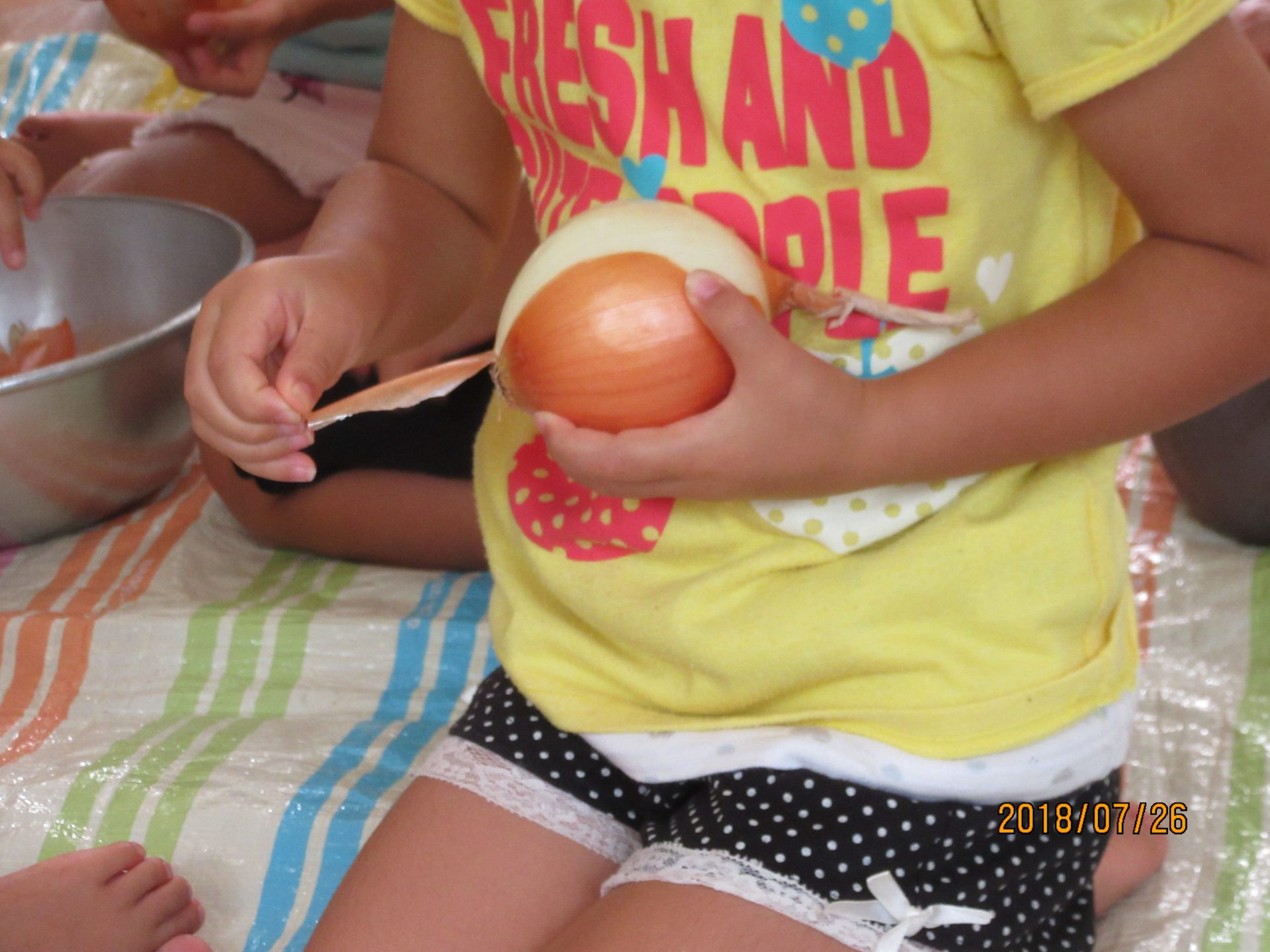 年少、年中さんは、玉ねぎの皮むき。目が痛いよ!玉ねぎも保育園で作りました。