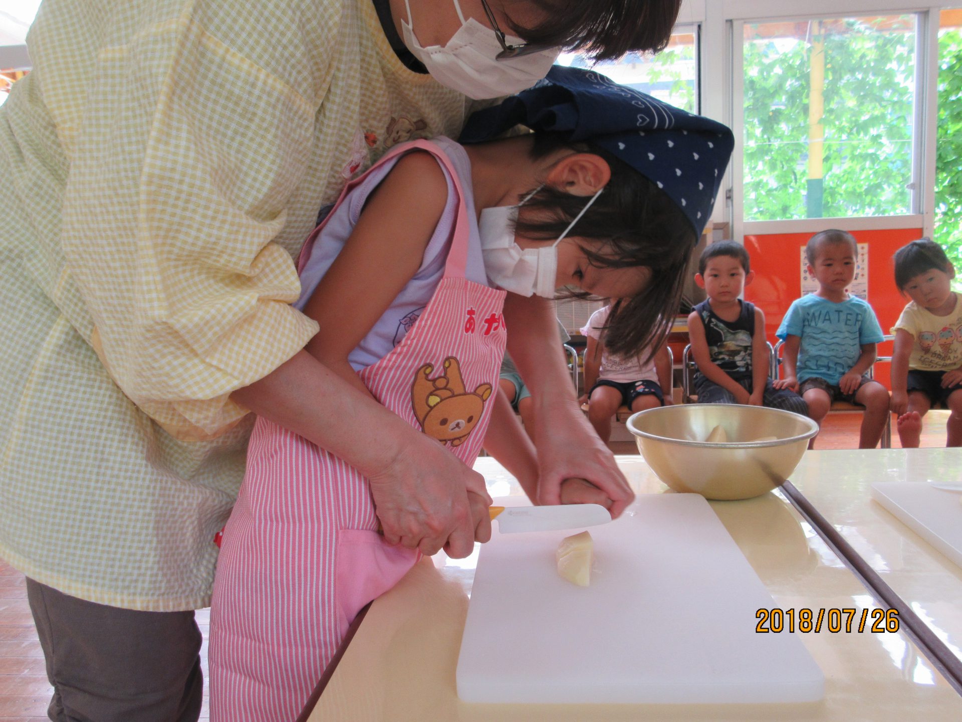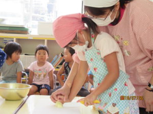 年長さんが夏野菜カレーのジャガイモ切りに挑戦。とても真剣な表情。