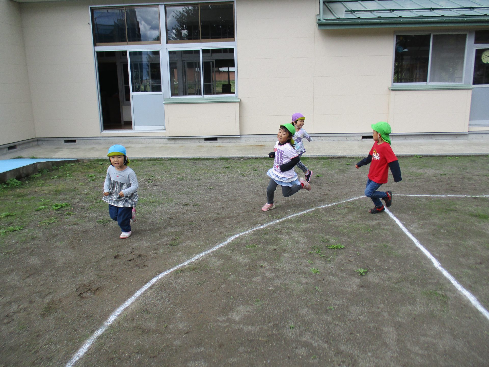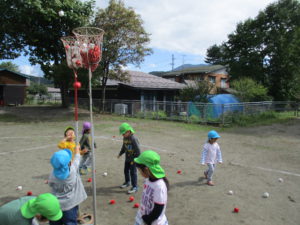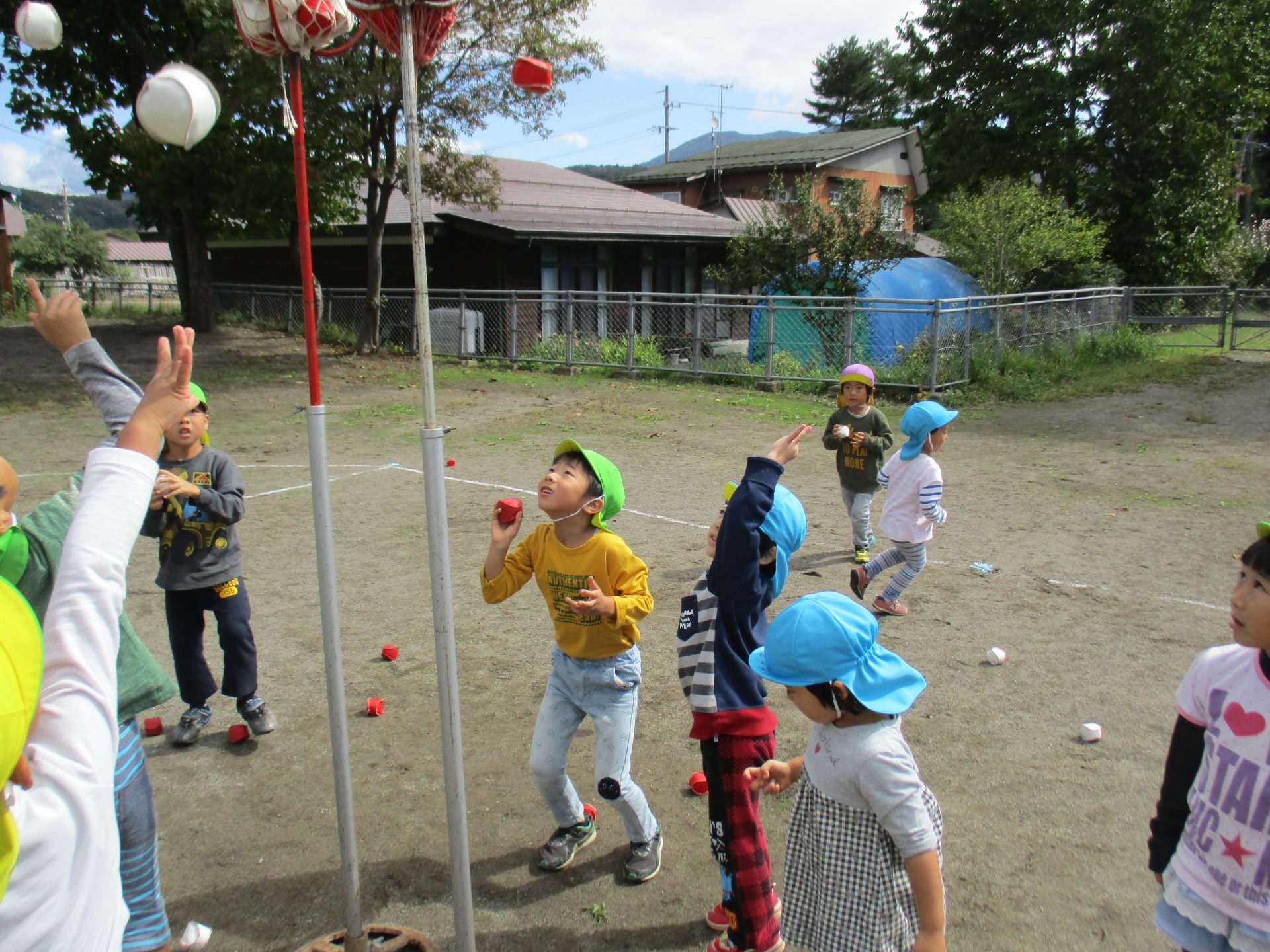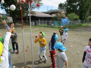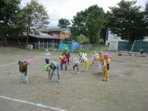 運動会が終わってからも活動を終わらせることなく、その後も子ども達の気持ちを大切に受け止めながら運動会ごっことして継続した活動にしていきたいと思います。その中で、年上の友達の姿を見て、やってみたい!という意欲に繋がったり、年下の友達に教えてあげたり思いやりの気持ちを育めるようにしてきたいと思います。